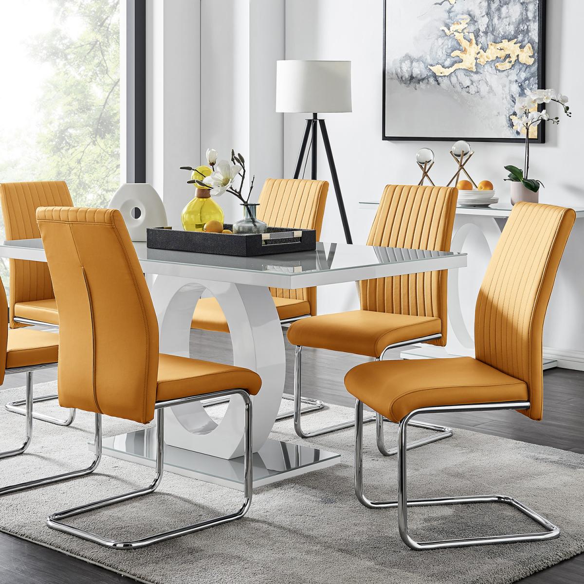 The Giovani table is arguably the most striking and artistic in our collection of bespoke high gloss tables. The beautifully designed Giovani will be the centrepiece of any modern home, combining not just design and function, but also affordability! The two-tone effect, along with the crisp clean lines, really does give it that modern wow factor. The Giovani has a 160cmx90cm table top made from black tempered glass, is easy to maintain and offers plenty of room for dining with guests and seats up to 6. The gorgeous rectangular glass table top, silhouetted by the rectangular base, combine beautifully to create a symmetrical centrepiece. Pair it with our Lorenzo chairs for a complete look. Featuring on-trend home cantilevered legs and supportive seat pads, these are eye-catching chairs, that don't compromise on comfort. The Lorenzo chairs are made from high quality, soft-touch faux leather and are ergonomically designed for maximum comfort and support. Featuring a deep foam seat cushion these chairs are a delight to sit on and the plastic feet protect the floor from any damage! Why not complete the look We now have matching coffee, side and console tables to match your dining set!