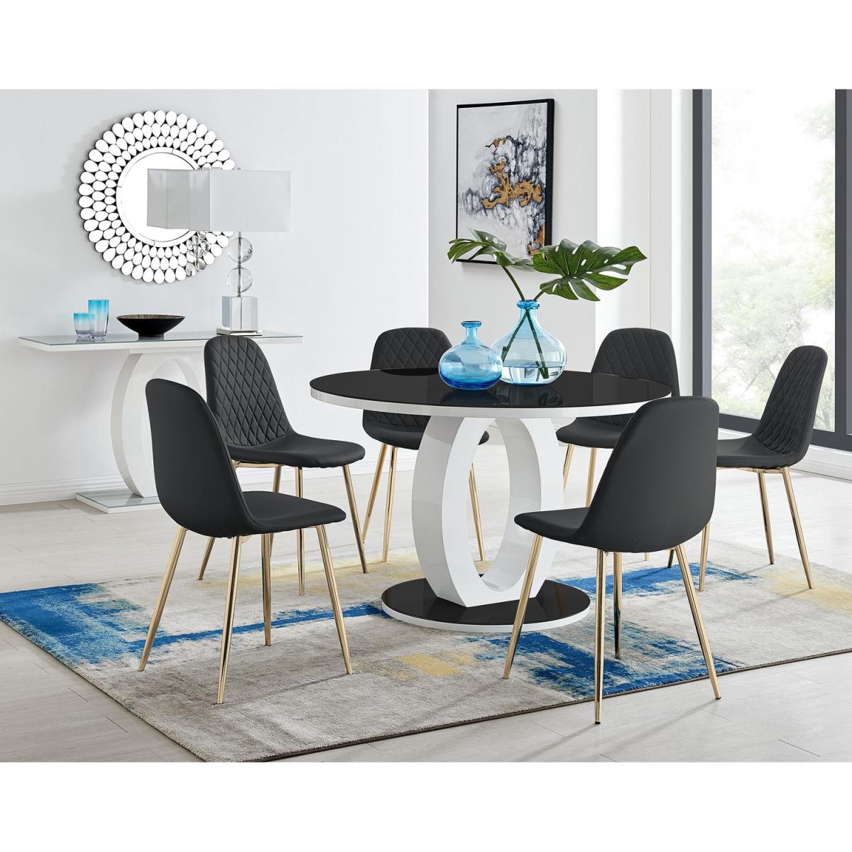 The Giovani round dining table is arguably the most striking and artistic in our collection of bespoke high gloss tables. The beautifully designed Giovani will be the centrepiece of any modern home, combining not just design and function, but also affordability! The two-tone effect, along with the crisp clean lines, really does give it that modern wow factor. The Giovani has a 120x120cm table top made from black tempered glass, is easy to maintain and offers plenty of room for dining with guests! The gorgeous round glass table top, silhouetted by the circular base, combine beautifully to create a symmetrical centrepiece built and styled for the modern home. Pair with our beautiful Corona chairs to complete the look! With a perfect balance of pattern and texture, the new Corona Chair is a statement piece ready for the modern dining space. The trendy gold or silver chrome legs are all the rage and offer a perfect way to add an accent of lustre to your home. The Scandi-style faux leather seat with diamond pattern stitching is a unique take on a classic design offering comfort and durability for everyday use.