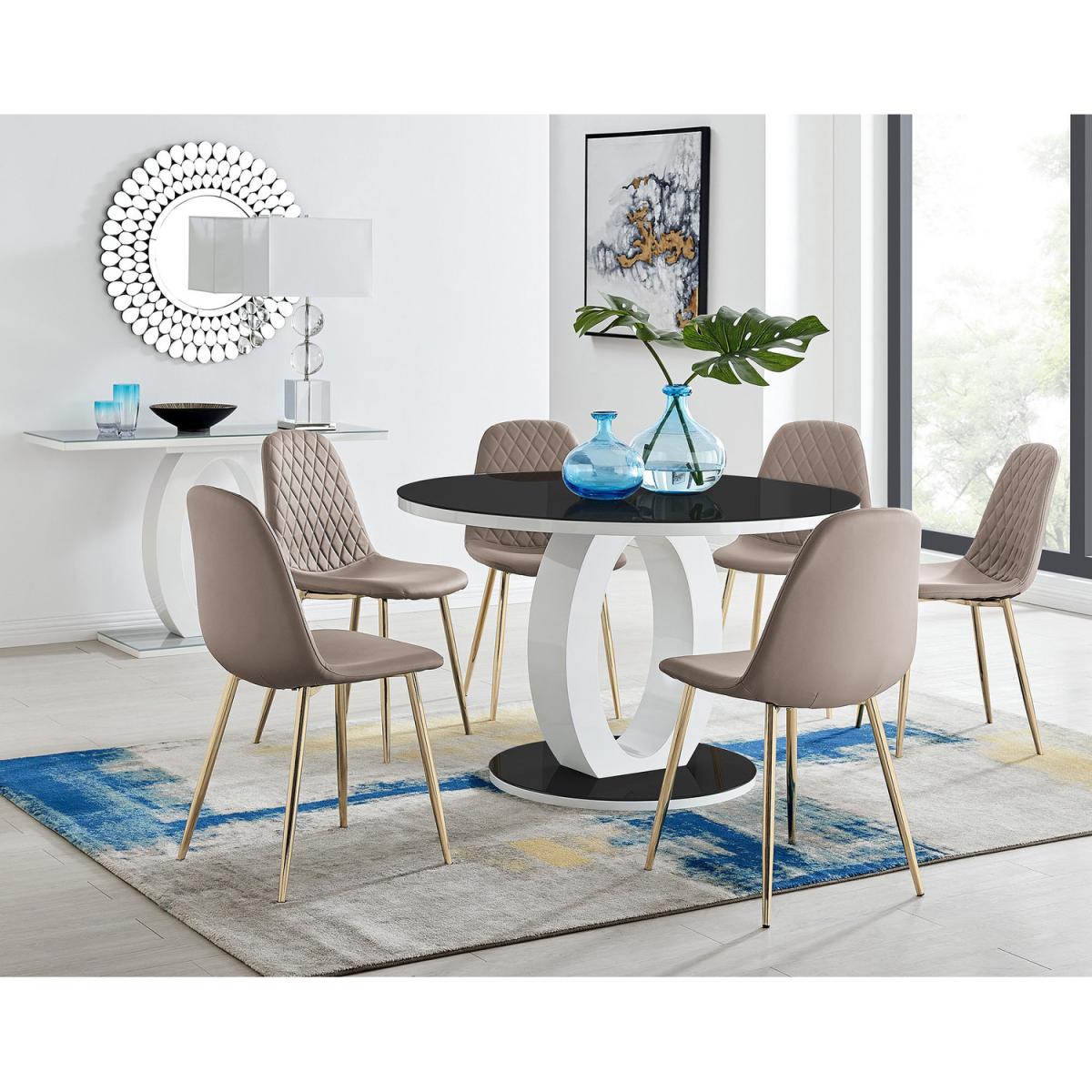The Giovani round dining table is arguably the most striking and artistic in our collection of bespoke high gloss tables. The beautifully designed Giovani will be the centrepiece of any modern home, combining not just design and function, but also affordability! The two-tone effect, along with the crisp clean lines, really does give it that modern wow factor. The Giovani has a 120x120cm table top made from black tempered glass, is easy to maintain and offers plenty of room for dining with guests! The gorgeous round glass table top, silhouetted by the circular base, combine beautifully to create a symmetrical centrepiece built and styled for the modern home. Pair with our beautiful Corona chairs to complete the look! With a perfect balance of pattern and texture, the new Corona Chair is a statement piece ready for the modern dining space. The trendy gold or silver chrome legs are all the rage and offer a perfect way to add an accent of lustre to your home. The Scandi-style faux leather seat with diamond pattern stitching is a unique take on a classic design offering comfort and durability for everyday use.