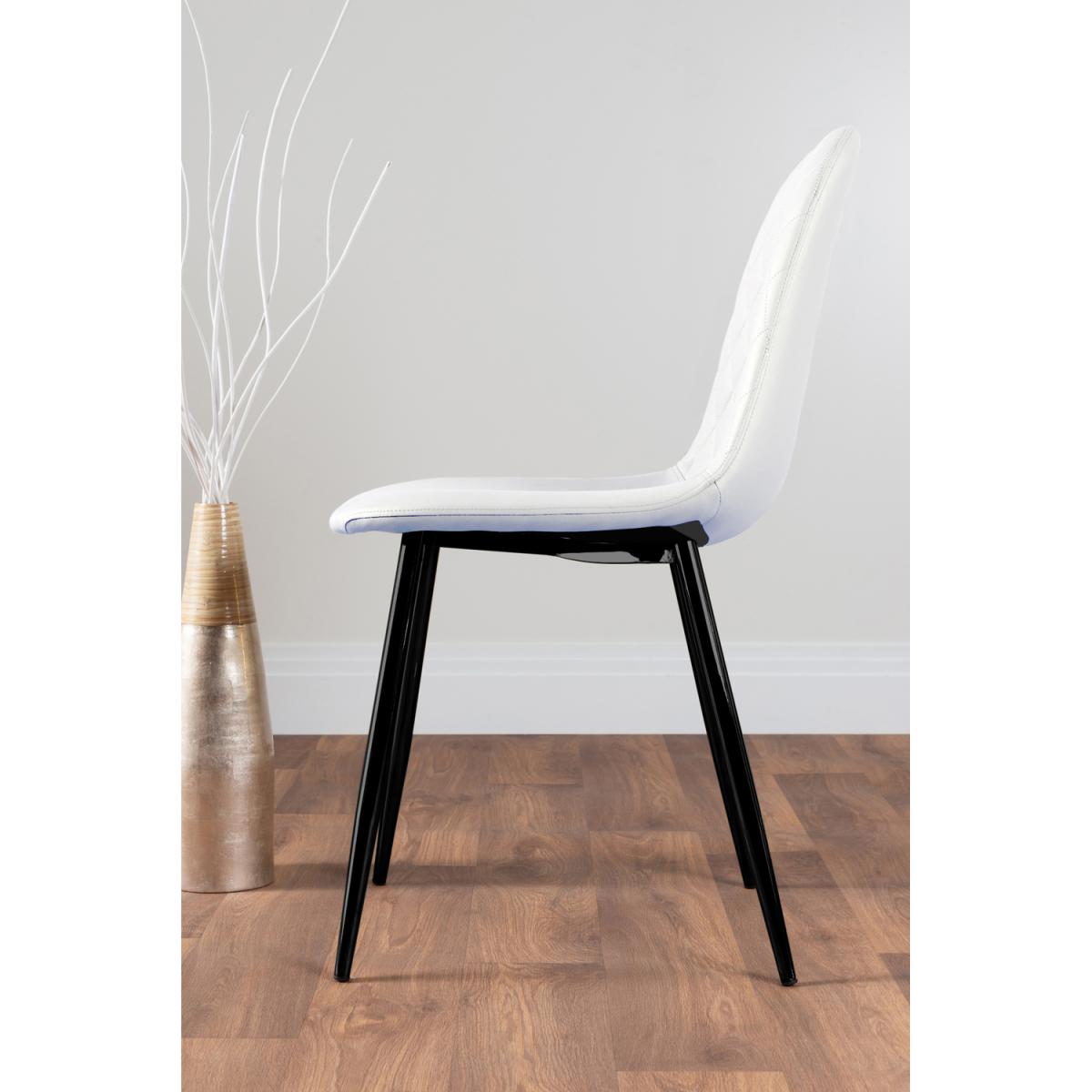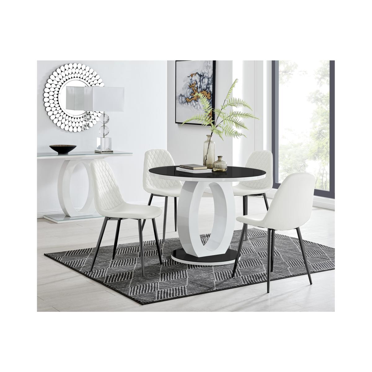 The Giovani table is arguably the most striking and artistic in our range of bespoke high gloss tables. The beautifully designed Giovani will be the centrepiece of any modern home, combining not just design and function, but also affordability! The two-tone effect, along with the crisp clean lines, really does give it that modern wow factor. The Giovani has a 100cmx100cm table top made from black tempered glass, is easy to maintain and offers plenty of room for dining with guests and seats up to 4. The gorgeous round glass table top, silhouetted by the circular base, combine beautifully to create a symmetrical centrepiece. Styled with our statement Corona dining chairs, this set is a perfect balance of pattern and texture. The sleek black powder coated legs of the Corona chairs are a great way to add a touch of minimalist style to your home. The Scandi-style faux leather seat with diamond pattern stitching is a unique take on a classic design offering comfort and durability for everyday use.