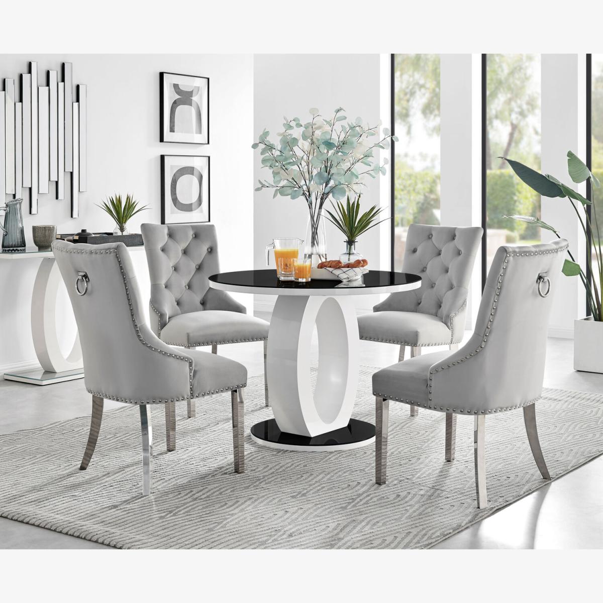 Need a table that'll dazzle your guests without costing the Earth Look no further than the Giovani high gloss and glass 100cm round dining table. It's elegant, exciting and economic. Your guests will envy you. Your bank account will thank you. Your friends and family will fall in love when they see your Giovani table. Its crisp clean lines and two-tone effect has such a wow factor that they might even think they've stepped into a celebrity home. They'll envy your starry table. But the jealousy won't stop there. Once your guests get up close and sit at your table they'll be even more impressed. Their eyes will be drawn to its stunning glass surface and chic circular base like magnets. And they'll be amazed by how much room there is at the table, with the 100cmx100cm top making the most of the space in your dining area. Style rarely comes cheap, with many low-cost tables sacrificing substance to keep the price down. But there's nothing shabby about the Giovani table. Its black tempered glass top and sturdy framework are tough enough to cope with the rigour placed upon it by even the most excitable guests. The Belgravia knocker chair is the ultimate in dining chair opulence with its scoop back design that allows you and your guests to lean back and feel supported by the wrap-around arms. Stylish Chesterfield-inspired button tufting and diamond stitching add to the modern chic look. The design gives us straight lines and soft padded curves contemporary and comfortable. The thick filled seat cushion is supportive and comfortable and is complemented by the silk velvet fabric. These ultra-modern chairs have subtle chrome button detailing along the trim of the seat and around the back of the chair which pairs beautifully with the chrome legs and knocker. These little details keep this chair light, bright and elegant. The highlight of the Belgravia chair is the chrome knocker on the back of the chair which is a popular feature for both modern and traditional dining rooms. Anyone for a lovely dinner party or some cocktails! We're in love!