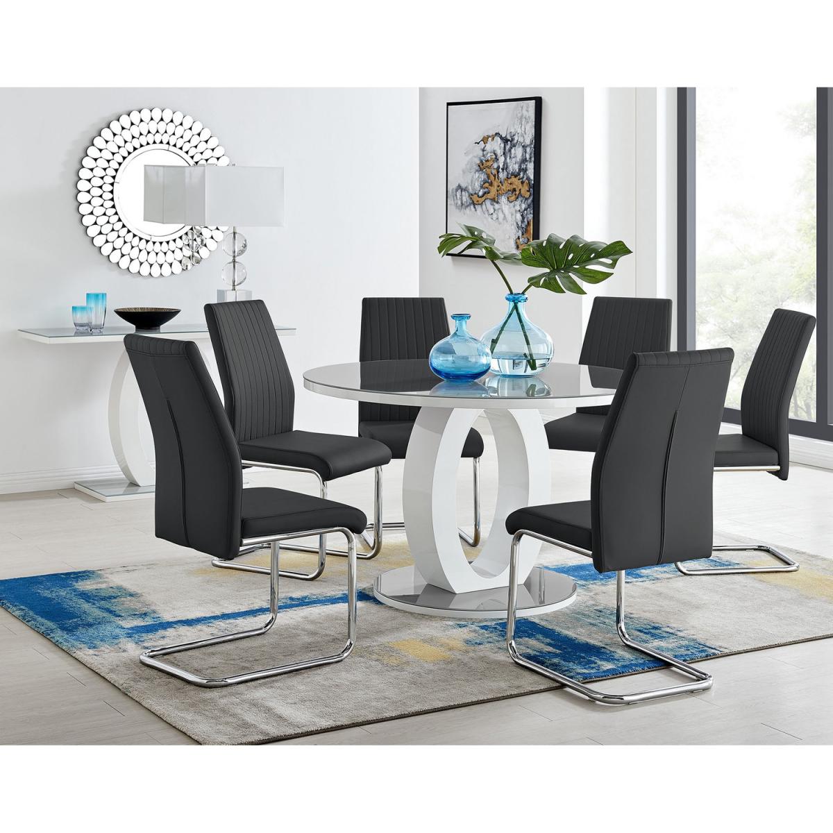 The Giovani table is arguably the most striking and artistic in our range of bespoke high gloss tables. The beautifully designed Giovani will be the centrepiece of any modern home, combining not just design and function, but also affordability! The two-tone effect, along with the crisp clean lines, really does give it that modern wow factor. The Giovani has a 120cmx120cm table top made from grey tempered glass, is easy to maintain and offers plenty of room for dining with guests and seats up to 6. The gorgeous round glass table top, silhouetted by the circular base, combine beautifully to create a symmetrical centrepiece. Pair the Giovani table with our Lorenzo chairs for the complete look. Featuring on trend chrome cantilevered legs and supportive seat pads, these are eye catching chairs, that don't compromise on comfort. With such an appealing design and price tag we just love it and are sure that you will too!