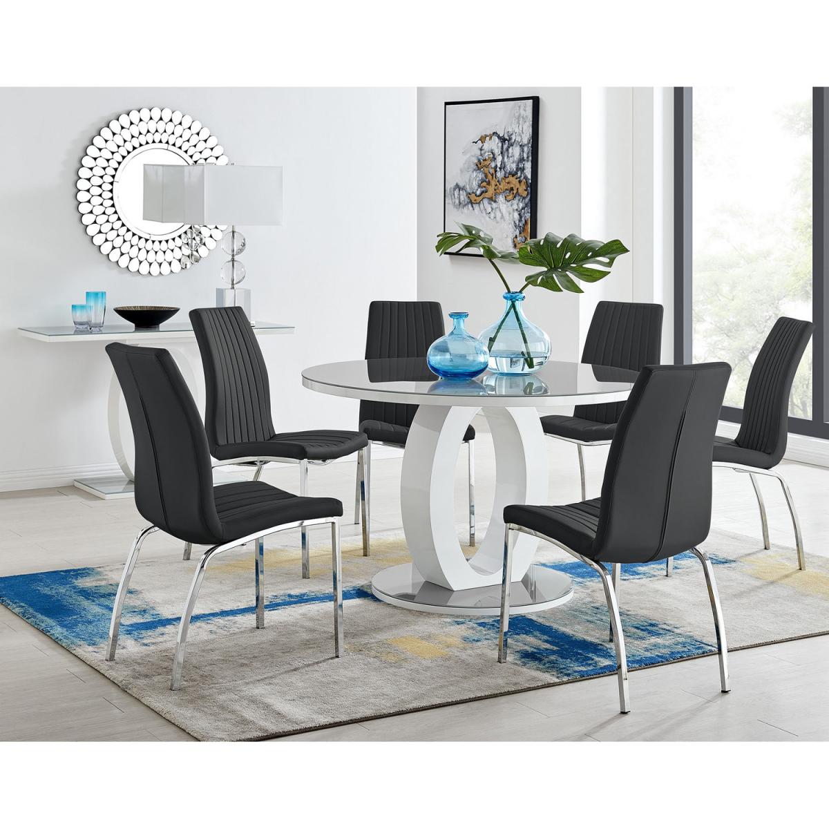 The Giovani table is arguably the most striking and artistic in our range of bespoke high gloss tables. The beautifully designed Giovani will be the centrepiece of any modern home, combining not just design and function, but also affordability! The two-tone effect, along with the crisp clean lines, really does give it that modern wow factor. The Giovani has a 120cmx120cm table top made from grey tempered glass, is easy to maintain and offers plenty of room for dining with guests and seats up to 6. The gorgeous round glass table top, silhouetted by the circular base, combine beautifully to create a symmetrical centrepiece. Paired with our beautiful faux leather Isco chairs to complete the look! Clean lines combine with comfort and texture to make the Isco chair the ideal choice in understated style, the perfect partner for any design of table. The soft touch faux leather seat pads are inter-spaced with vertical stitching and are designed for comfort with the added bonus of looking great. Value for money with style combine to make an unbeatable package!