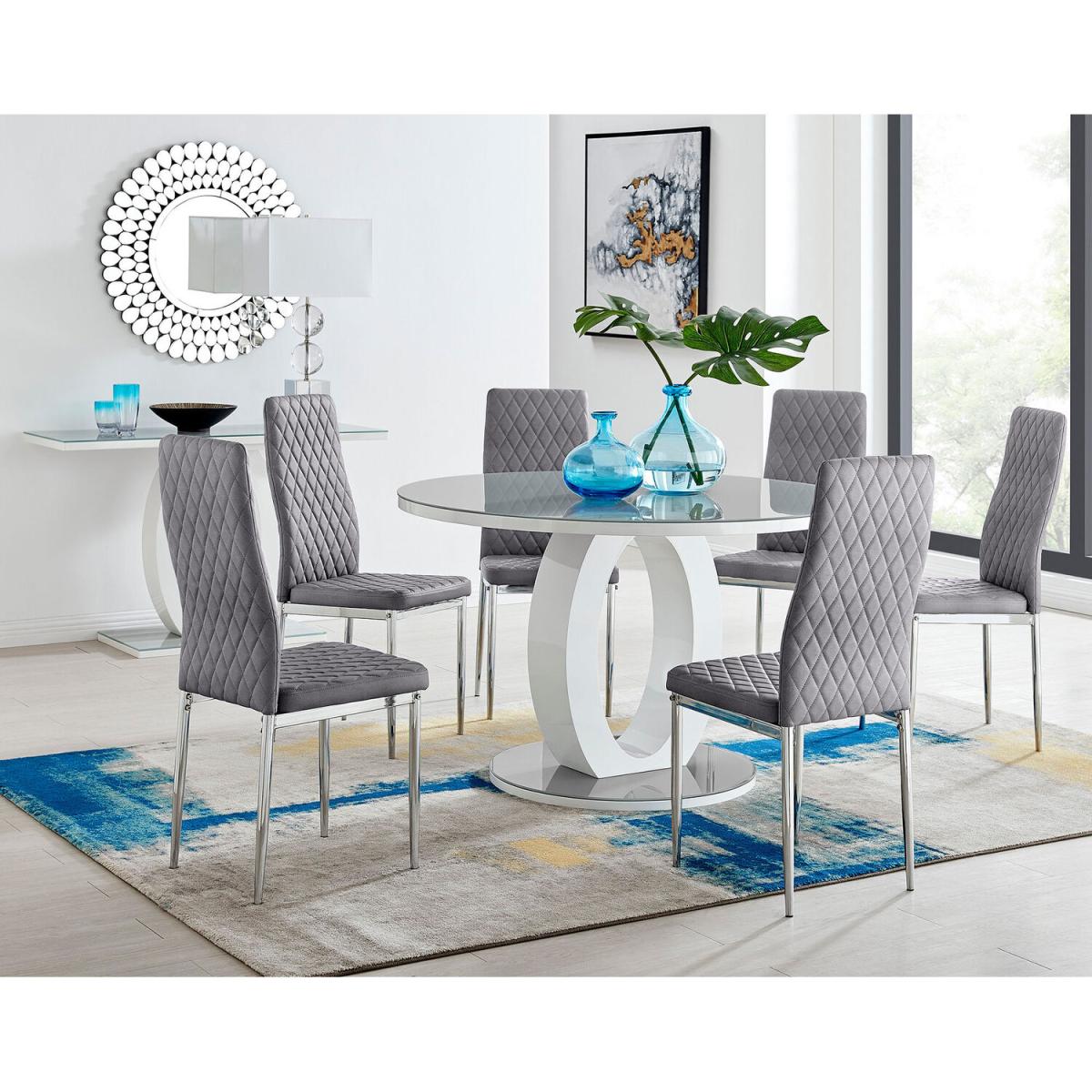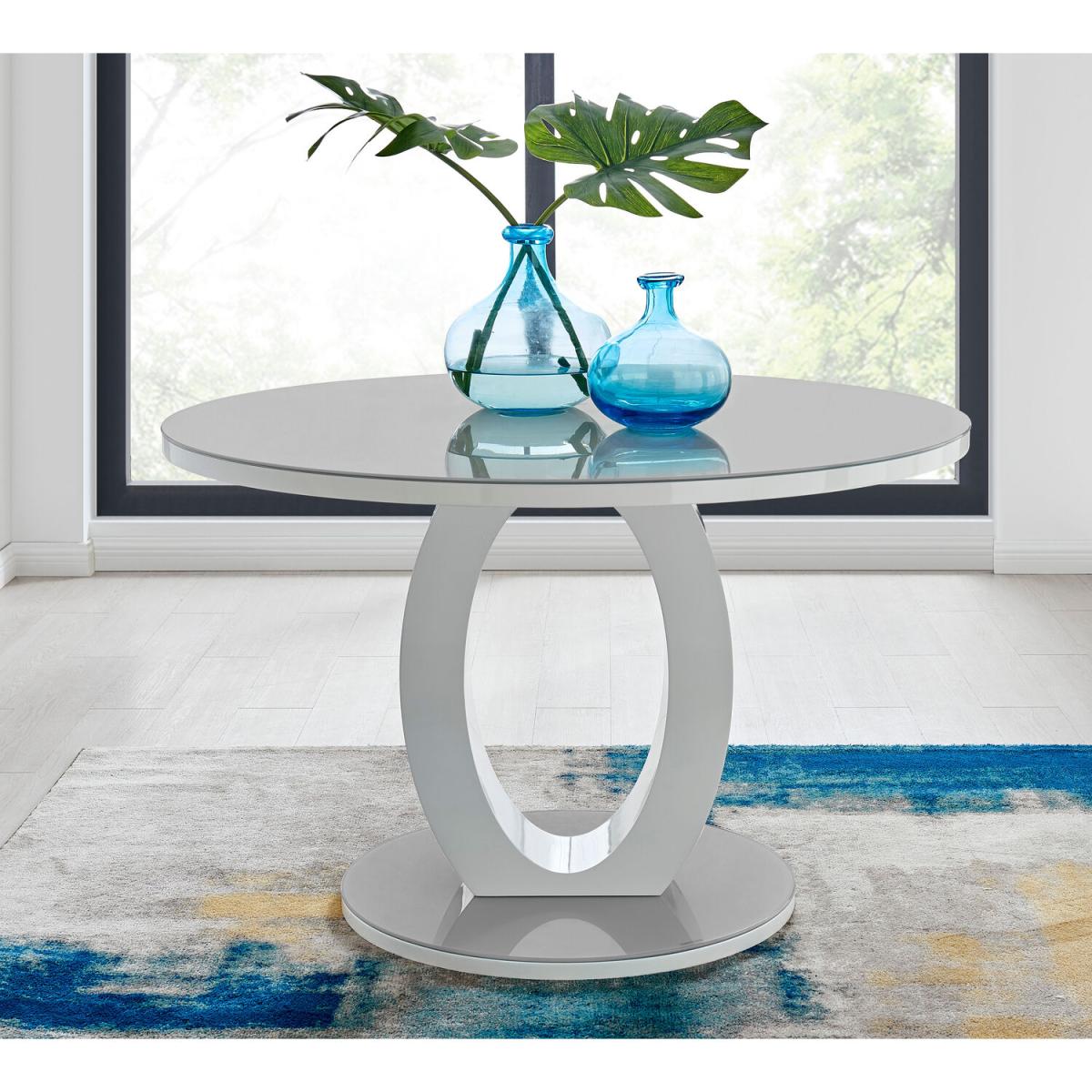 The Giovani round dining table is arguably the most striking and artistic in our range of bespoke high gloss tables. The beautifully designed Giovani will be the centrepiece of any modern home, combining not just design and function, but also affordability! The two-tone effect, along with the crisp clean lines, really does give it that modern wow factor. The Giovani has a 120x120cm table top made from grey tempered glass, is easy to maintain and offers plenty of room for dining with guests! The gorgeous round glass table top, silhouetted by the circular base, combine beautifully to create a symmetrical centrepiece built and styled for the modern home.