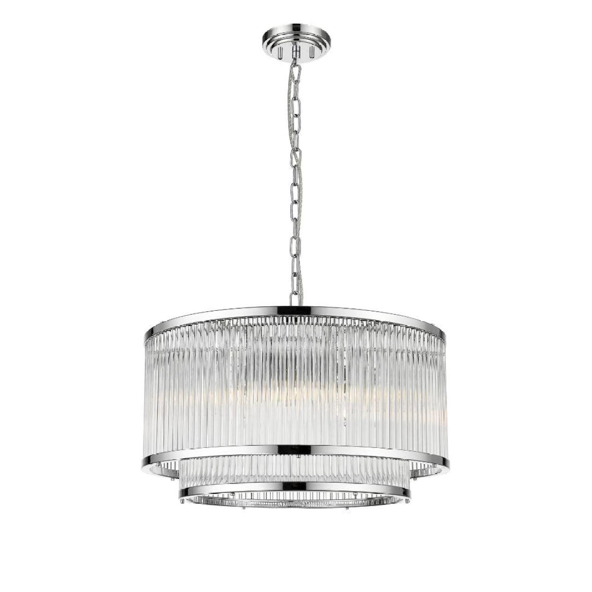 5-Light contemporary ceiling pendant featuring crystal shades and chrome finish. An exquisite blend of modern design and timeless elegance, the Giovanna 2-tier pendant exudes a luxurious vibe, adding a touch of glamour to your home. The two-tiered design adds depth and dimension, creating a captivating visual effect while casting a warm and inviting glow. Elevate the ambience of any room with this chic and functional masterpiece. 5-Light contemporary ceiling pendant featuring crystal shades and chrome finish. An exquisite blend of modern design and timeless elegance, the Giovanna 2-tier pendant exudes a luxurious vibe, adding a touch of glamour to your home. The two-tiered design adds depth and dimension, creating a captivating visual effect while casting a warm and inviting glow. Elevate the ambience of any room with this chic and functional masterpiece.