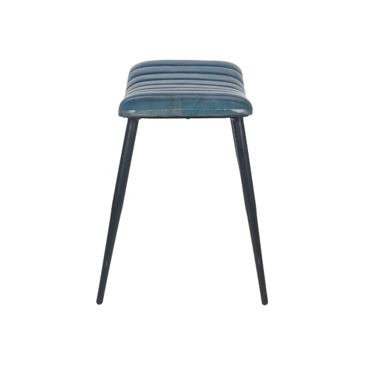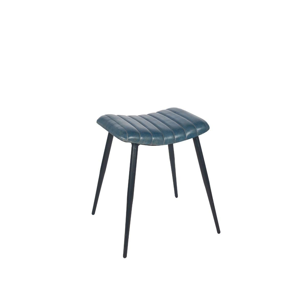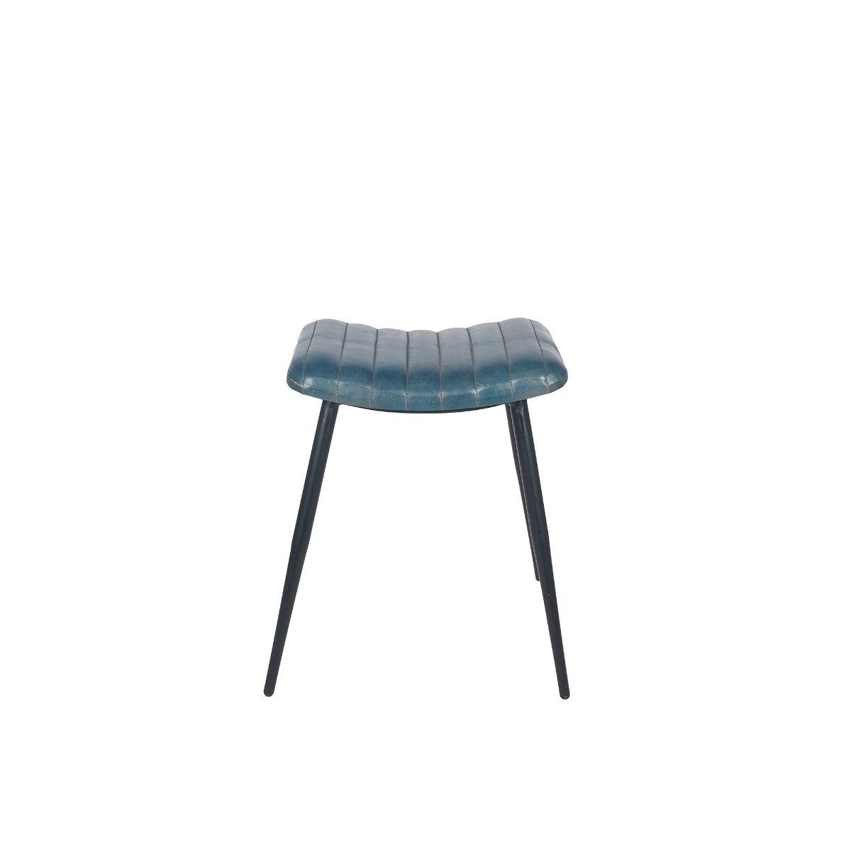 Blue Leather Stool with Black Legs. This beautiful leather stool is a great addition to any home. Perfect for adding an intriguing and space-saving stool for both traditional and modern homes. With gorgeous leather and iron legs, it is a fantastic purchase.