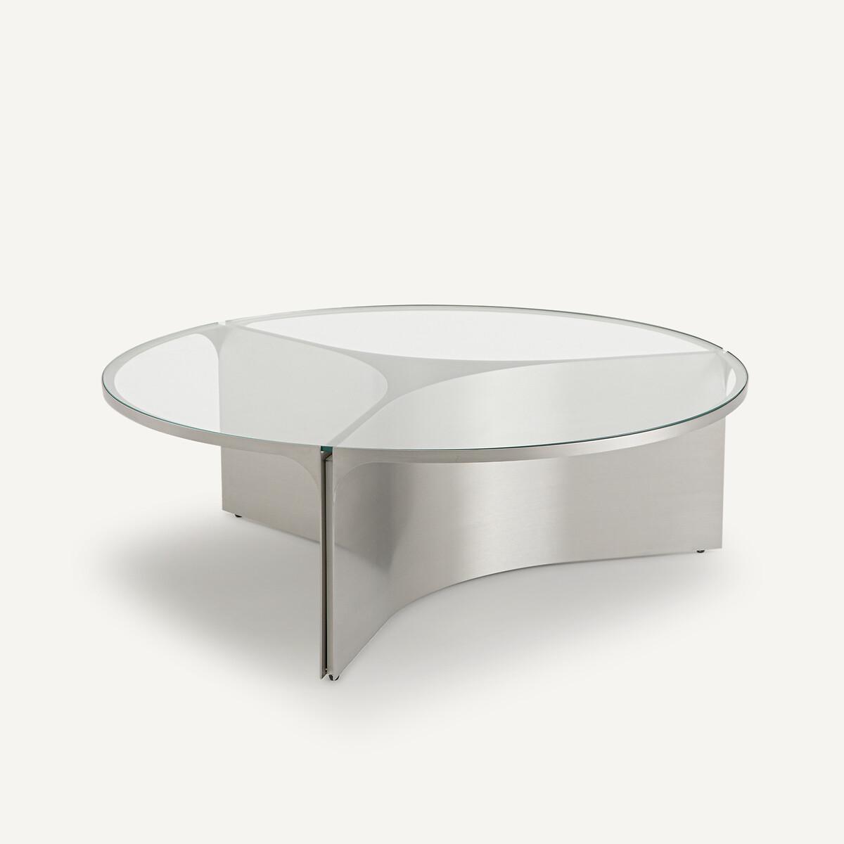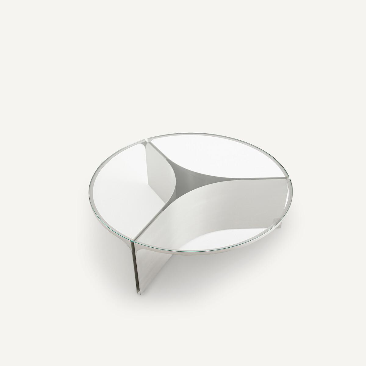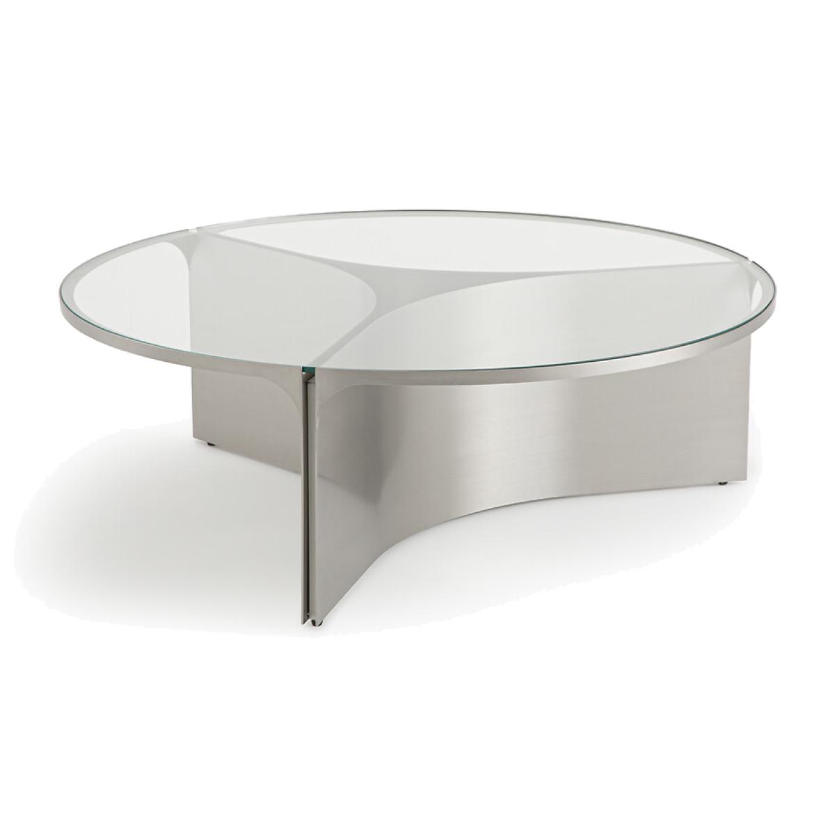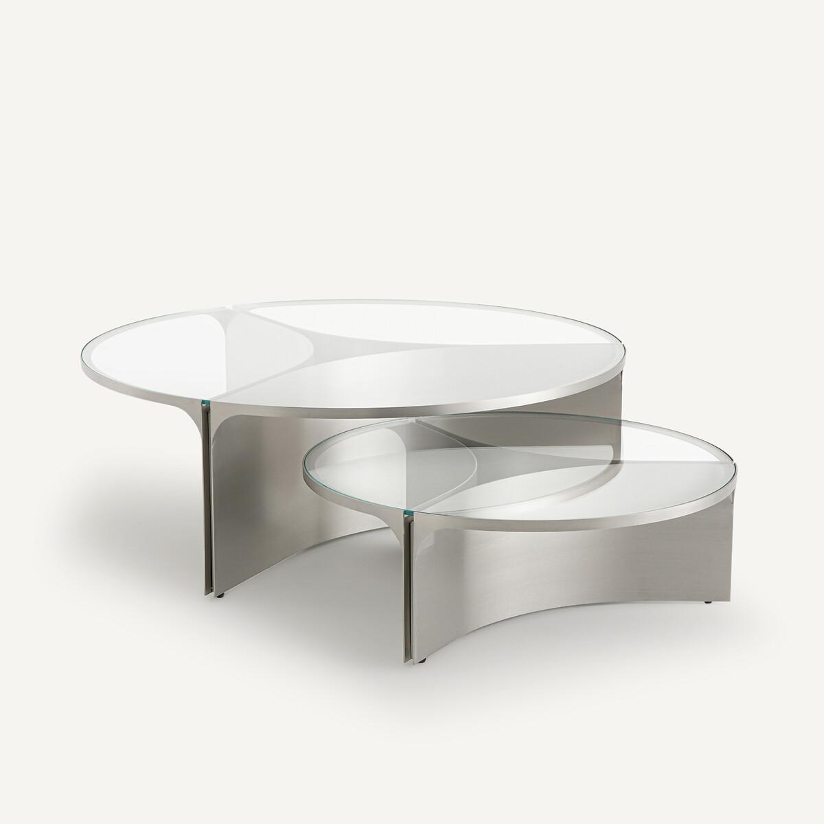 The Gia coffee table is inspired by sculptural design. The transparent top reveals the curved lines of the satin nickel base.