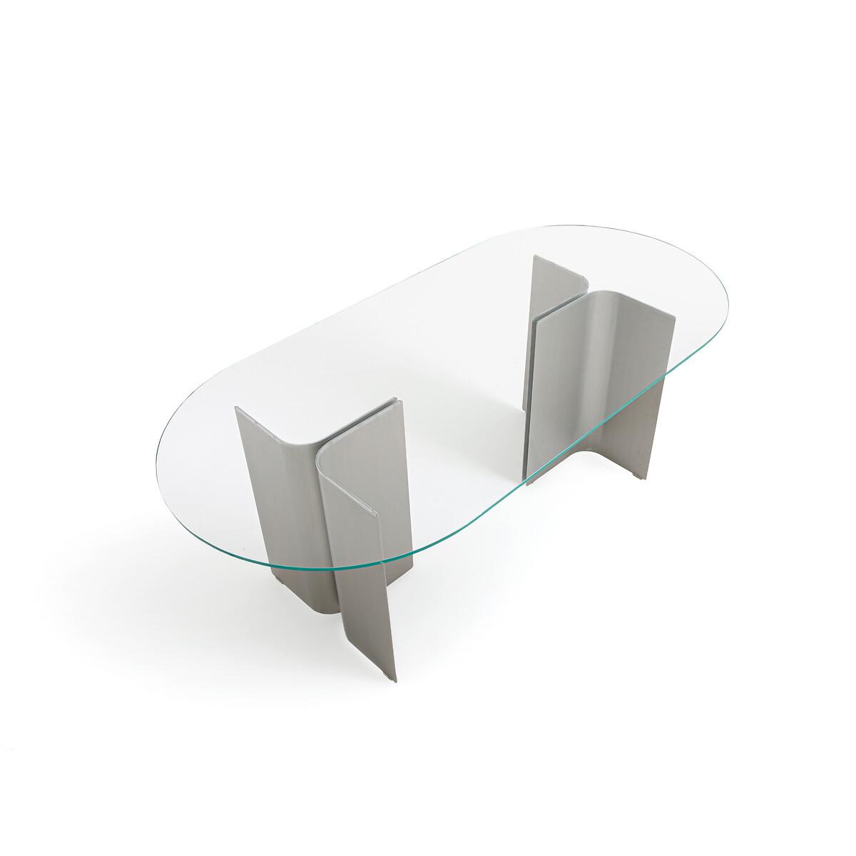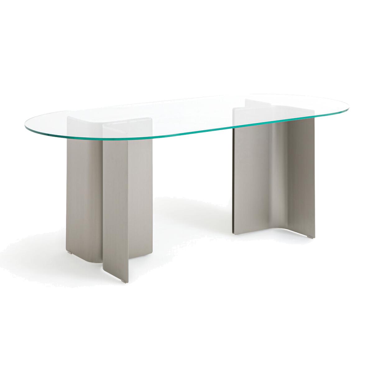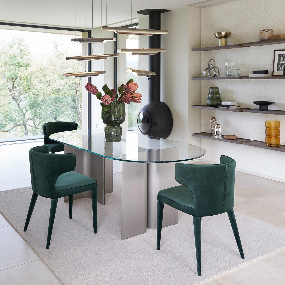 Design and sculpture characterise the Gira dining table. The transparent tempered glass top reveals the curved lines of the base.