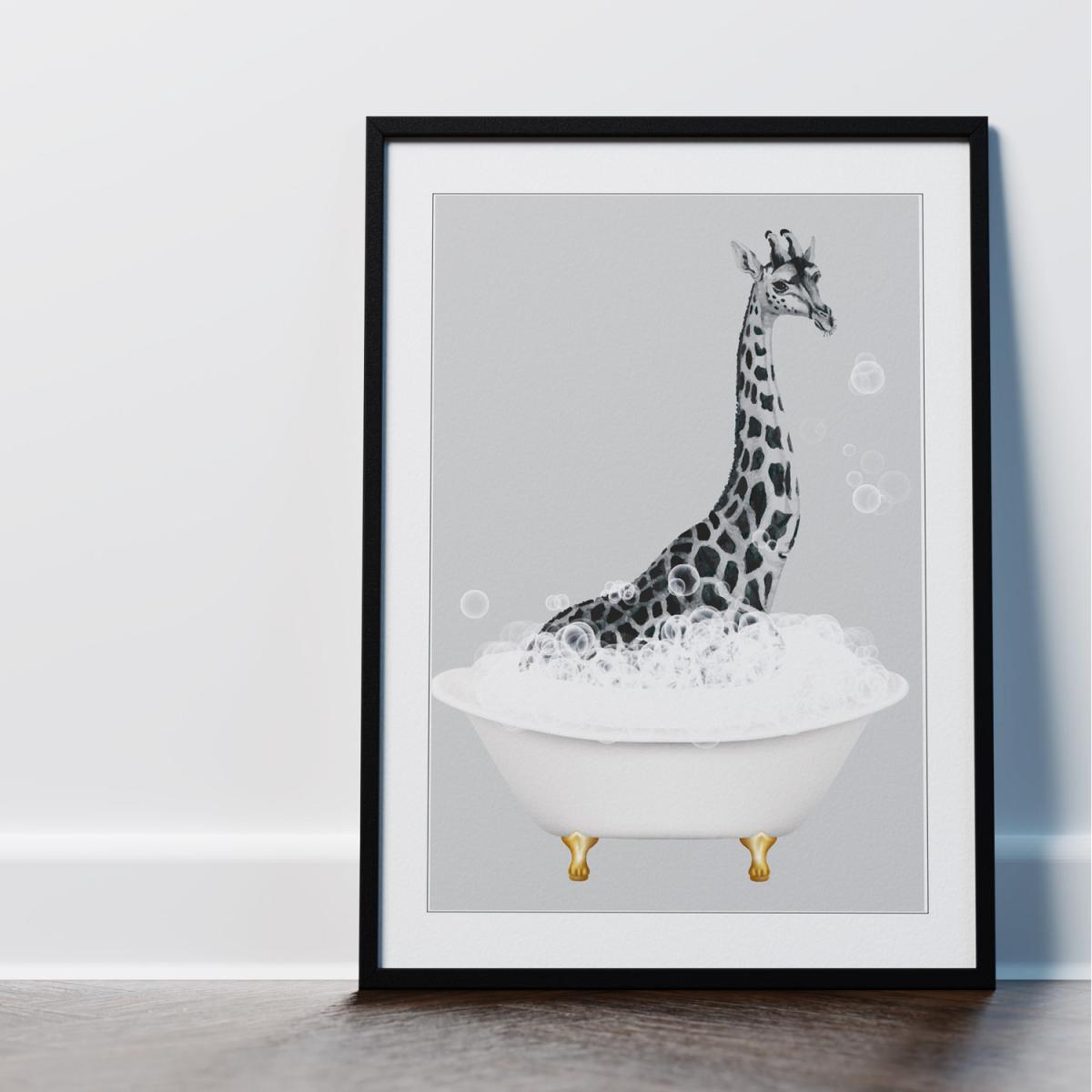 Giraffe in the Bath Framed Bathroom Wall Art Print - Black