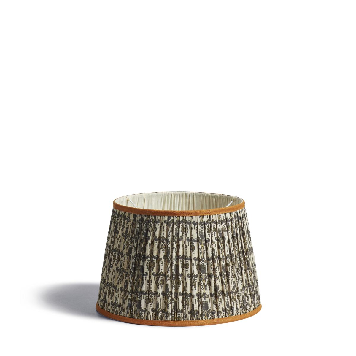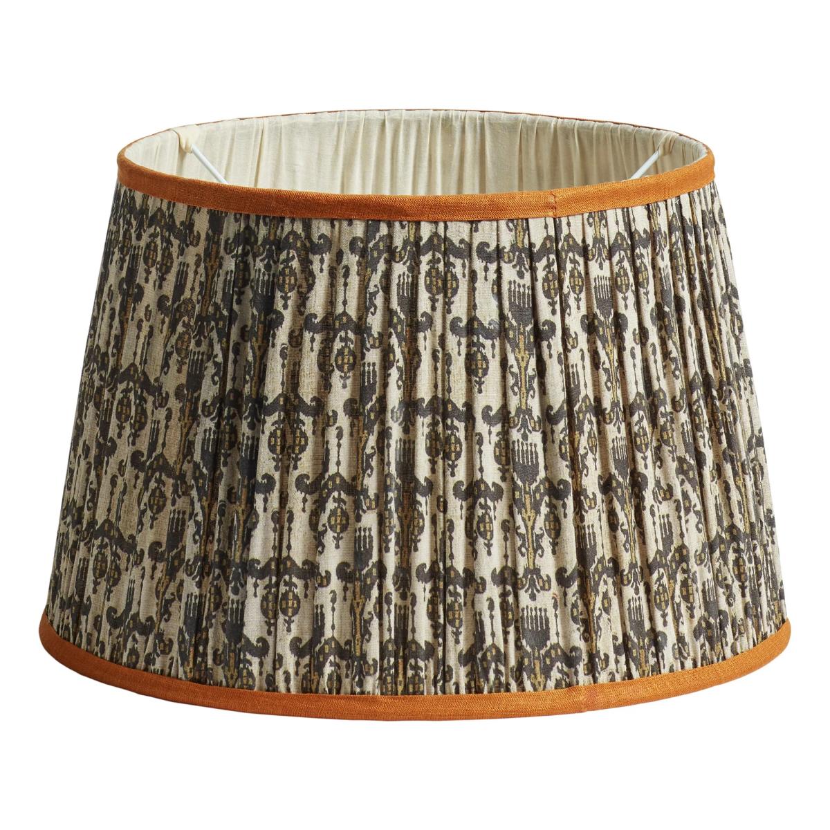 Our Girandole design originally decorated our cushion covers, so we thought we’d extend the range to our pretty pleated lampshades. The elegant pattern is hand screen-printed onto natural linen on a smaller scale and lined with cotton. The neutral backdrop allows the charcoal pattern to sing, complemented by the orange piping that lines its edges. This is the smaller of the two sizes.