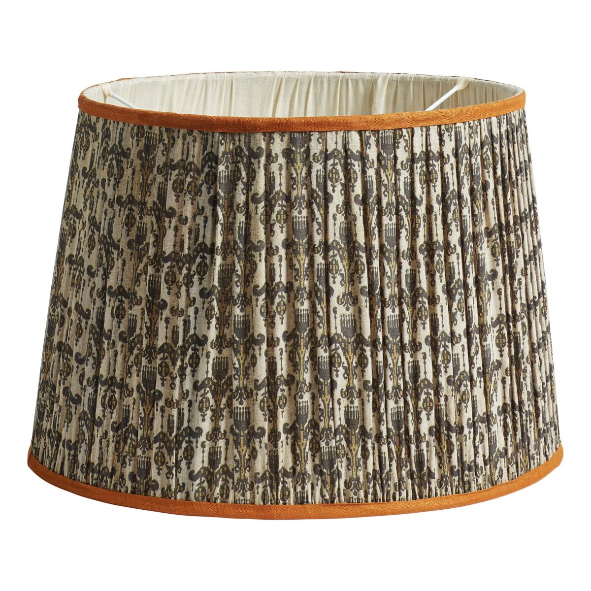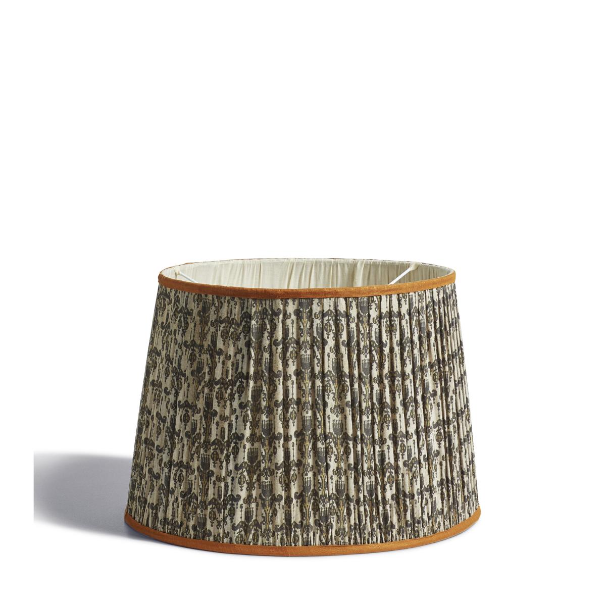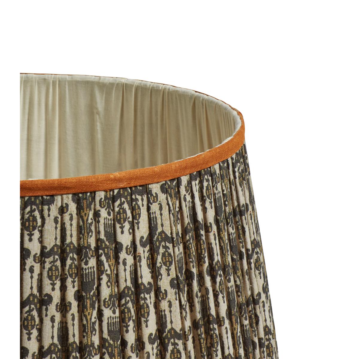 Our Girandole design originally decorated our cushion covers, so we thought we’d extend the range to our pretty pleated lampshades. The elegant pattern is hand screen-printed onto natural linen on a smaller scale and lined with cotton. The neutral backdrop allows the charcoal pattern to sing, complemented by the orange piping that lines its edges. This is the larger of the two sizes.