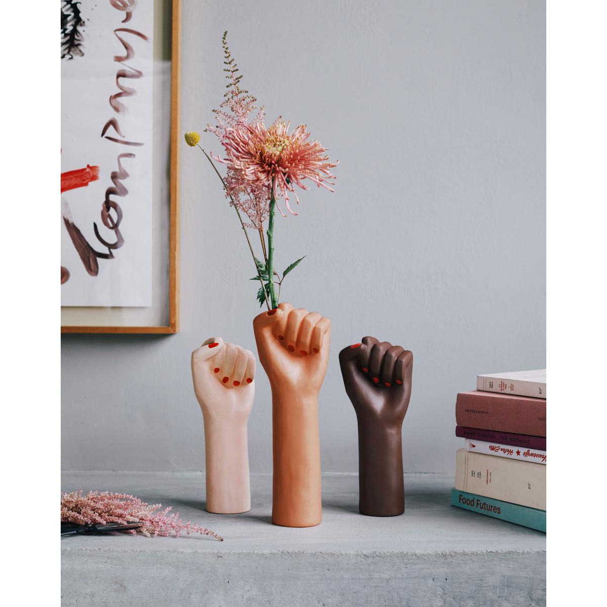 Engaged decor. New York designer Deva Pardue, a women's rights activist, has created a collection of quirky, funky vases, a symbol of Girl Power! These raised fists with their flamboyant red nails represent the struggle by women of all origins who advocate for gender equality and rights. 5% of sales are donated to For All Womankin: this public-interest organisation founded by Deva Pardue raises funds for non-profit organisations working to promote women's rights around the world. The raised fist, the emblem of protest iconography, is the distinctive sign chosen by Deva Pardue to embody her action. These vases are true sculptures in an arty style that has an extraordinary expressive force. These body fragments offer a surrealistic representation of the human body, reduced down to detail, detached from the figure from which they come. Evoking a human body by fragmentation also above all means evoking its missing part: these outstretched arms evoke all women, militant or anonymous, who act daily for greater openness, tolerance and respect. In addition to supporting a good cause, this eccentric, impertinent vase will become one of the key pieces of your decor.