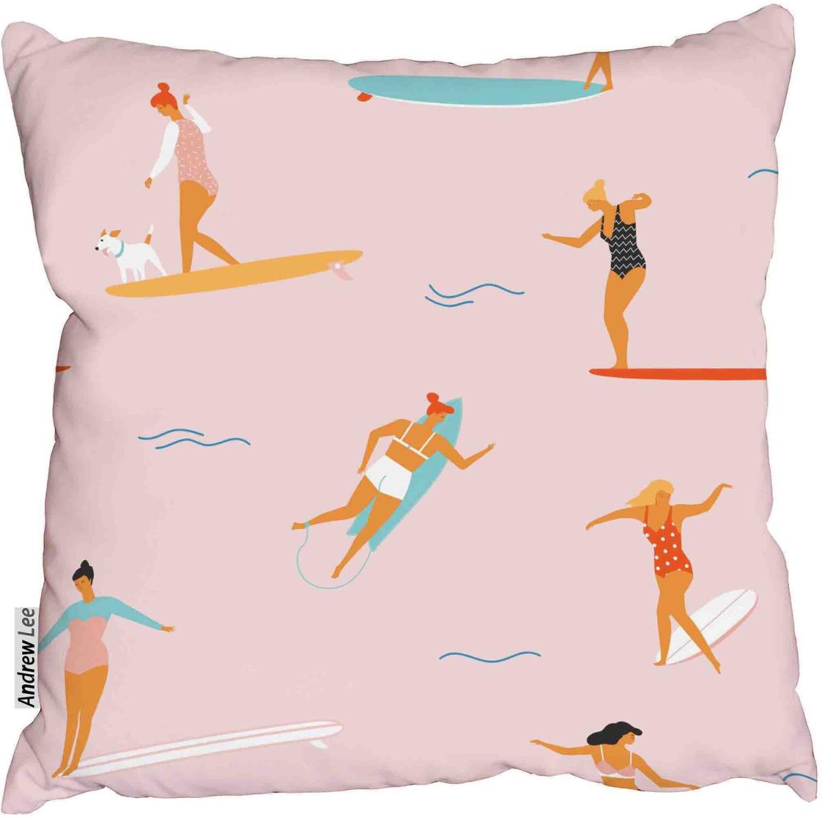 I love this girl surfer in bikini outdoor cushion for adding a playful, laid-back vibe to your outdoor space. Its bright pink colour and fun print work well in contemporary gardens or Mediterranean-inspired patios, injecting colour and personality. It’s perfect for casual seating areas, paired with neutral or pastel cushions to create a relaxed, inviting atmosphere. Practical styling tips include mixing it with other patterned cushions and keeping your outdoor furniture simple to make the cushion a statement piece. Since it's outdoor, make sure it's kept in a covered area or stored during harsh weather to preserve the print and fabric. Overall, it’s a great way to bring a splash of fun to your outdoor entertaining area.