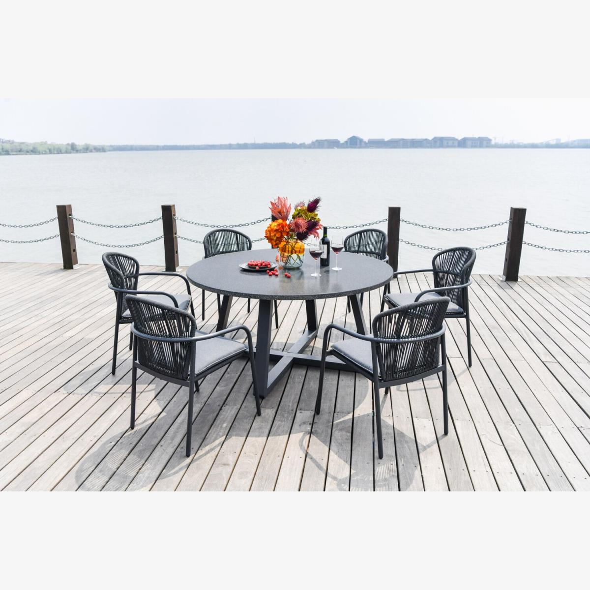 I really like this black Girona 7 piece dining set for its sleek, contemporary look that adds a sophisticated touch to various interiors. Its clean lines and dark finish make it versatile enough for modern, minimalist spaces, but it can also work well in industrial styles, especially when paired with metal or leather accents. Practical styling tips include softening the monochrome scheme with colourful tableware or textured textiles like placemats and throws to add warmth. It’s also ideal for outdoor use, as shown in the image, where it creates a chic alfresco dining area by the water. Just ensure the surface and seats are protected from harsh weather if used outside long-term.