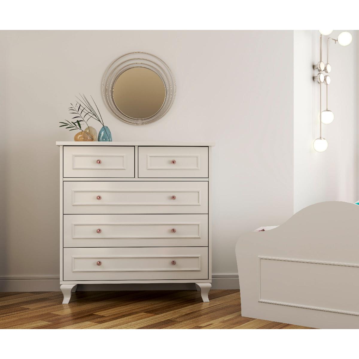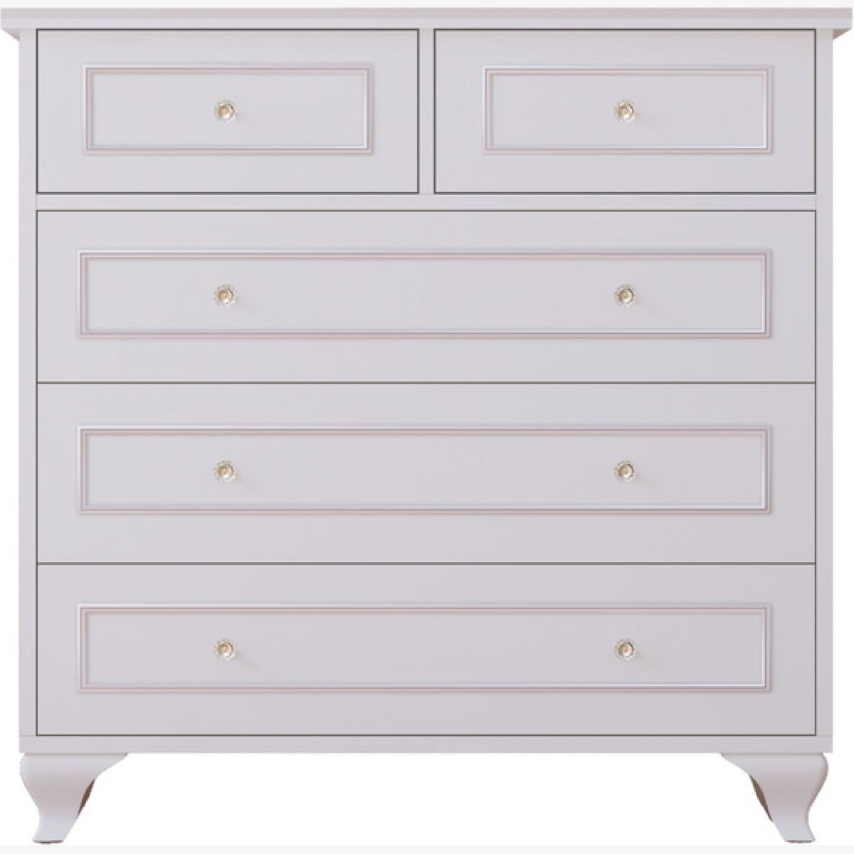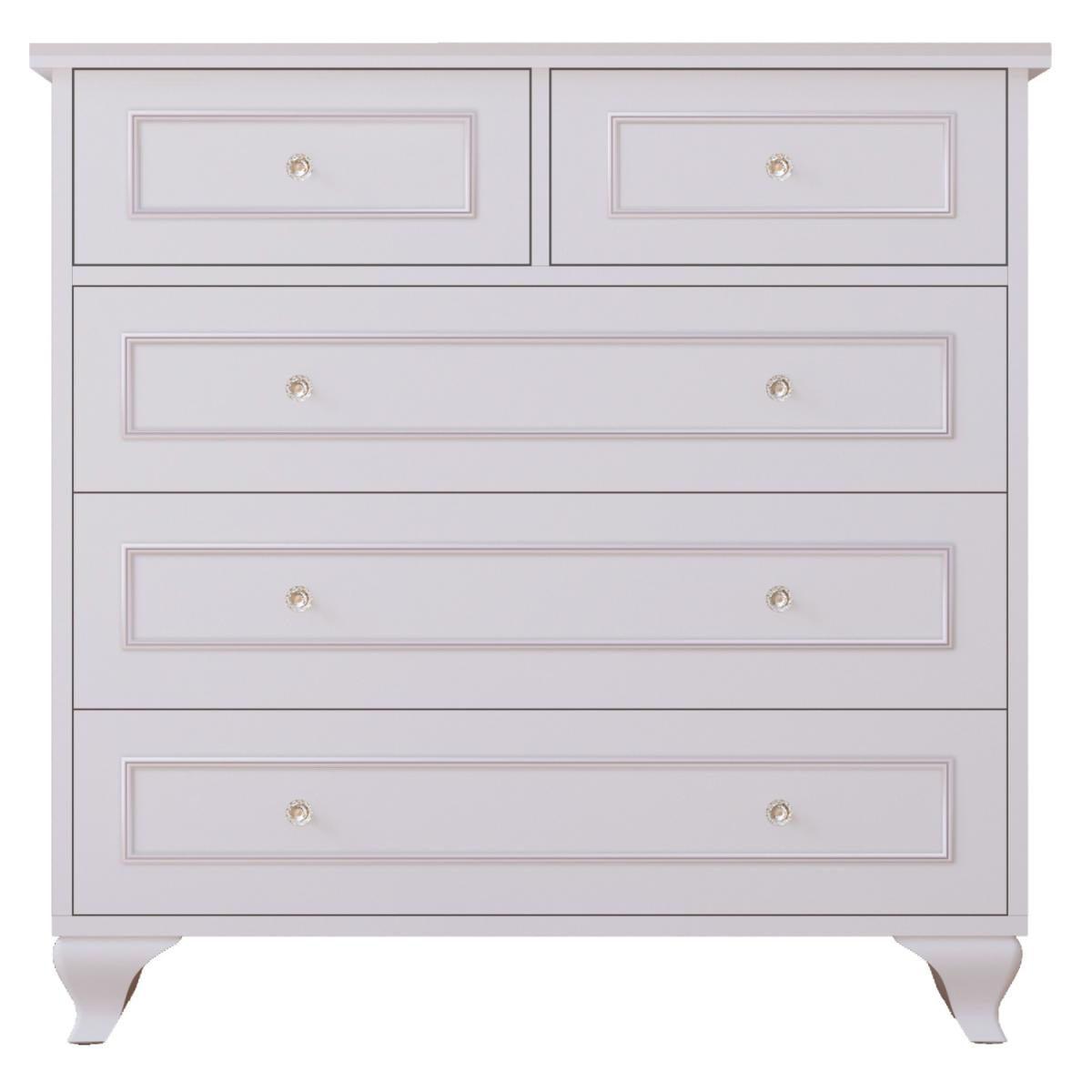 Simple but effective, GISELLE range is a modern take on the classic French furniture. Soft carved lines and white finish with matching accessories. Featuring five deep drawers, tapered feet and finished with antique style handles it boosts timeless design while offering you ample space for your folded clothes or accessories, such as sweaters, jeans, hats, hand bags, etc. Material Membrane coated MDF board, finished with CNC process. Dimensions Width90cm,Height86cm,Depth40cm. Delivered flat packed in 2x Boxes. Total Gross Weight38.6kg.