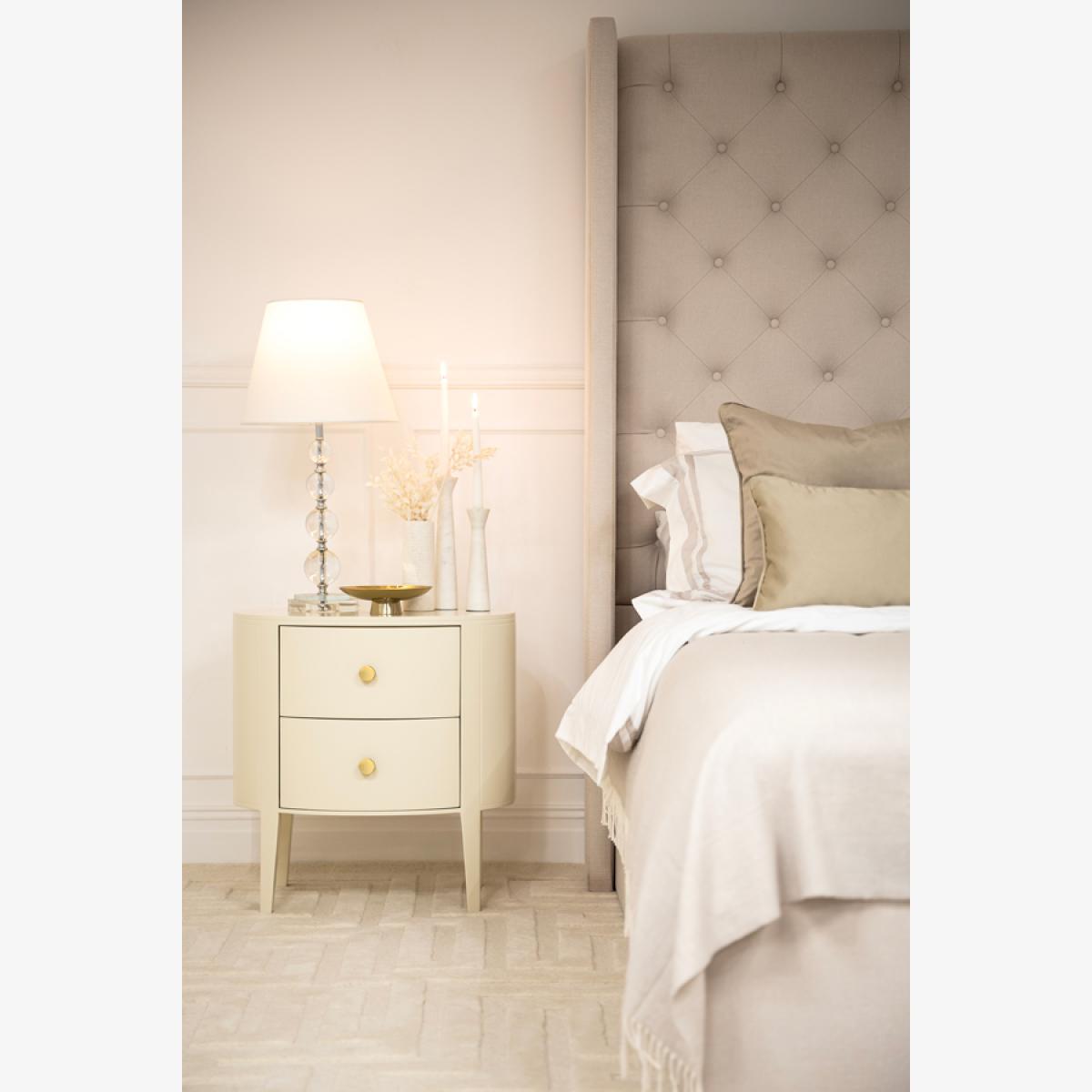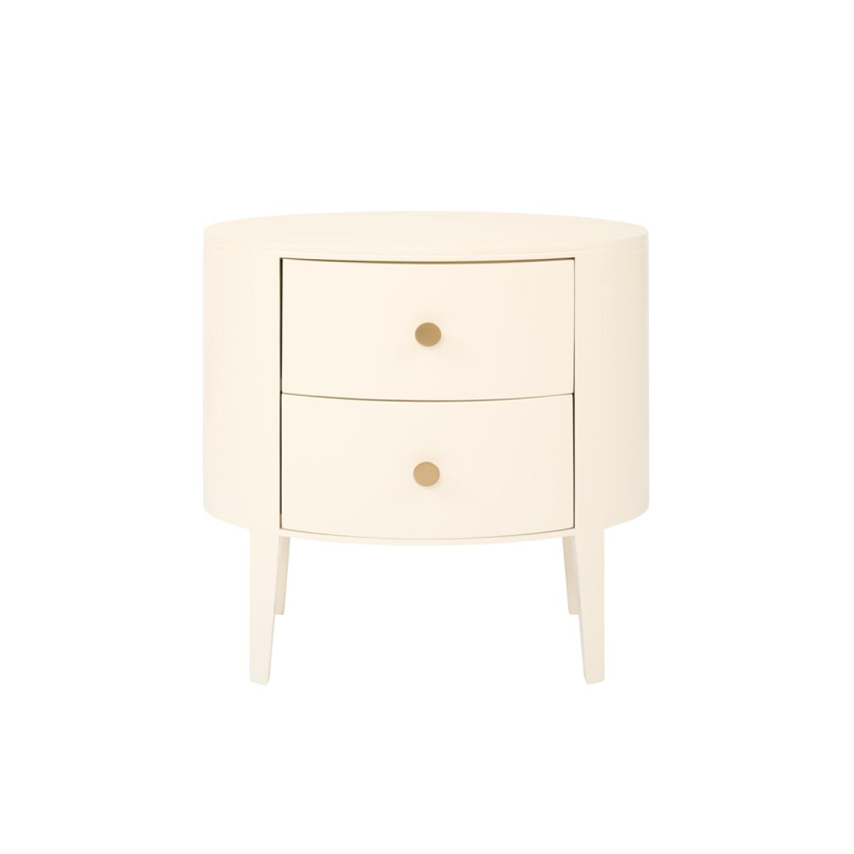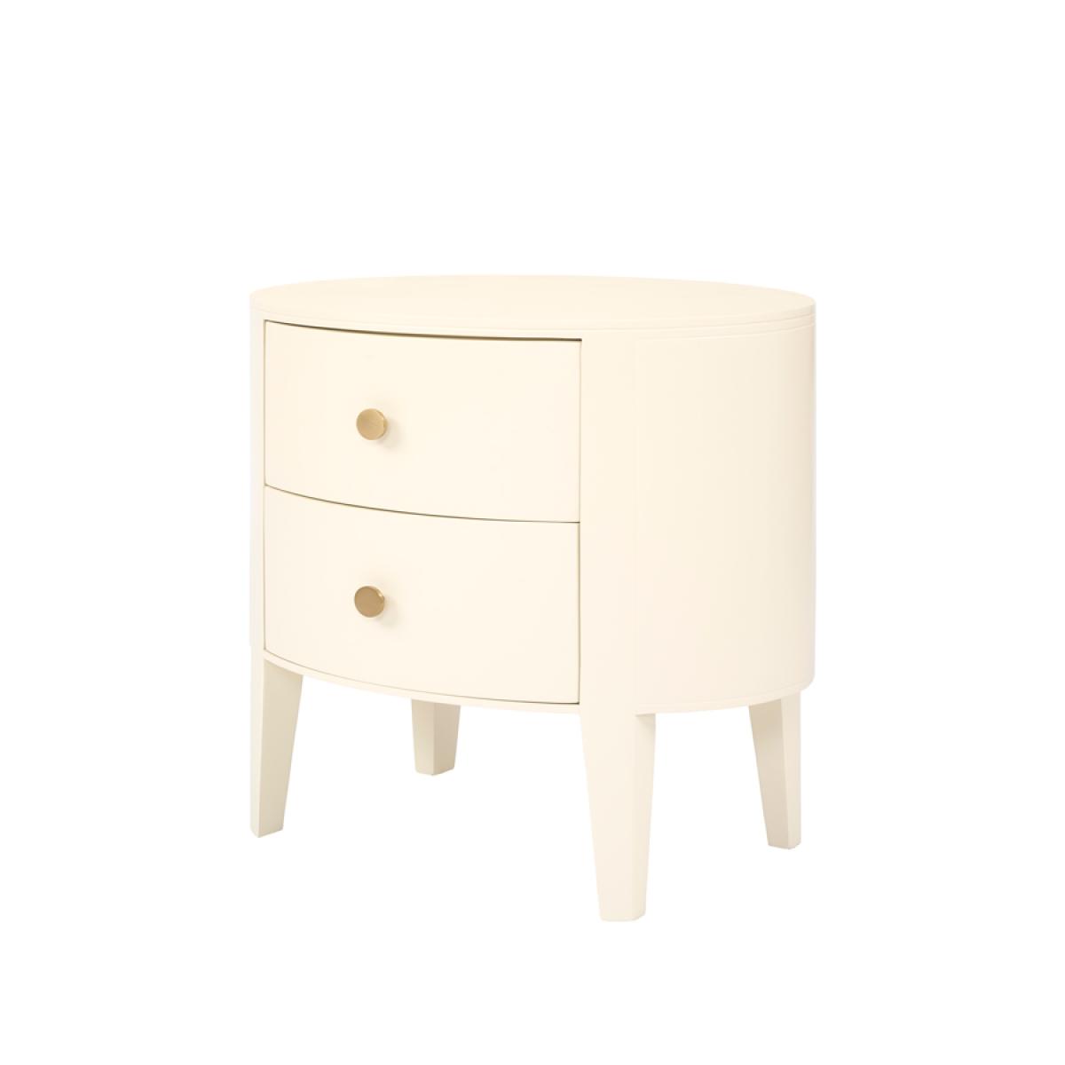 A sweet, stylish bedside table with an elegant oval form. Two spacious drawers with soft close runners. Brushed stainless steel handles with a brass finish. Durable polyurethane paint finish in a warm ivory finish. Supplied fully assembled.