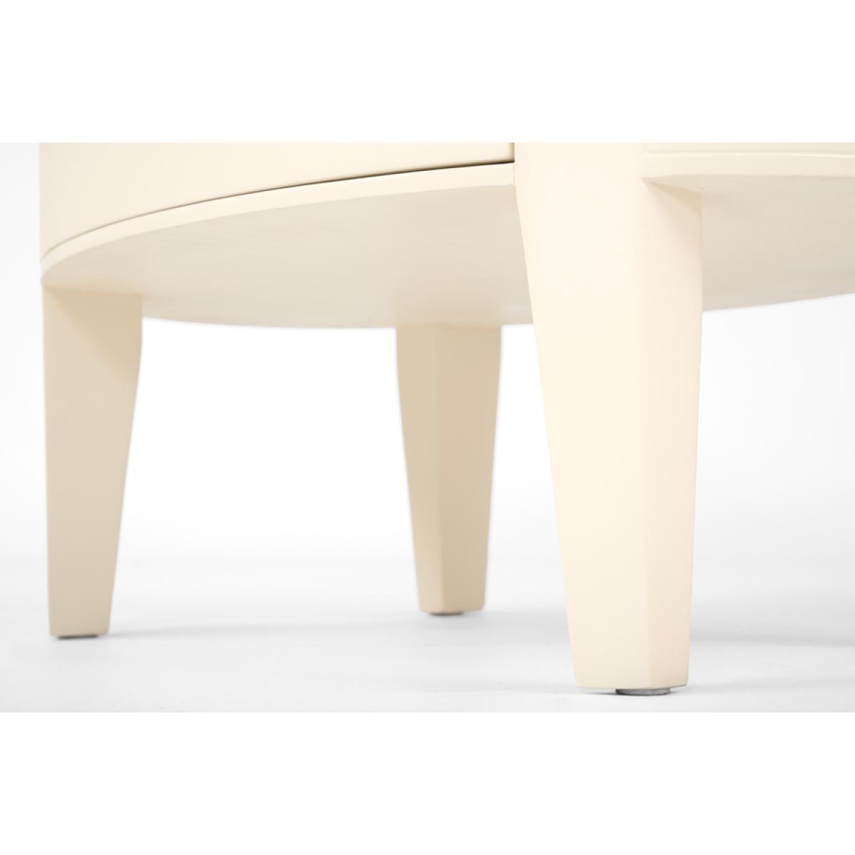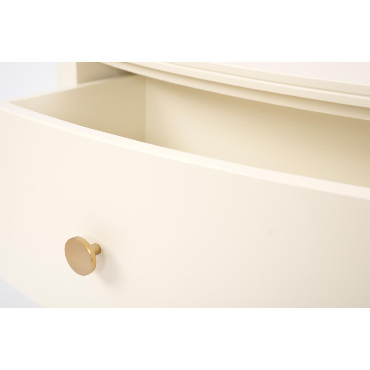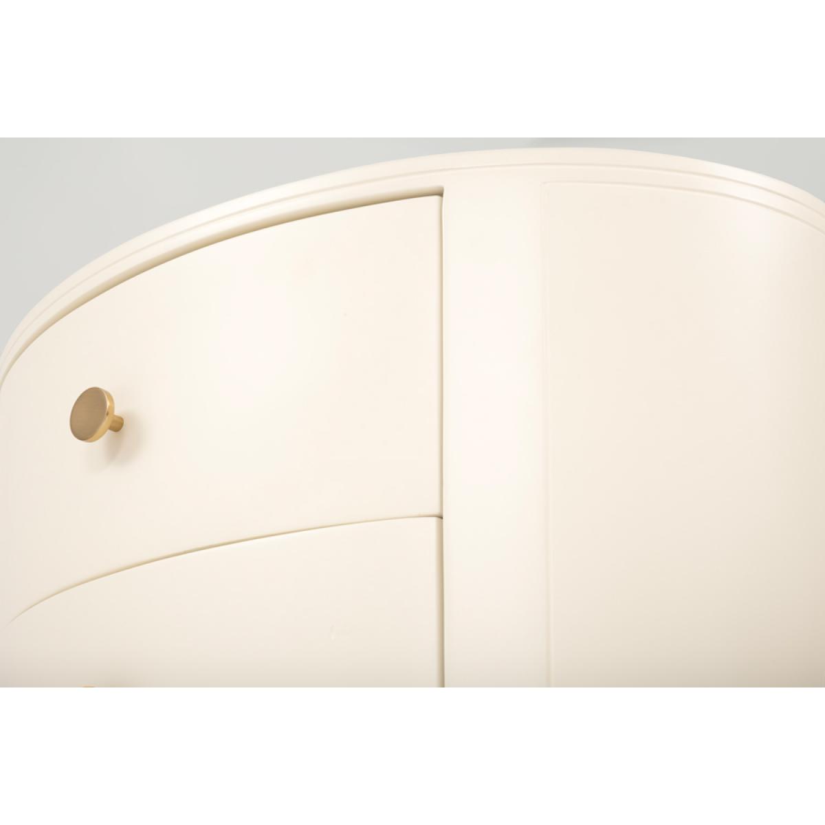 A sweet, stylish bedside table with an elegant oval form. Two spacious drawers with soft close runners. Brushed stainless steel handles with a brass finish. Durable polyurethane paint finish in a warm ivory finish. Supplied fully assembled.