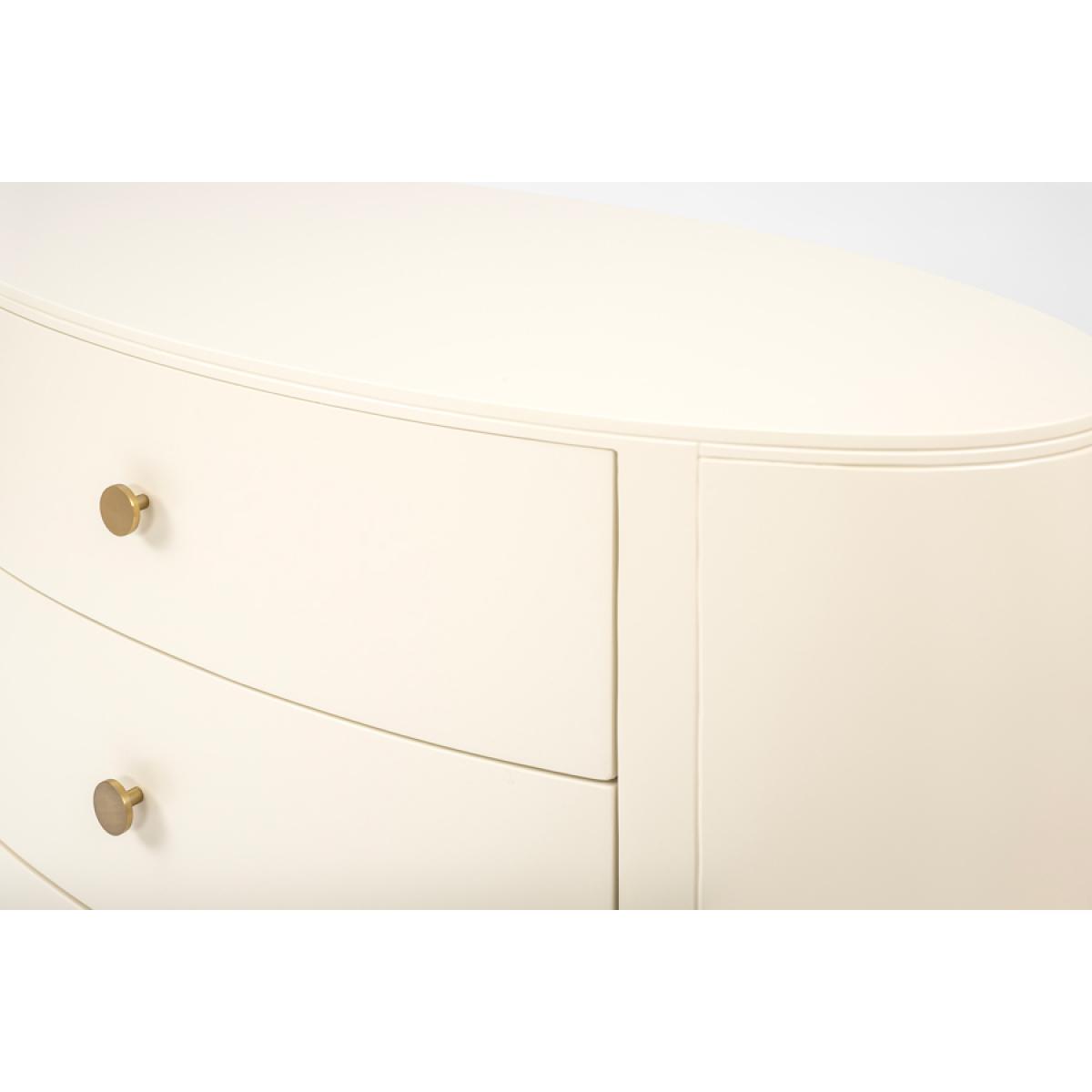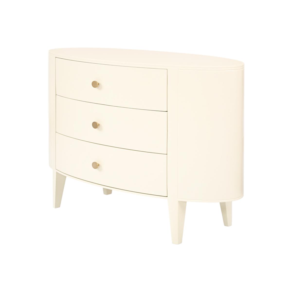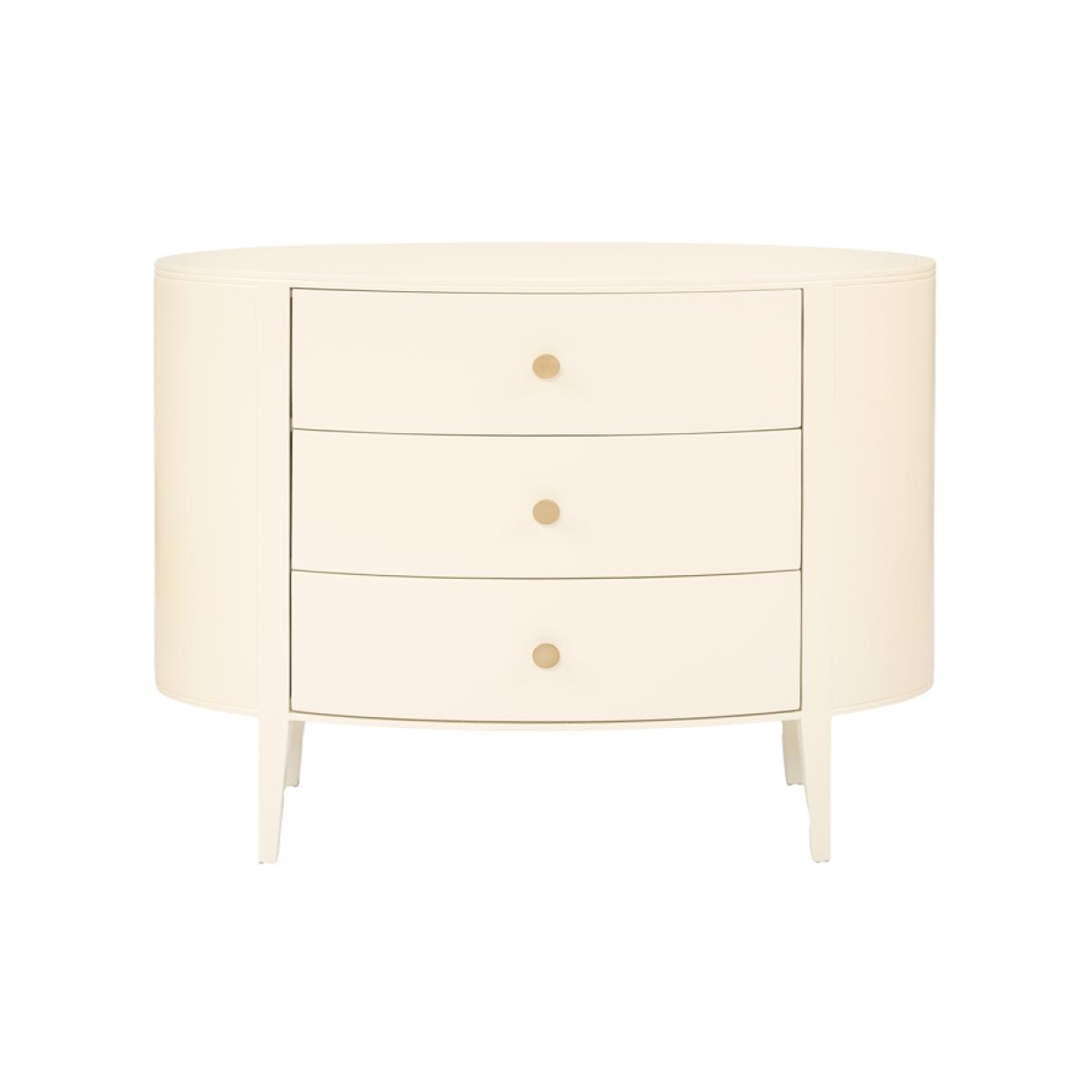 A sweet, stylish chest of drawers with an elegant oval form. Three spacious drawers with soft close runners. Brushed stainless steel handles with a brass finish. Durable polyurethane paint finish in a warm ivory finish. Supplied fully assembled.