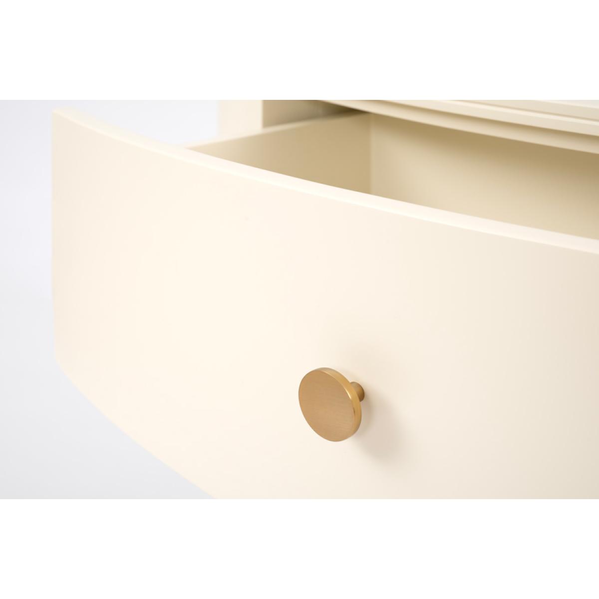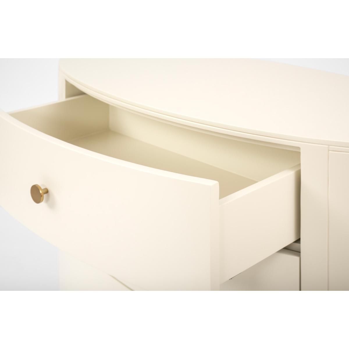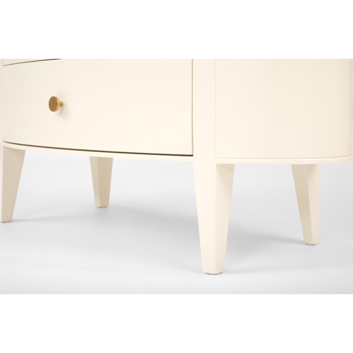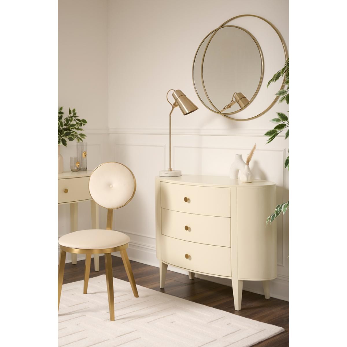 A sweet, stylish chest of drawers with an elegant oval form. Three spacious drawers with soft close runners. Brushed stainless steel handles with a brass finish. Durable polyurethane paint finish in a warm ivory finish. Supplied fully assembled.