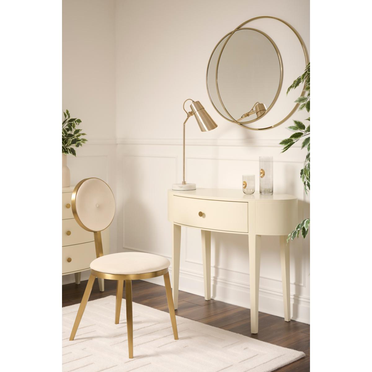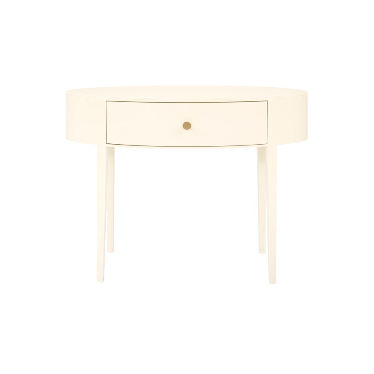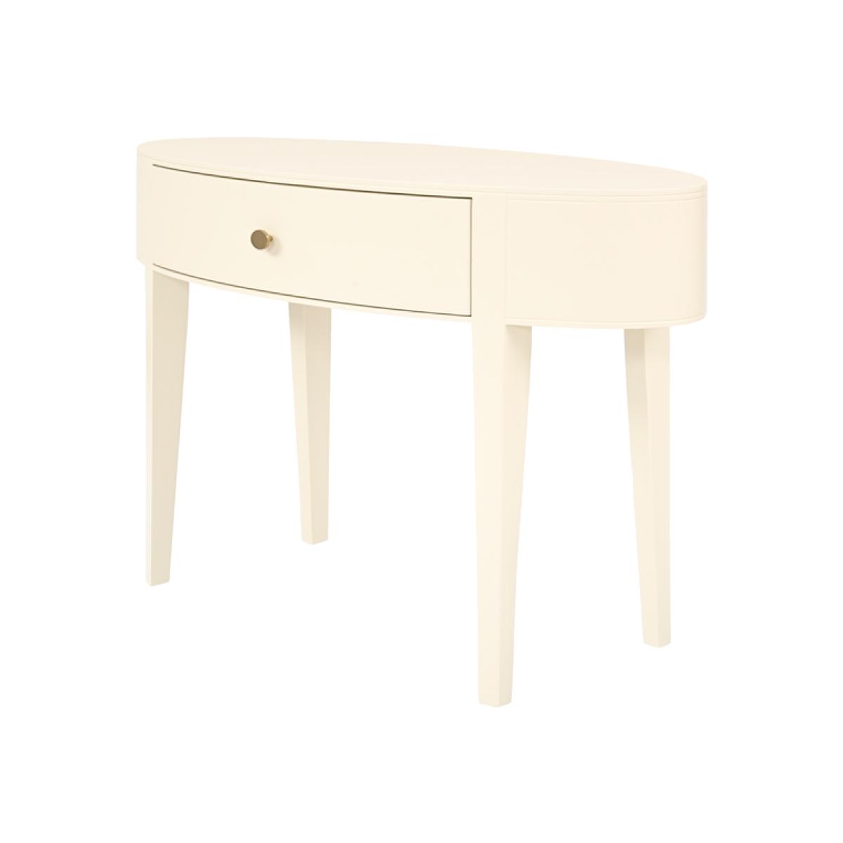 A sweet, stylish dressing table with an elegant oval form. Spacious drawer with soft close runners. Brushed stainless steel handle with a brass finish. Durable polyurethane paint finish in a warm ivory finish. Supplied fully assembled.