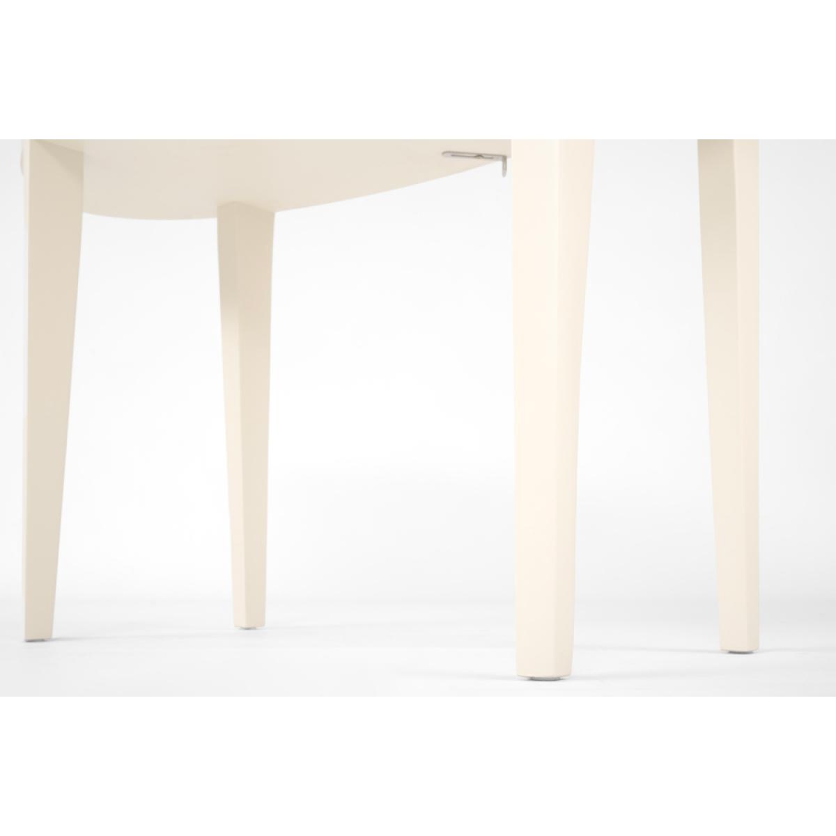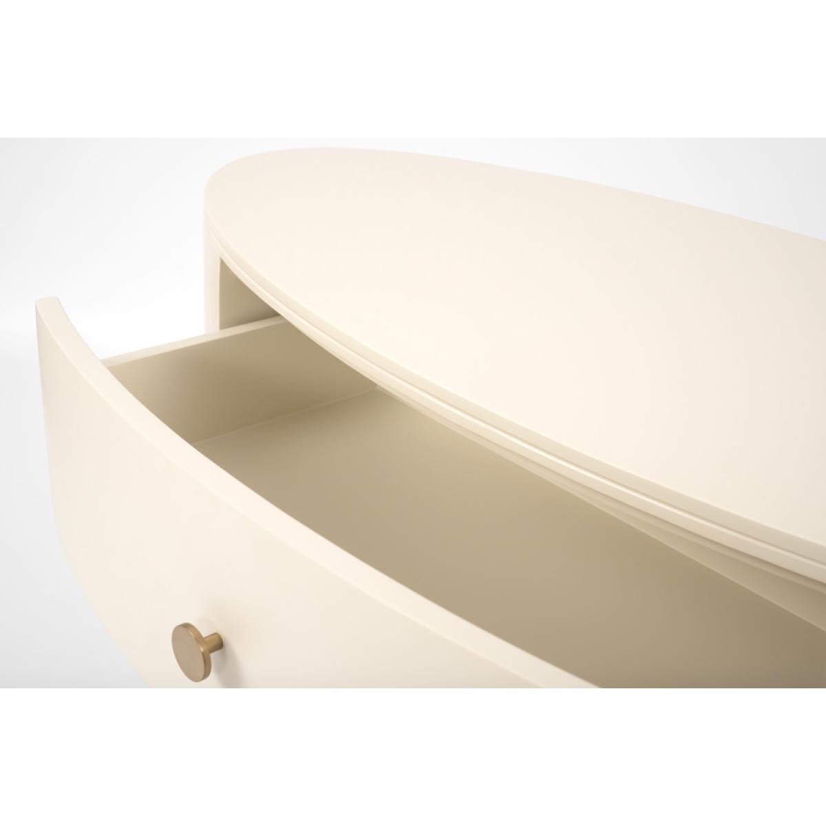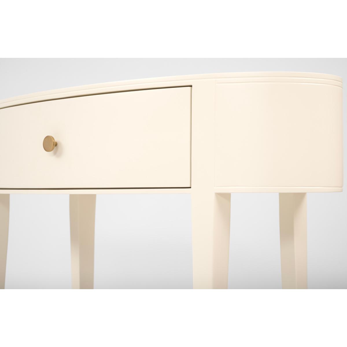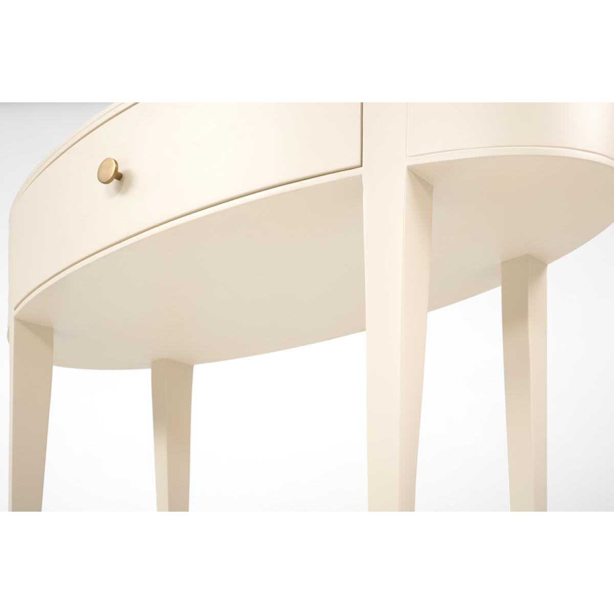 A sweet, stylish dressing table with an elegant oval form. Spacious drawer with soft close runners. Brushed stainless steel handle with a brass finish. Durable polyurethane paint finish in a warm ivory finish. Supplied fully assembled.