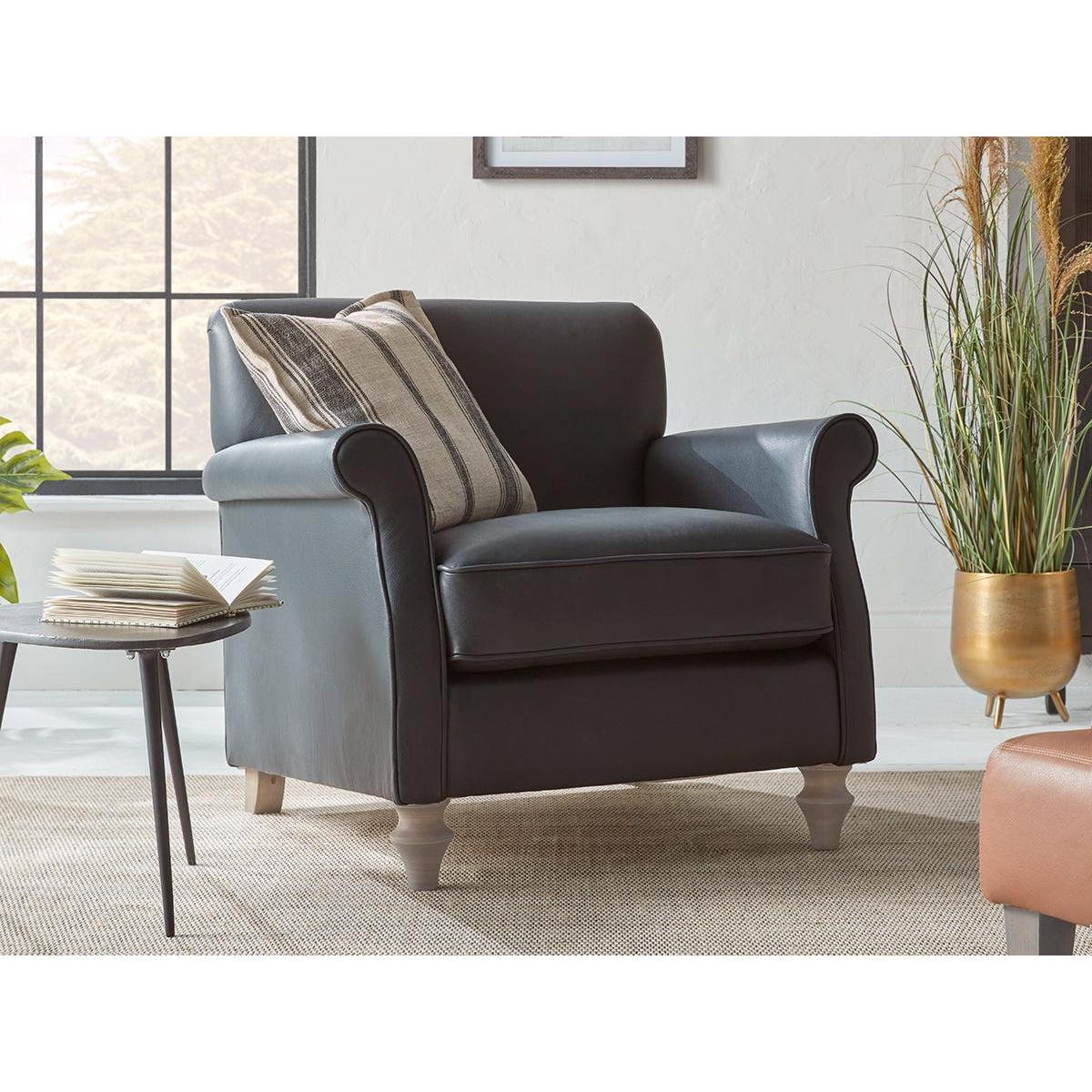Our Giverny collection boasts a distinguished profile that is pared back for a more graceful welcome to your living space. Narrow flared P-shaped arms, a medium height back and characterful turned wooden feet define the robust charm of this armchair, which is destined to support your home styling both now and as it evolves. The Giverny range also includes two seater and three seater sofas and an ottoman. Pictured here in our black leather, our Giverny collection can be upholstered in a choice of 34 distinctive shades and six fabrics to suit your style. Read our Upholstery FAQs View our full Upholstery Terms and Conditions