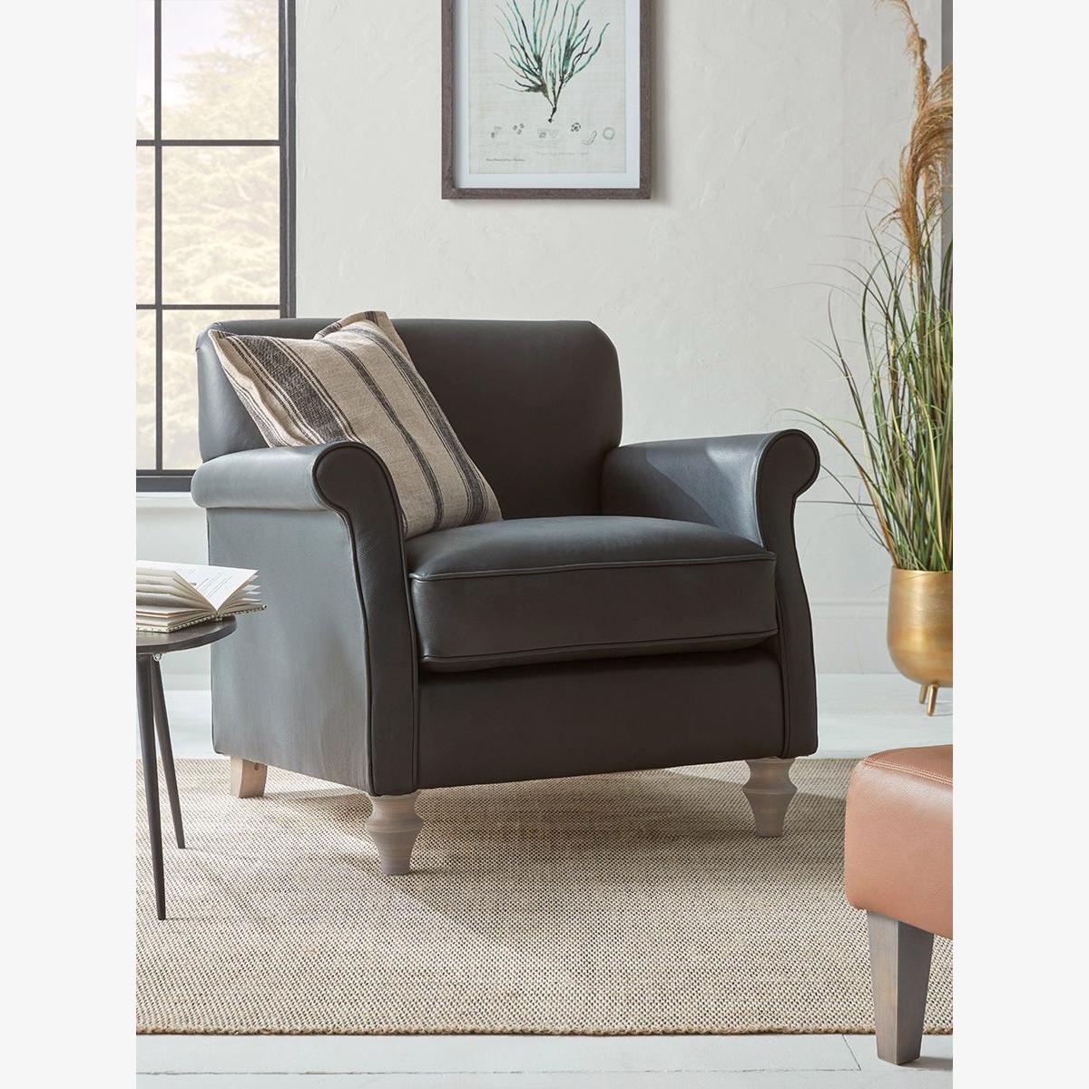 Our Giverny collection boasts a distinguished profile that is pared back for a more graceful welcome to your living space. Narrow flared P-shaped arms, a medium height back and characterful turned wooden feet define the robust charm of this armchair, which is destined to support your home styling both now and as it evolves. The Giverny range also includes two seater and three seater sofas and an ottoman. Pictured here in our black leather, our Giverny collection can be upholstered in a choice of 34 distinctive shades and six fabrics to suit your style. Read our Upholstery FAQs View our full Upholstery Terms and Conditions