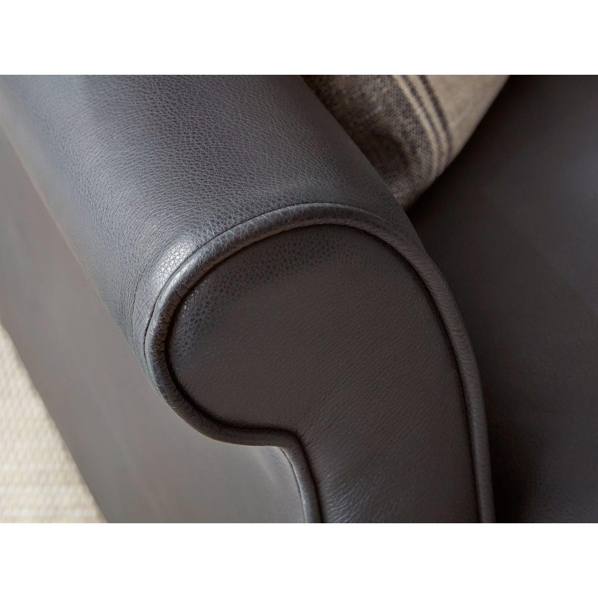 Our Giverny collection boasts a distinguished profile that is pared back for a more graceful welcome to your living space. Narrow flared P-shaped arms, a medium height back and characterful turned wooden feet define the robust charm of this armchair, which is destined to support your home styling both now and as it evolves. The Giverny range also includes two seater and three seater sofas and an ottoman. Pictured here in our black leather, our Giverny collection can be upholstered in a choice of 34 distinctive shades and six fabrics to suit your style. Read our Upholstery FAQs View our full Upholstery Terms and Conditions