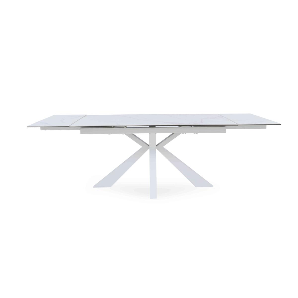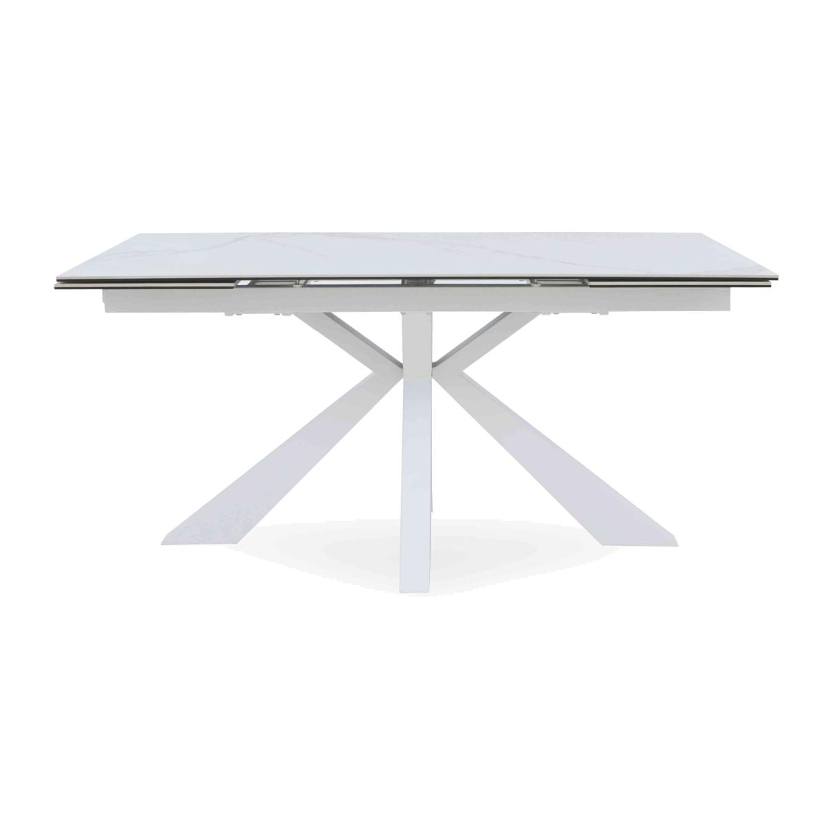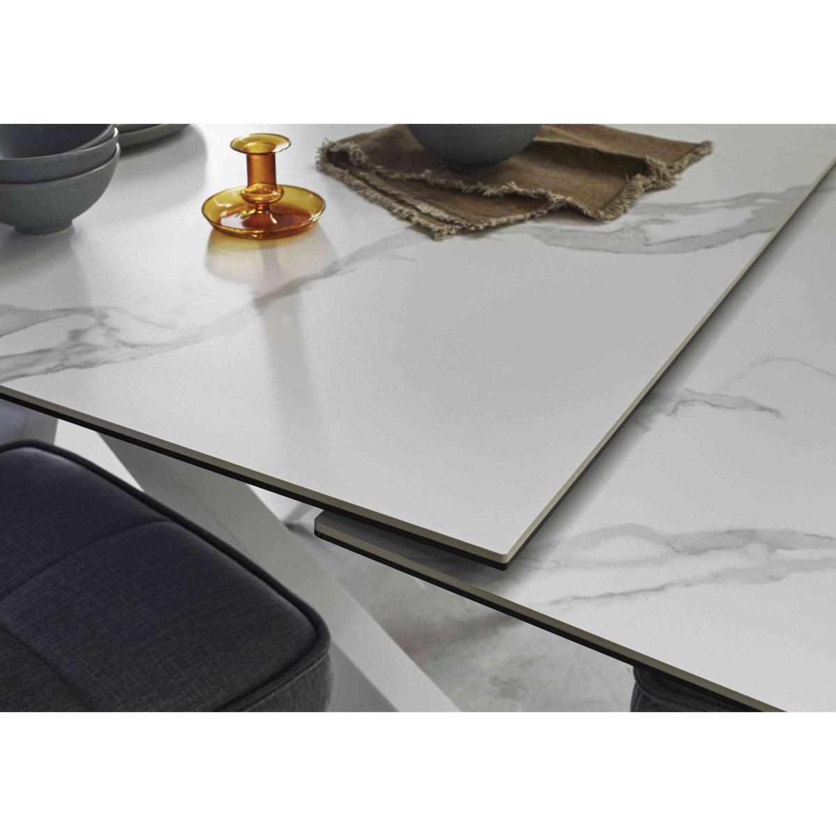 Ice-white and the essence of cool modern style, our Glacier collection of dining room furniture and living room tables and storage pieces is furniture for today – and the future. The finish is beautiful: a matt white ceramic with marble-effect patterning that’s highly durable and perfect for both busy homes and elegant spaces. Extending dining tables and occasional tables have white powder-coated metal bases while the range’s TV unit, sideboard, highboard and curio cabinets showcase sleek, high-gloss lacquered finishes with built-in LED lighting. The fabulous Glacier collection is exclusively available at Furniture Village. Meet the ice queen of dining room furniture. Our Glacier large extending dining table has a stunning white ceramic and metal finish that’s designed to wow. Why you'll love it Our Glacier range is cool, calm and very collectible. This stunning modern extending dining table has a striking ice-white finish. Matt ceramic top with marble-effect patterning. Layer of black tempered glass provides a stylishly contrasting edge. Metal star-shape base with a white powder-coated finish. Ideal for modern family life – ceramic is heatproof, scratch-resistant and chip-resistant. Extends to seat 10. 2 extra leaves simply pull out from the table ends. The Glacier range is only available at Furniture Village. This large extending dining table is part of our Glacier range. What you need to know This large 160 cm extending dining table seats 8 closed and extends to 240 cm to seat 10. Top is made of 6 mm ceramic bonded to 6 mm tempered glass. This dining table is very heavy and should not be moved once in place. We recommend using coasters and placemats at all times. Easy to care for. Simply wipe with a clean damp cloth and dry with a soft duster. Do not use abrasive cleaning products.