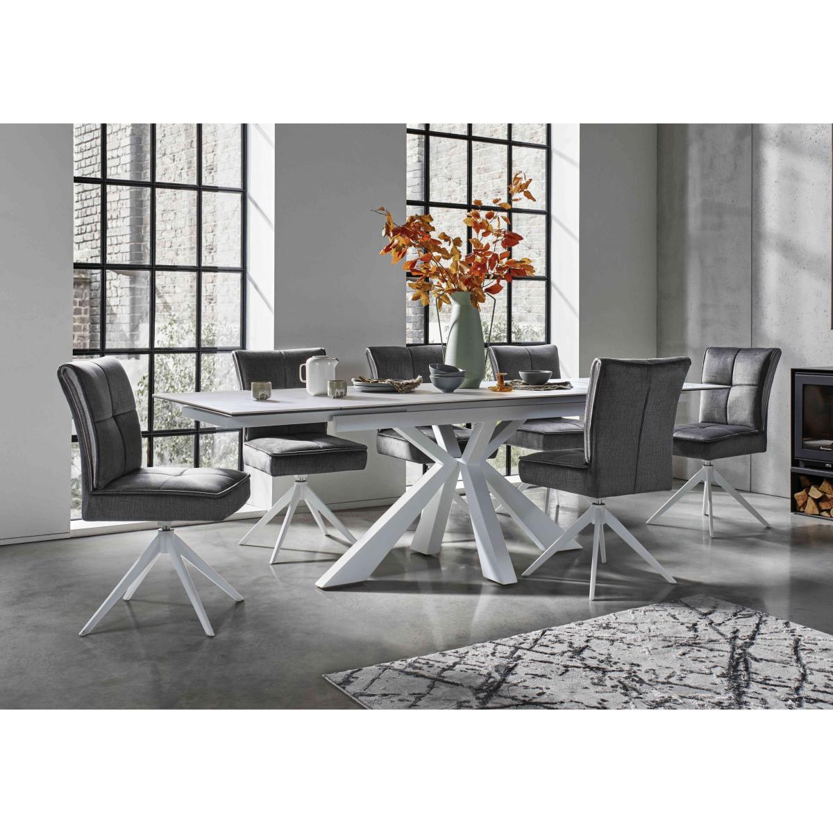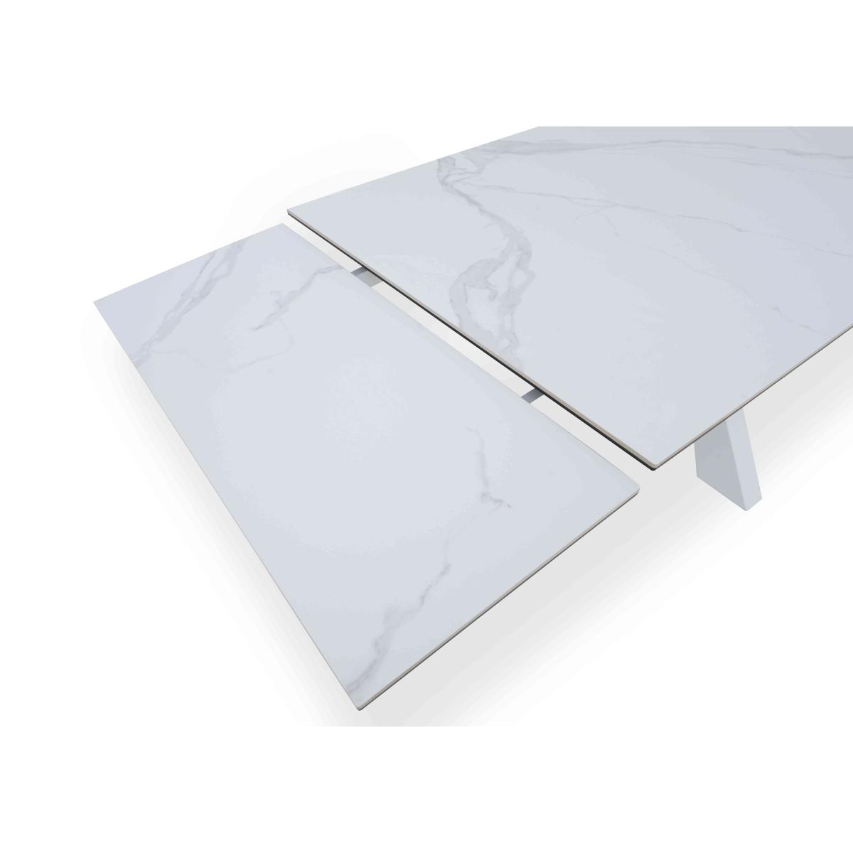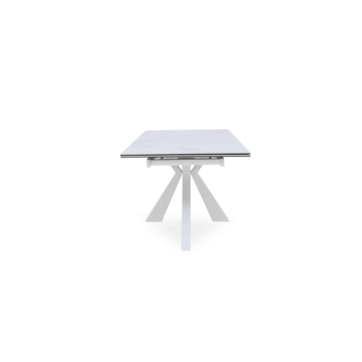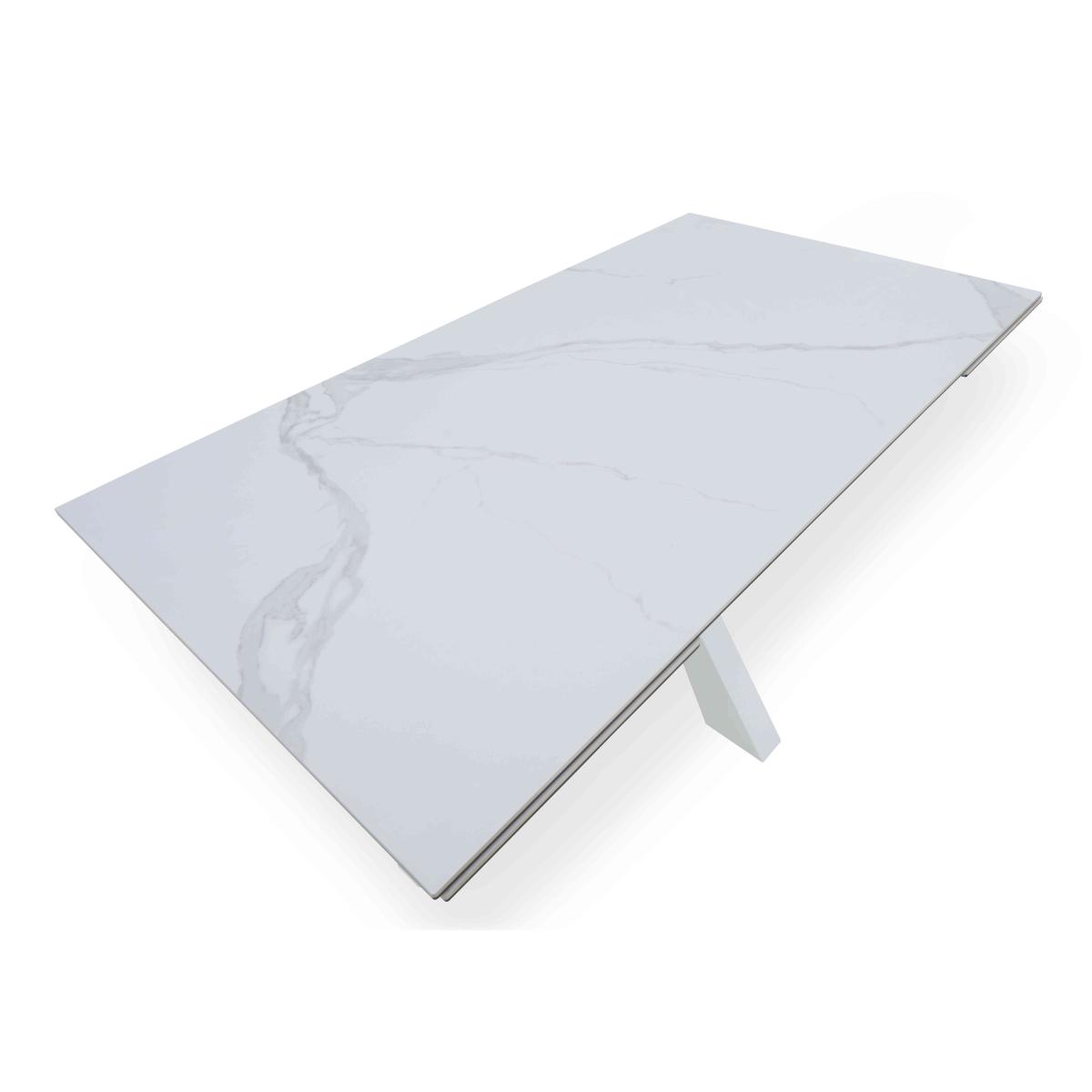 Ice-white and the essence of cool modern style, our Glacier collection of dining room furniture and living room tables and storage pieces is furniture for today – and the future. The finish is beautiful: a matt white ceramic with marble-effect patterning that’s highly durable and perfect for both busy homes and elegant spaces. Extending dining tables and occasional tables have white powder-coated metal bases while the range’s TV unit, sideboard, highboard and curio cabinets showcase sleek, high-gloss lacquered finishes with built-in LED lighting. The fabulous Glacier collection is exclusively available at Furniture Village. Meet the ice queen of dining room furniture. Our Glacier large extending dining table has a stunning white ceramic and metal finish that’s designed to wow. Why you'll love it Our Glacier range is cool, calm and very collectible. This stunning modern extending dining table has a striking ice-white finish. Matt ceramic top with marble-effect patterning. Layer of black tempered glass provides a stylishly contrasting edge. Metal star-shape base with a white powder-coated finish. Ideal for modern family life – ceramic is heatproof, scratch-resistant and chip-resistant. Extends to seat 10. 2 extra leaves simply pull out from the table ends. The Glacier range is only available at Furniture Village. This large extending dining table is part of our Glacier range. What you need to know This large 160 cm extending dining table seats 8 closed and extends to 240 cm to seat 10. Top is made of 6 mm ceramic bonded to 6 mm tempered glass. This dining table is very heavy and should not be moved once in place. We recommend using coasters and placemats at all times. Easy to care for. Simply wipe with a clean damp cloth and dry with a soft duster. Do not use abrasive cleaning products.