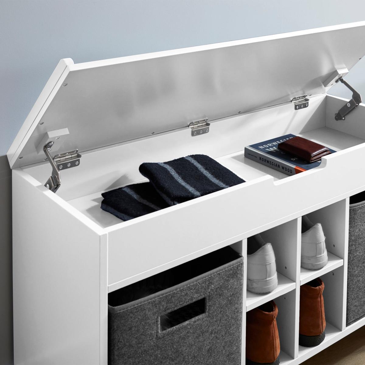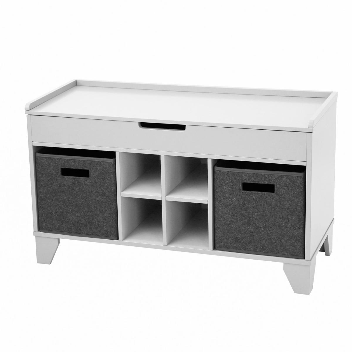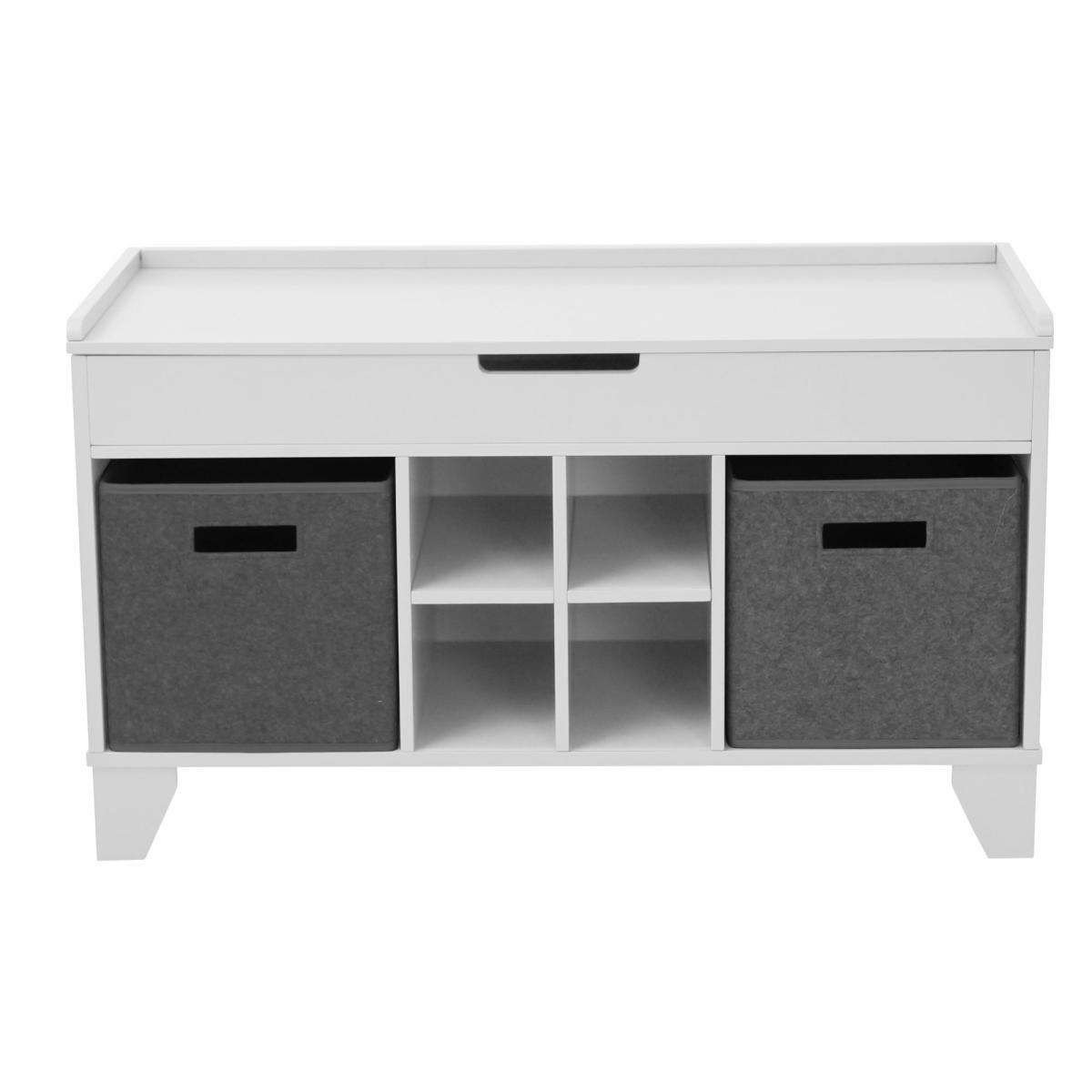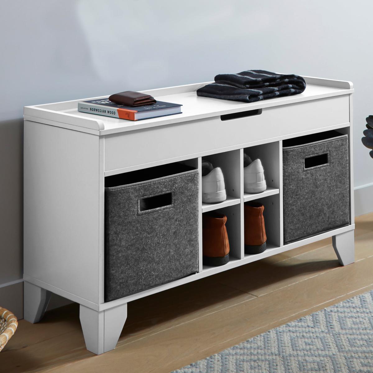The Glade Hallway Ottoman is the perfect storage solution for smaller spaces and hallways. This ottoman comes with ample amount of storage space, including a hinged top storage compartment, 2 large felt drawers, and 4 smaller storage cubbies perfect for shoes. Store away scarves, hats, shoes, and more.