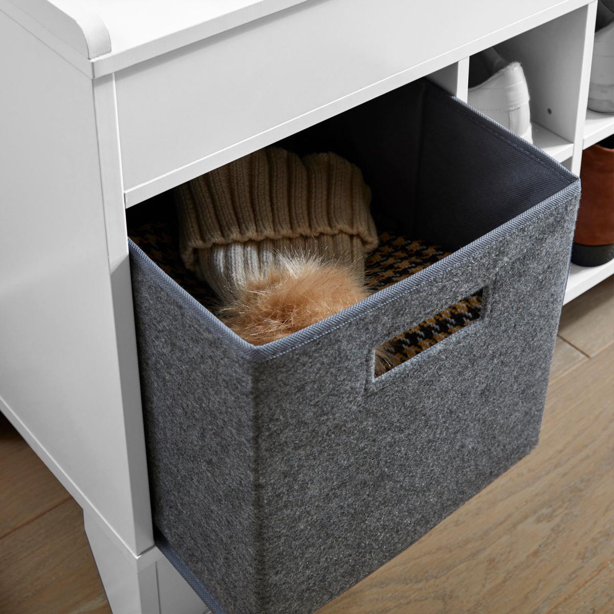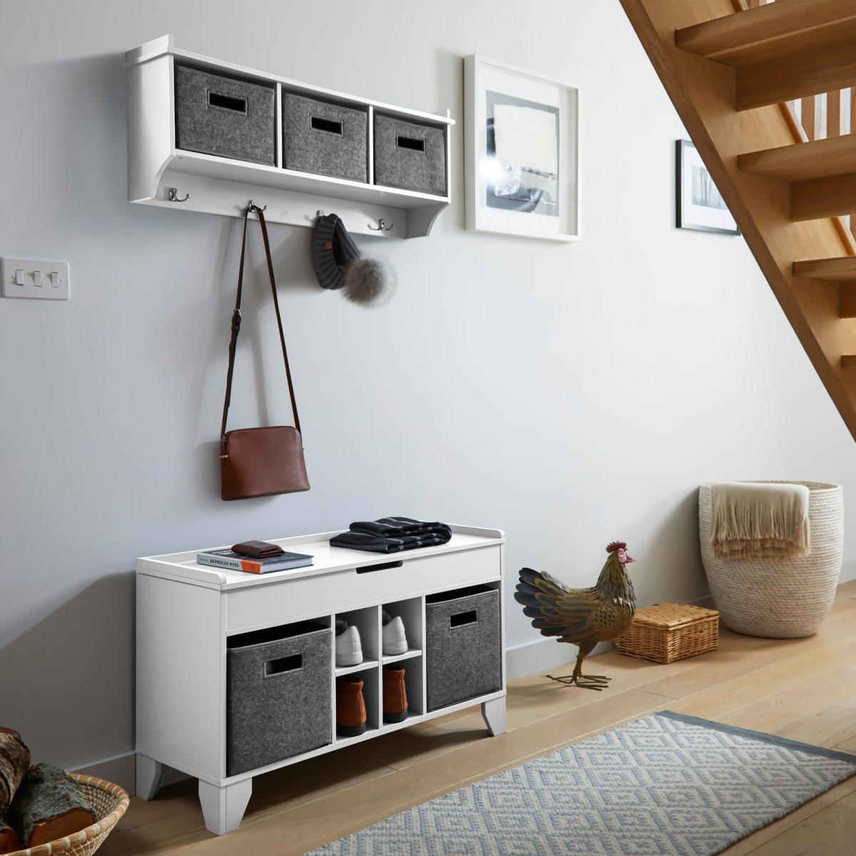 I love the clean, versatile look of the white hall runner - it works particularly well in modern, Scandinavian-inspired interiors thanks to its sleek lines and neutral colour. It’s a practical piece as well, offering storage options in the grey fabric bins and cubbies, which are perfect for organising shoes, accessories, or other essentials. Styling tips include pairing it with light wood furniture and minimal accessories for a fresh, airy feel, or adding a pop of colour through cushions or throws on nearby seating areas. It’s also great for entryways or hallways, where the combination of storage and style can help keep the space neat while looking effortlessly chic.