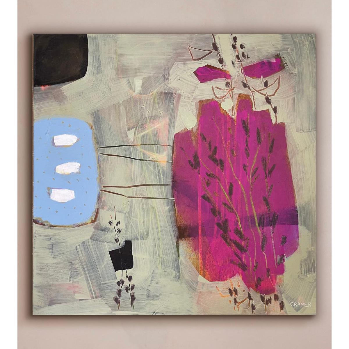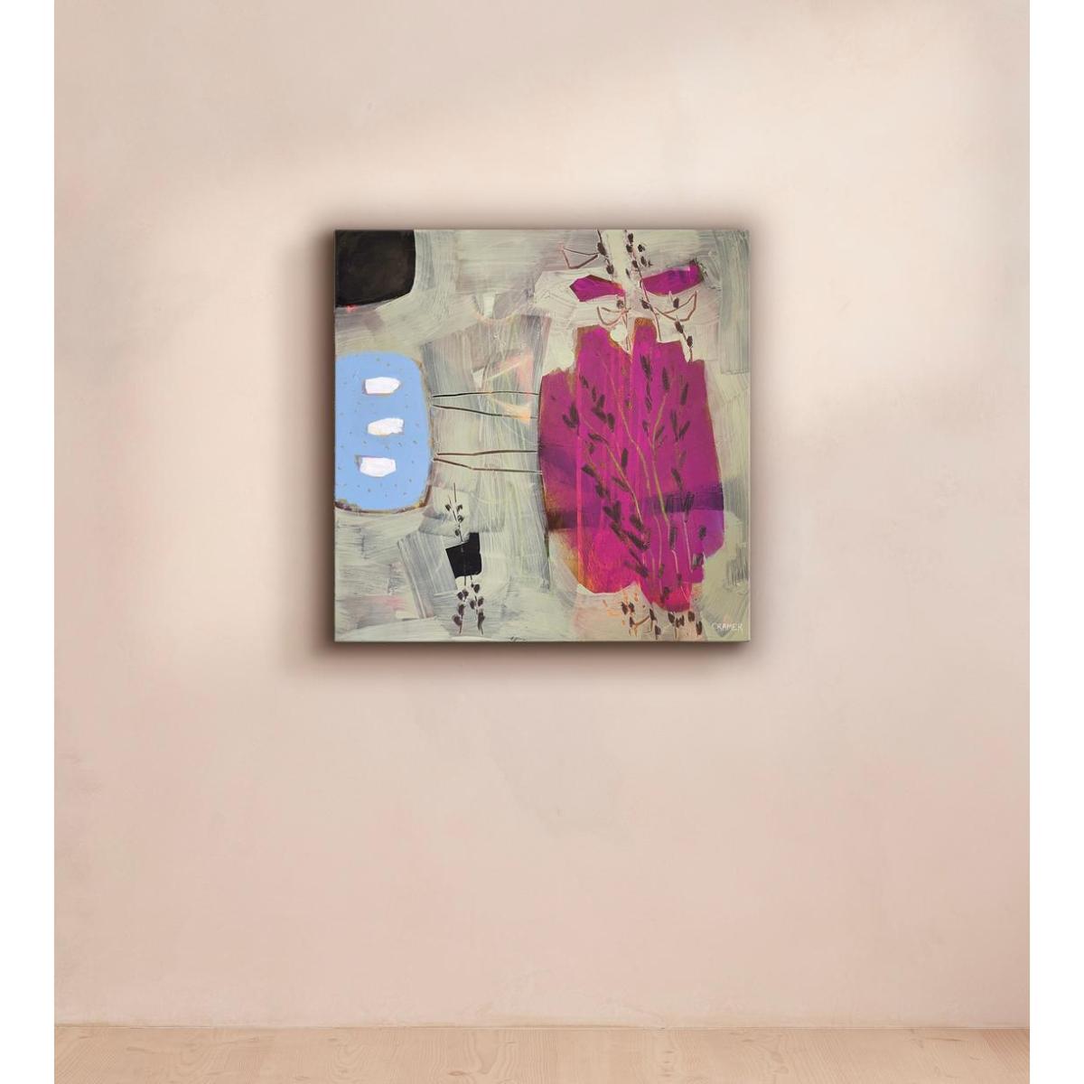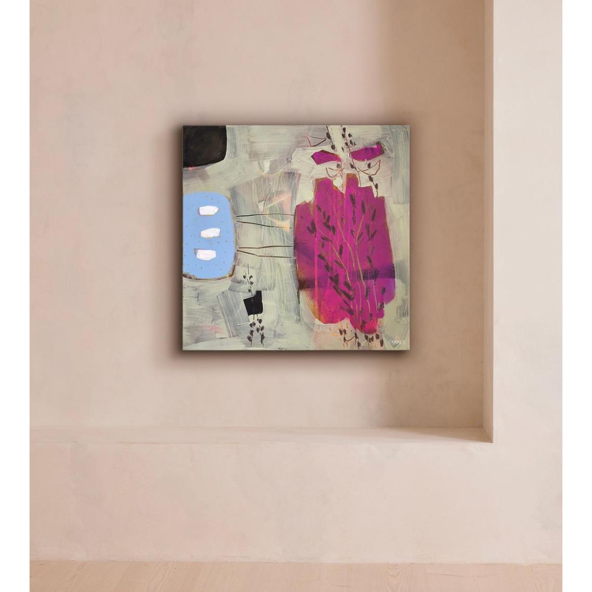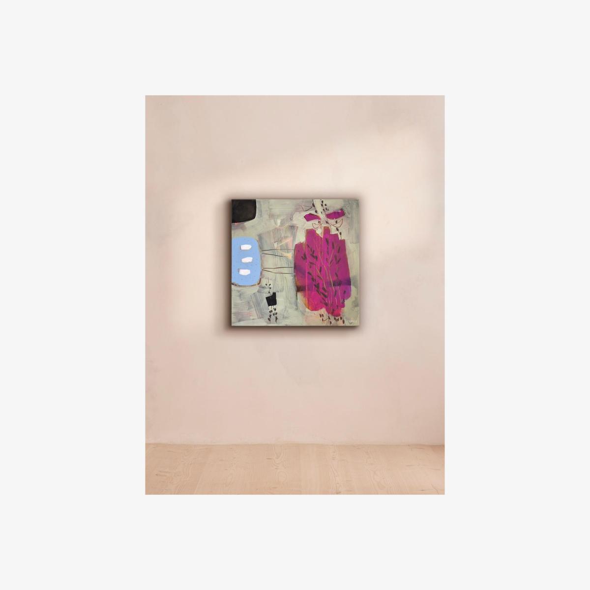 An original acrylic painting inspired by the magenta petals on a cluster of pink gladioli in the artist's garden. The memories of tall grasses, bracken and birdsong from a childhood on the Irish coast leads Laura Cramer to seek out English vineyards and woodland walks from her current home in Bristol. With an aim to 'paint freely', she works in layers with a 'childlike spontaneity'.