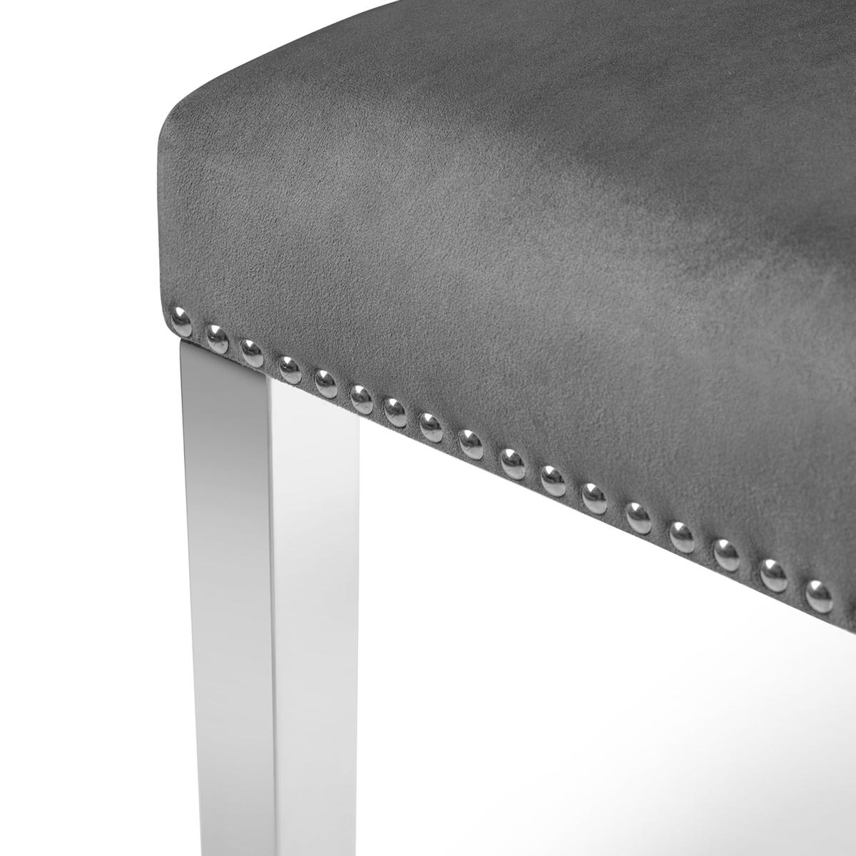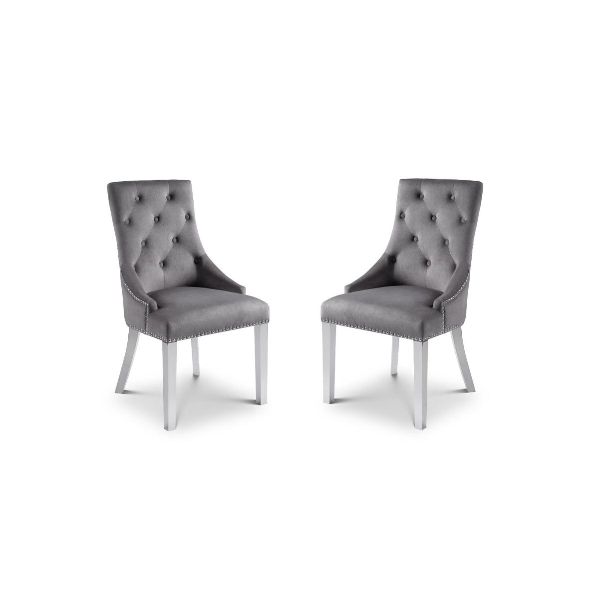 * 2 x Dining Chairs* Buttoned Back* Chrome Legs Upholstered in beautiful velvet, these chairs feature a buttoned back design that exudes luxury and sophistication. The contrasting chrome legs add a modern touch, while the lion head handle detail on the back provides a unique and stylish accent. Perfect for creating an inviting and classic look in any dining space, these dining chairs offer both comfort and visual appeal.