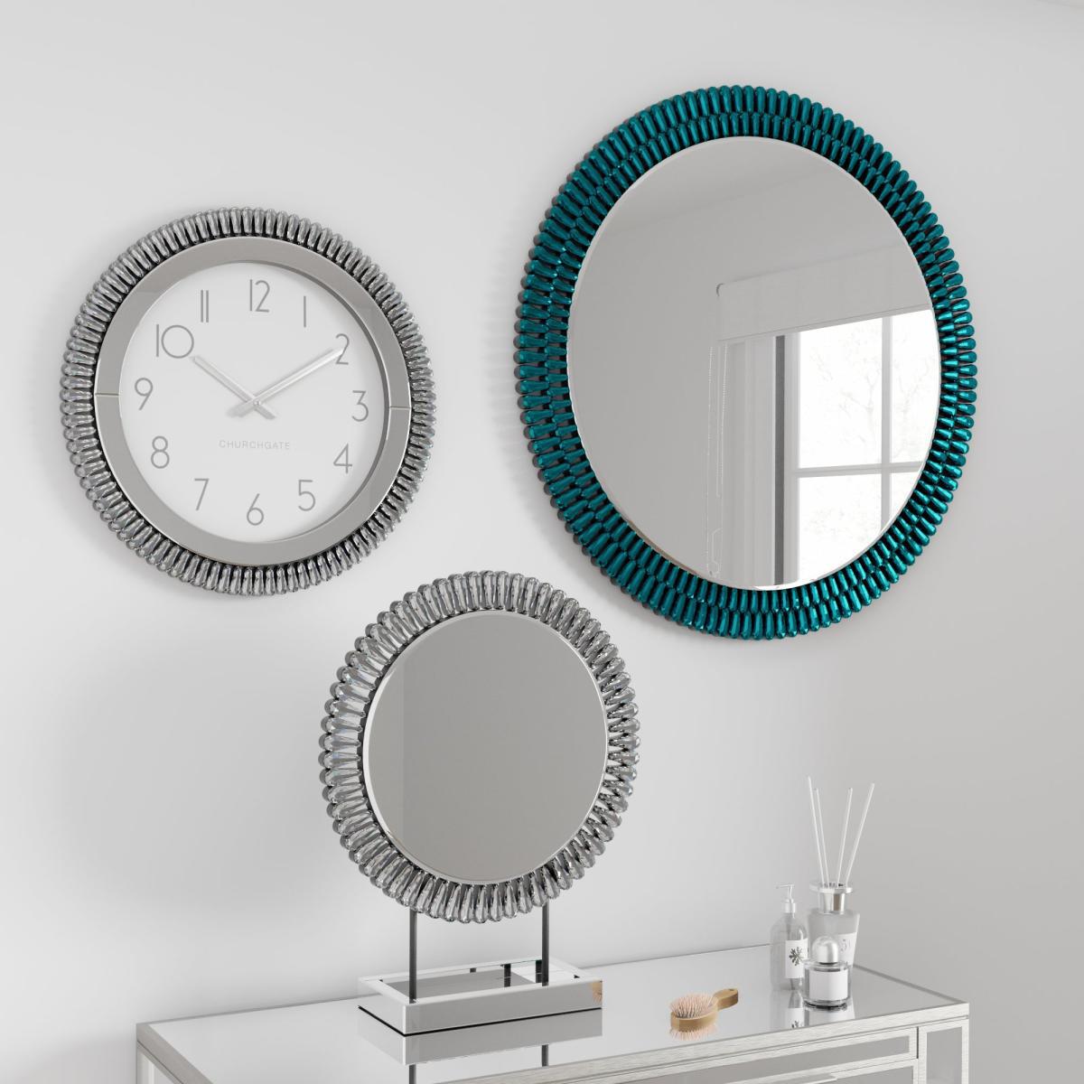 I love the opulent edge detail of this wall mirror - it adds a touch of glamour without feeling overstated. The peacock green hue makes it a versatile statement piece, especially striking in contemporary or eclectic interiors. It works well above a console or sideboard, or as a focal point in a bathroom or dressing area. Practical styling tips include pairing it with other textured or metallic accessories to bring out its luxurious vibe, or using it to add depth to smaller spaces by placing it opposite a window to reflect light. This mirror is a fantastic way to introduce colour and a bit of personality into neutral schemes.