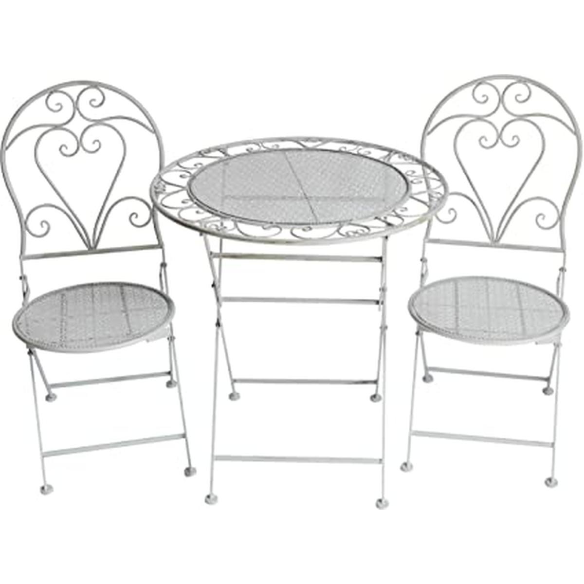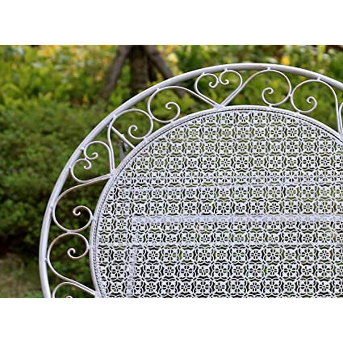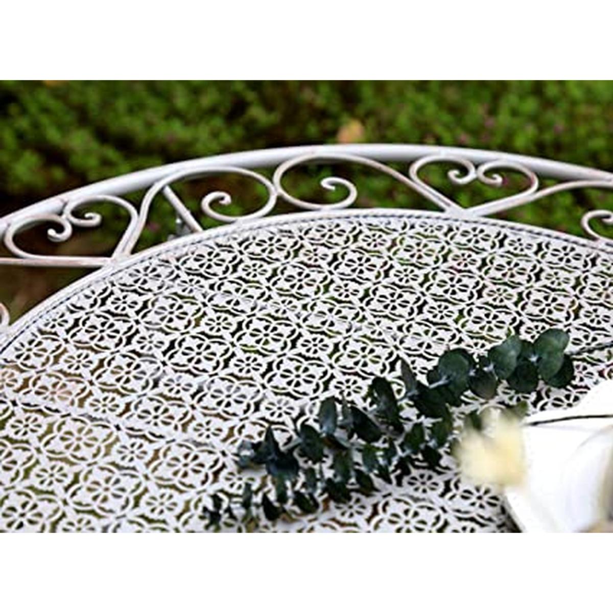 This stunning table and chair set is the perfect addition to any garden. Expertly handmade to ensure the best quality possible, this garden furniture set will brighten any outdoor space, whilst also providing a comfortable and stylish place to enjoy the sunshine! The backrests are decorated with elegant swirls and curves that meet in the middle to create a love heart shape, perfect for couples to relax in. The perimeter of the tabletop features a delicate lace design, ensuring that the shabby-chic look is carried throughout the whole furniture set.