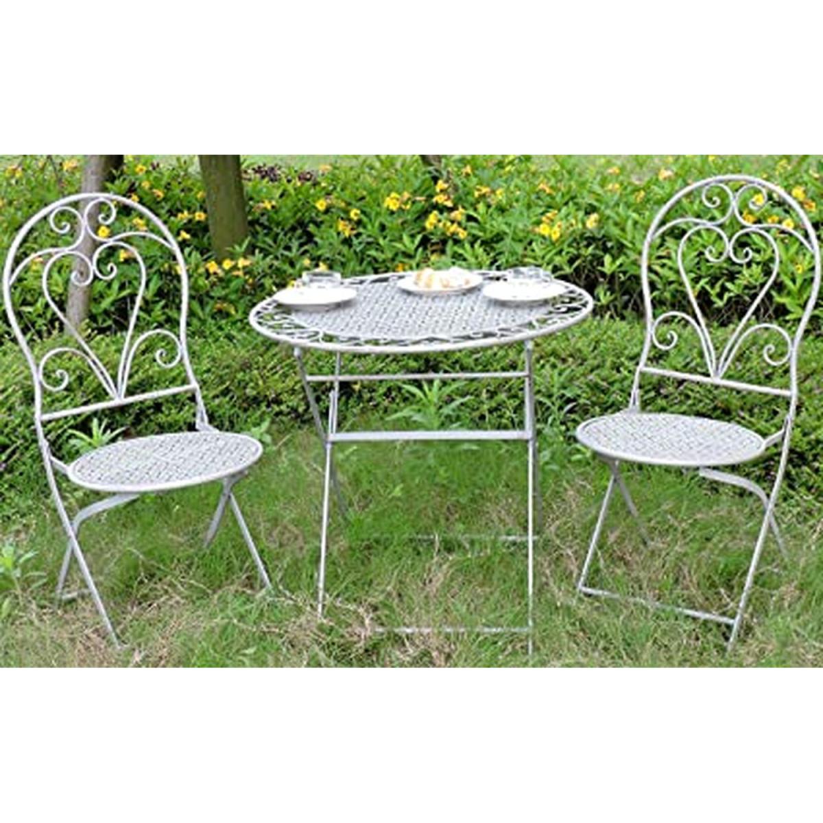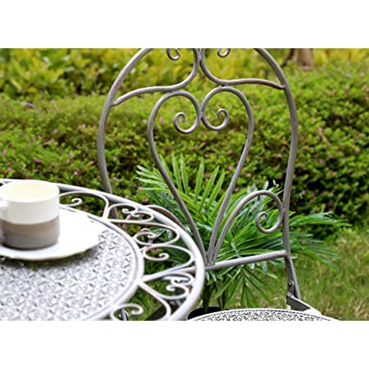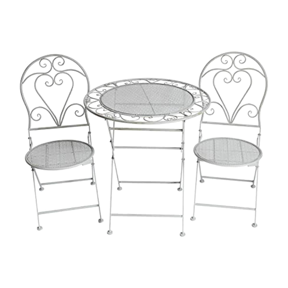 This stunning table and chair set is the perfect addition to any garden. Expertly handmade to ensure the best quality possible, this garden furniture set will brighten any outdoor space, whilst also providing a comfortable and stylish place to enjoy the sunshine! The backrests are decorated with elegant swirls and curves that meet in the middle to create a love heart shape, perfect for couples to relax in. The perimeter of the tabletop features a delicate lace design, ensuring that the shabby-chic look is carried throughout the whole furniture set.