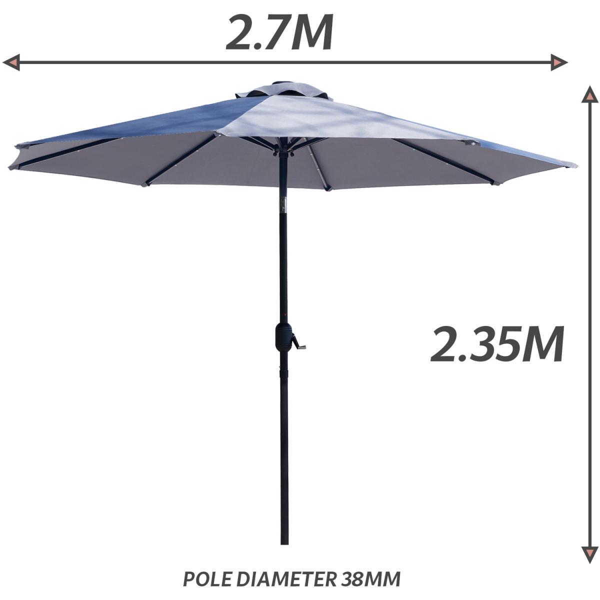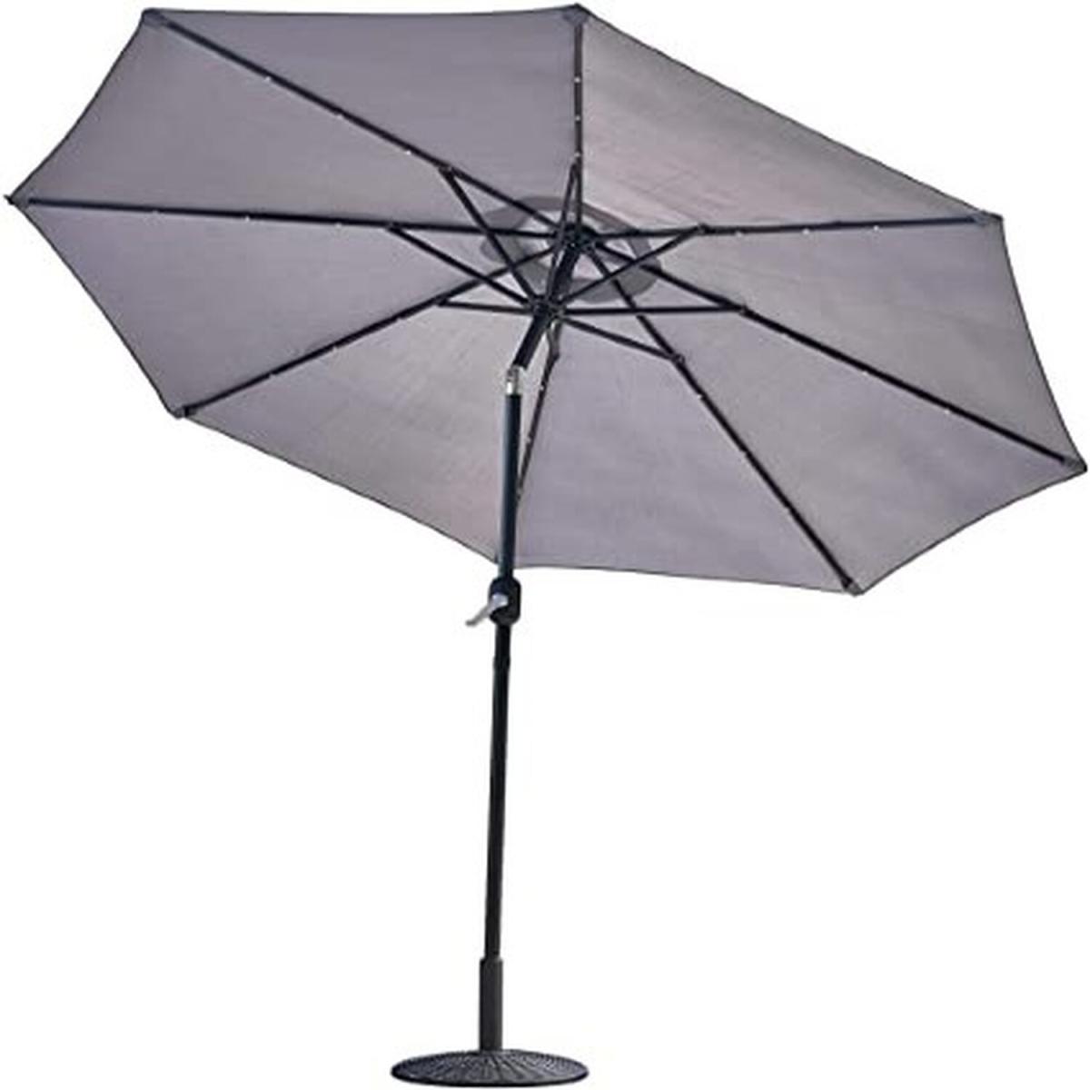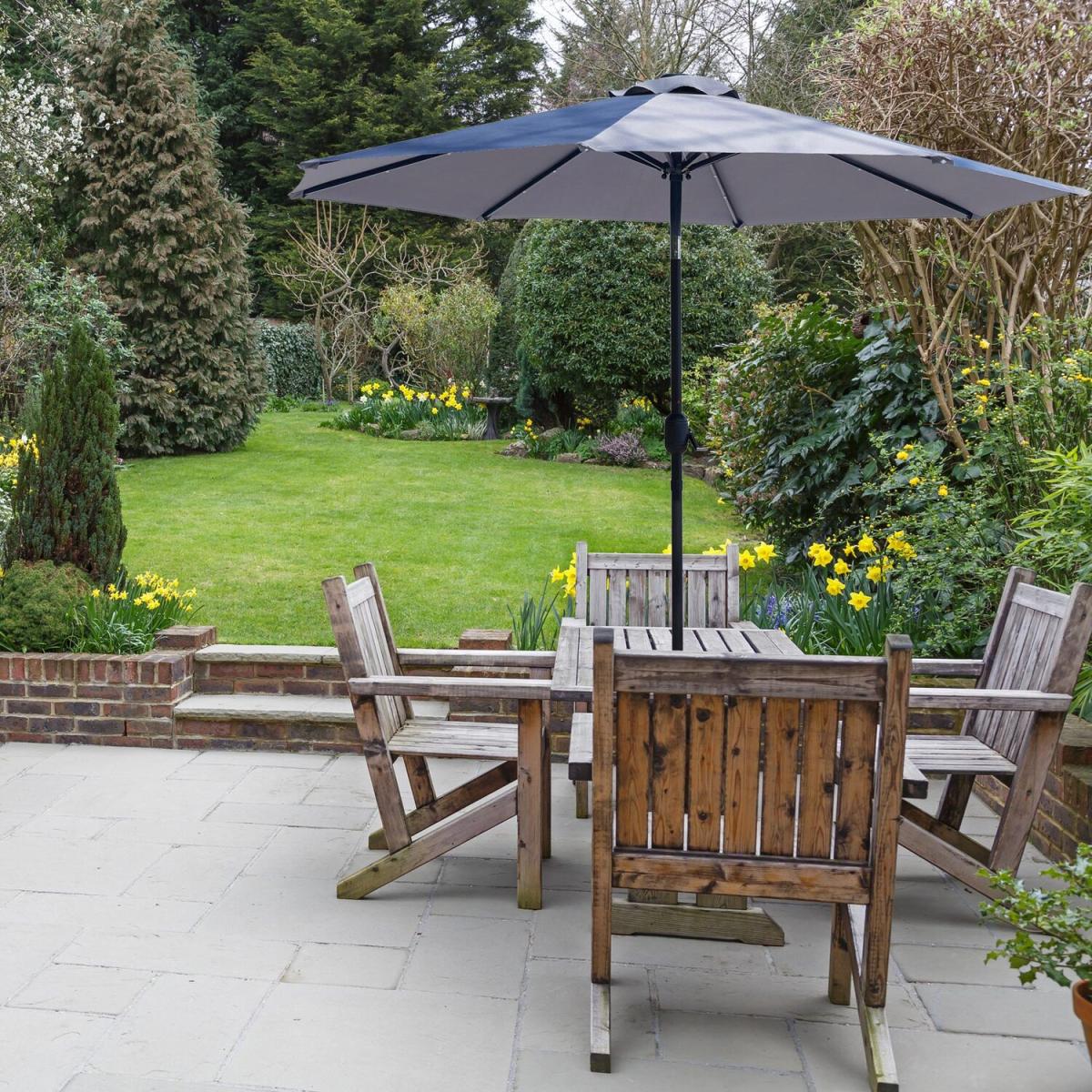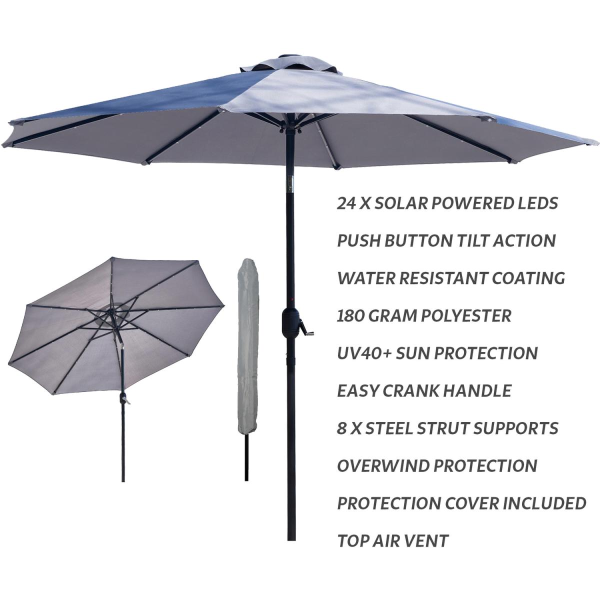 Bring a touch of class to your garden parties and BBQs with this elegant yet practical light grey coloured parasol. The tilting umbrella lets you get as much or as little sun as you want. Unlike a lot of other garden furniture, it's easy to put together and simple to use. Just click the two pieces together, turn the crank handle to open the umbrella, and use the push button to tilt it to the right angle. That's all there is to it! The ribs on this parasol are lined with solar-powered LED lights that you can turn on with a flick of a switch. This will illuminate the area directly beneath the parasol, so you can enjoy a cup of tea or read a book on a warm summer evening.