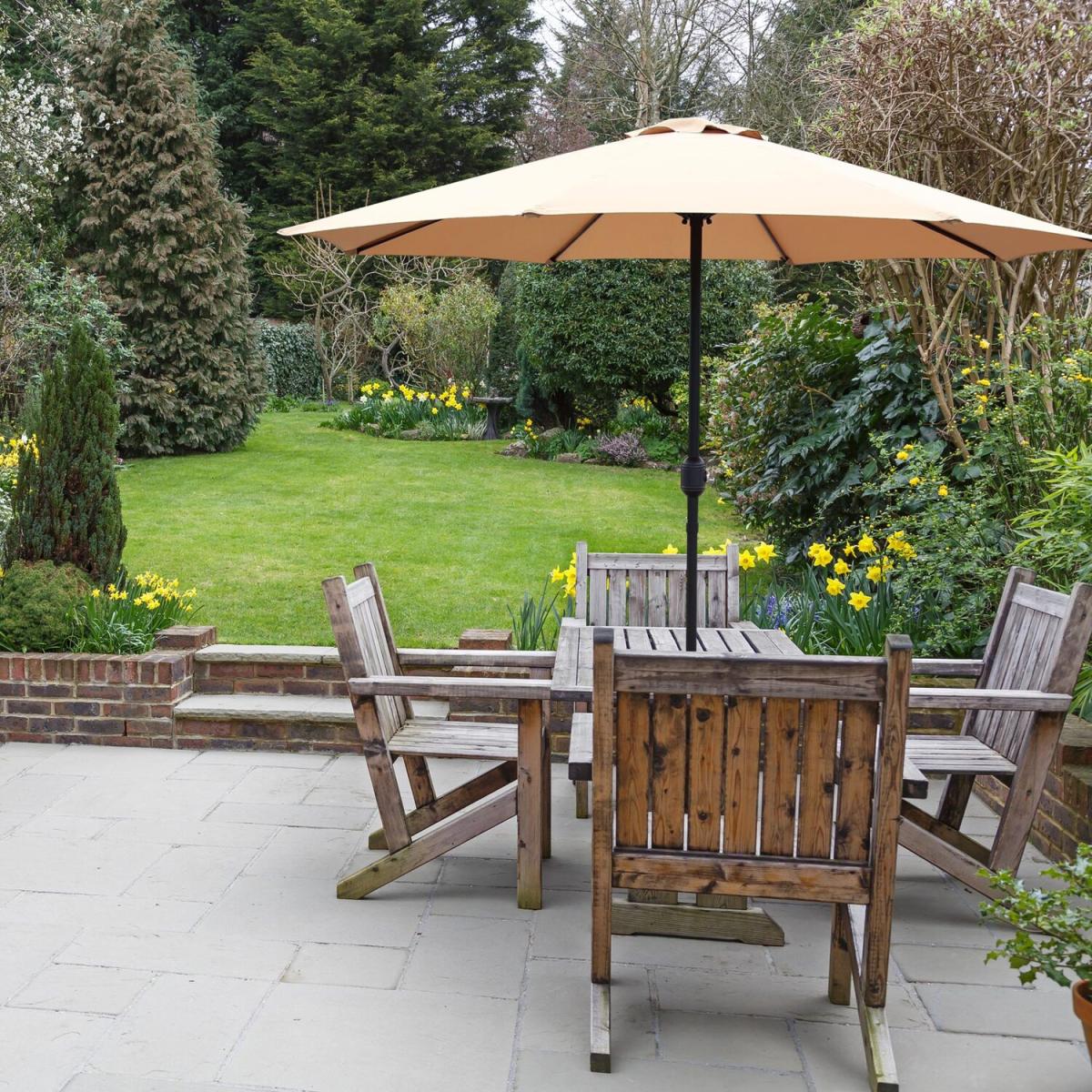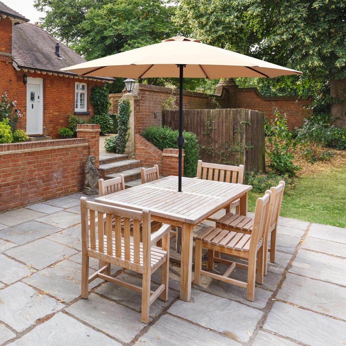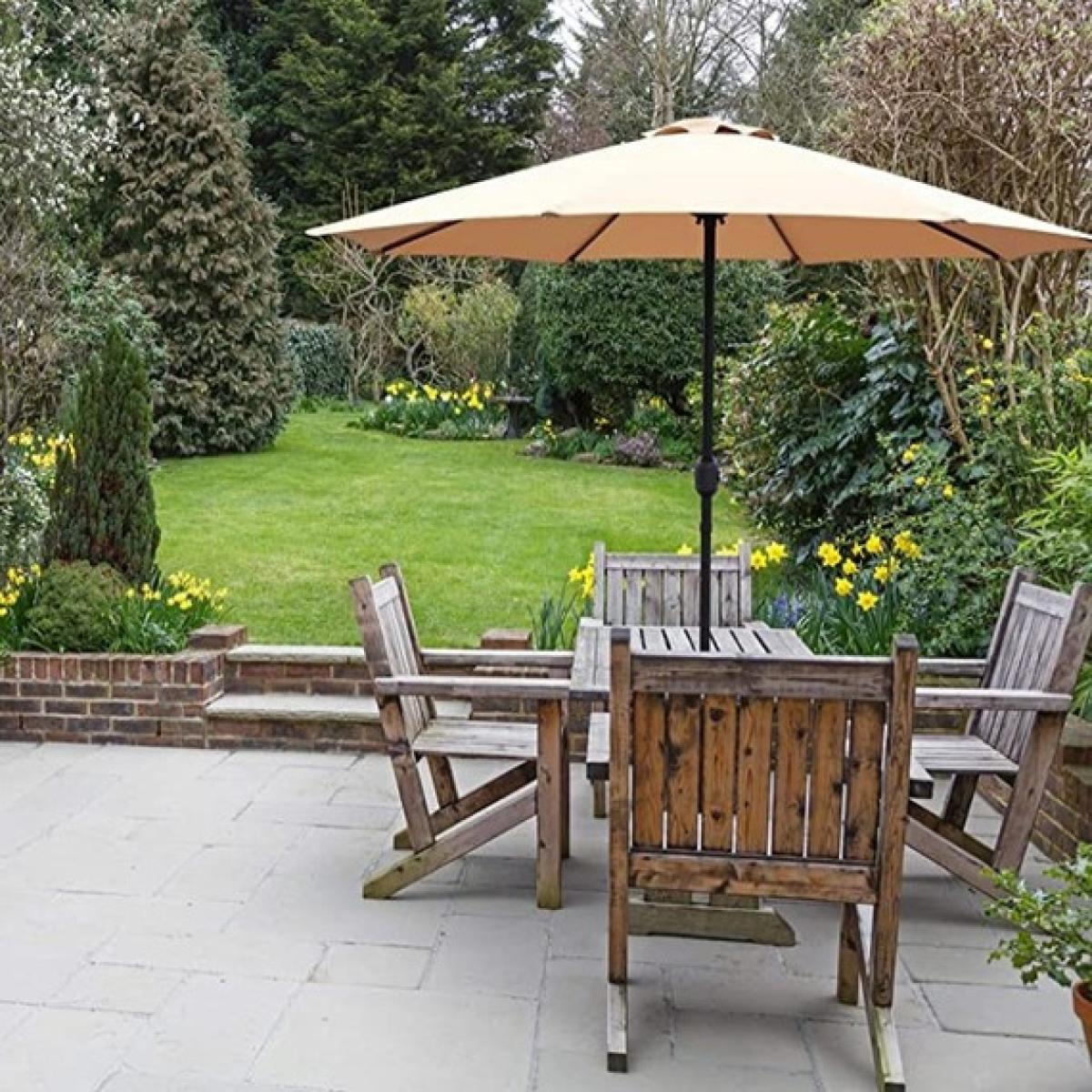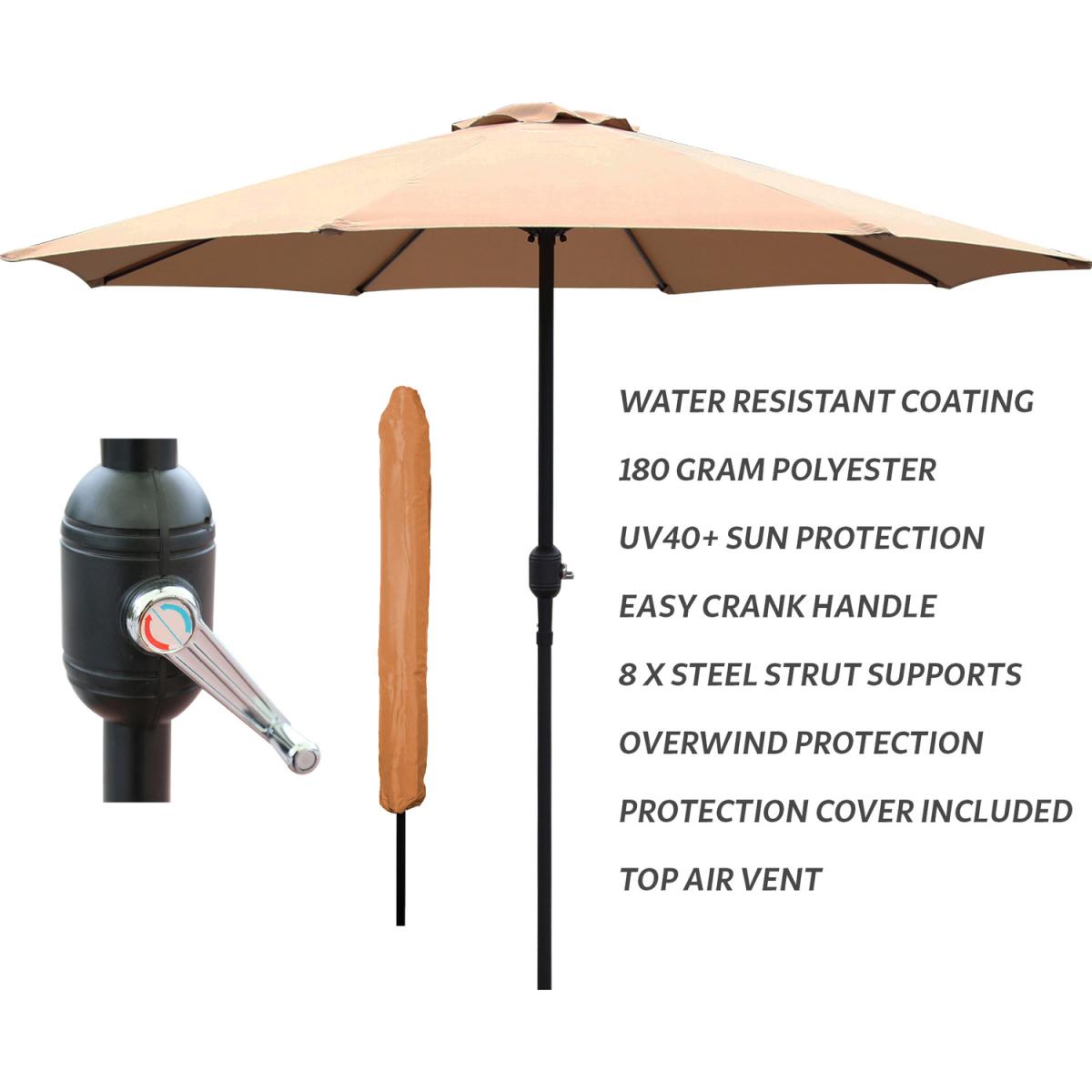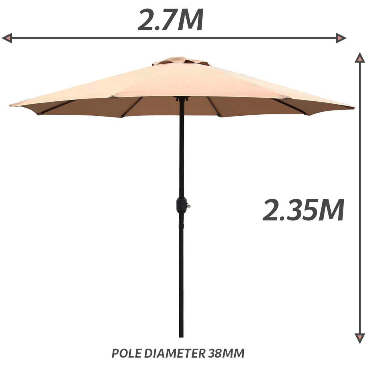 Bring a touch of class to your garden parties and BBQs with this elegant yet practical parasol. Enjoy stress-free sessions on your lawn, patio, or decking. Provides UV40 protection and comes supplied with an additional parasol protection cover. Despite its chic appearance, this parasol is incredibly tough and made from robust steel. It also features a hard-wearing fabric canopy that Is difficult to rip and offers UV 40 Protection, making this the perfect garden parasol that still carries with it a touch of class. It can be disassembled into compact parts and stored away almost anywhere. This means you can even take your parasol on a glamping trip in the caravan! Parasol dimensions: Height: 2.35 meters - Parasol Diameter open: 2.7m - Pole Diameter: 38mm - Parasol Colour: Sand + Protection Cover.