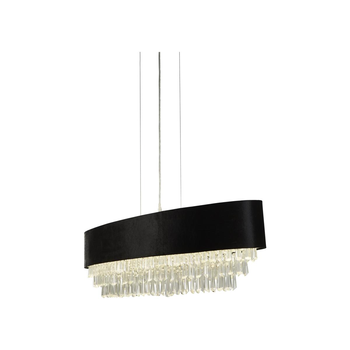 The Glamour 8 Light Oval Pendant is a captivating lighting fixture that adds a touch of sophistication to any bedroom, hallway, or living room. With a combination of black velvet, chrome and crystal droplets, it exudes modern elegance, creating a focal point in any home. Its oval design provides ample illumination, while the drum-style shade showcases a stunning pattern of clear crystals. Height adjustable, this pendant can be altered to fit any room it illuminates.