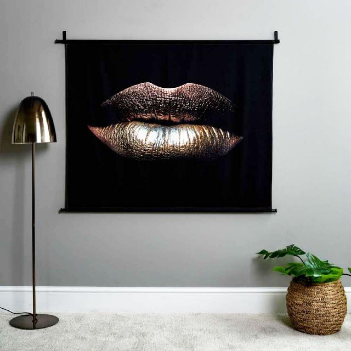 The Glamour Kiss Wall Hanging is a true statement wall hanging with swagger and a nod to the glam rock era. The wall hanging is made of a polyeter velvet fabric and is supported by two batons at the top and bottom. The hanging attaches to the wall via two simple hook brackets included.