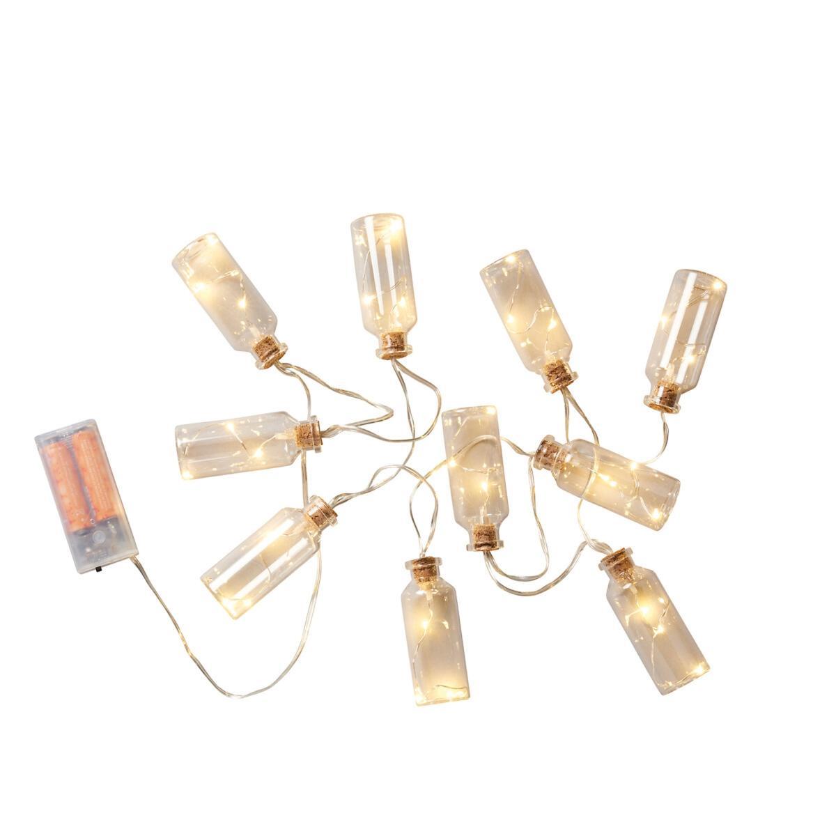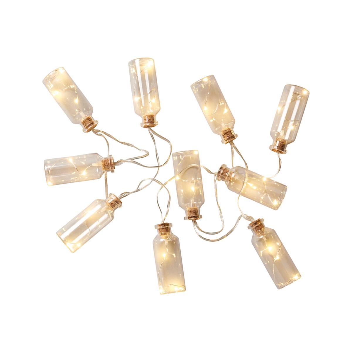 Indoor 10 pendant glass bottle and cork stopper string lights. Requires 2 x AA Batteries. Bulb Type: Integrated LED bulbs (non replaceable). This product will be dispatched by one of our trusted suppliers. You’ll be contacted by their selected courier about your delivery.