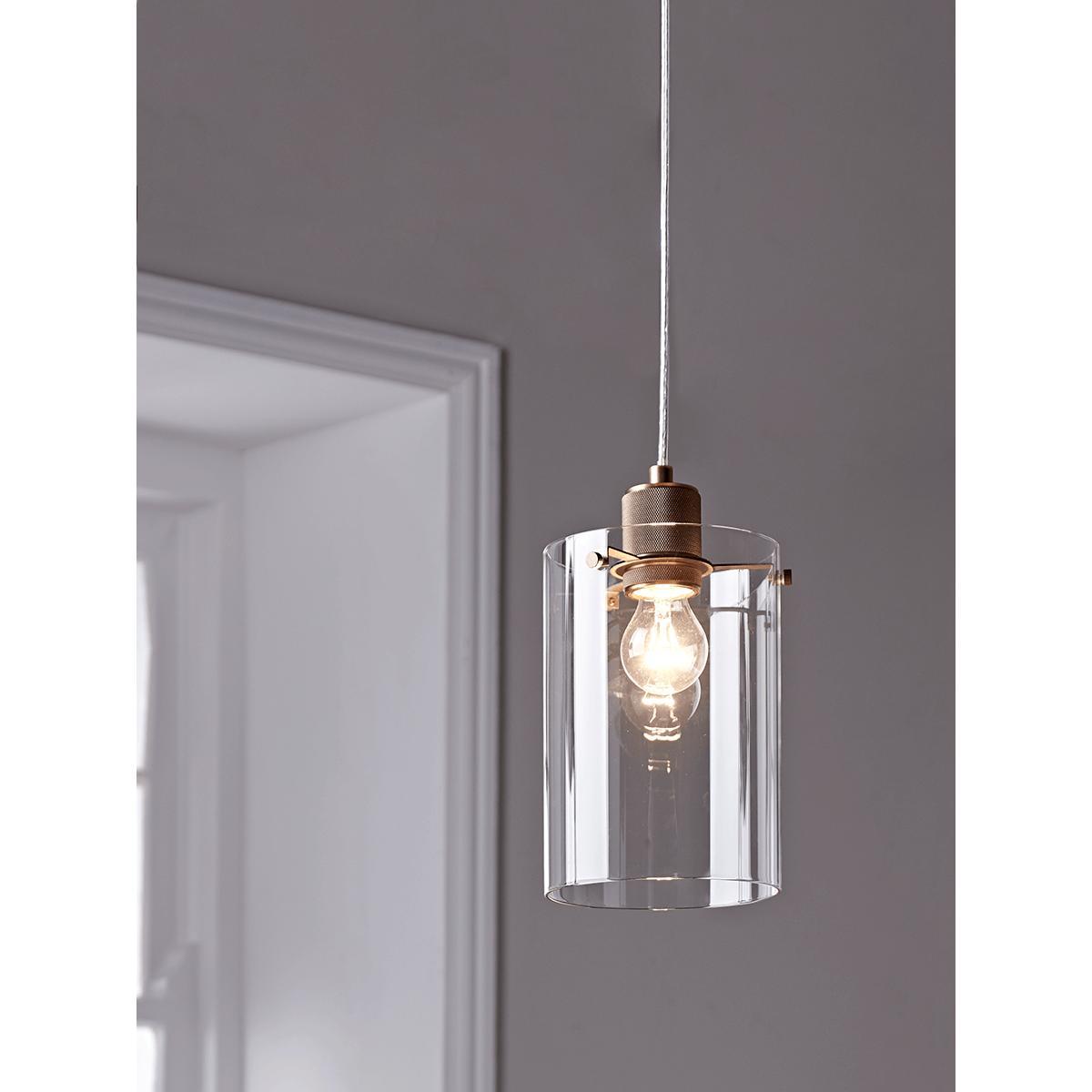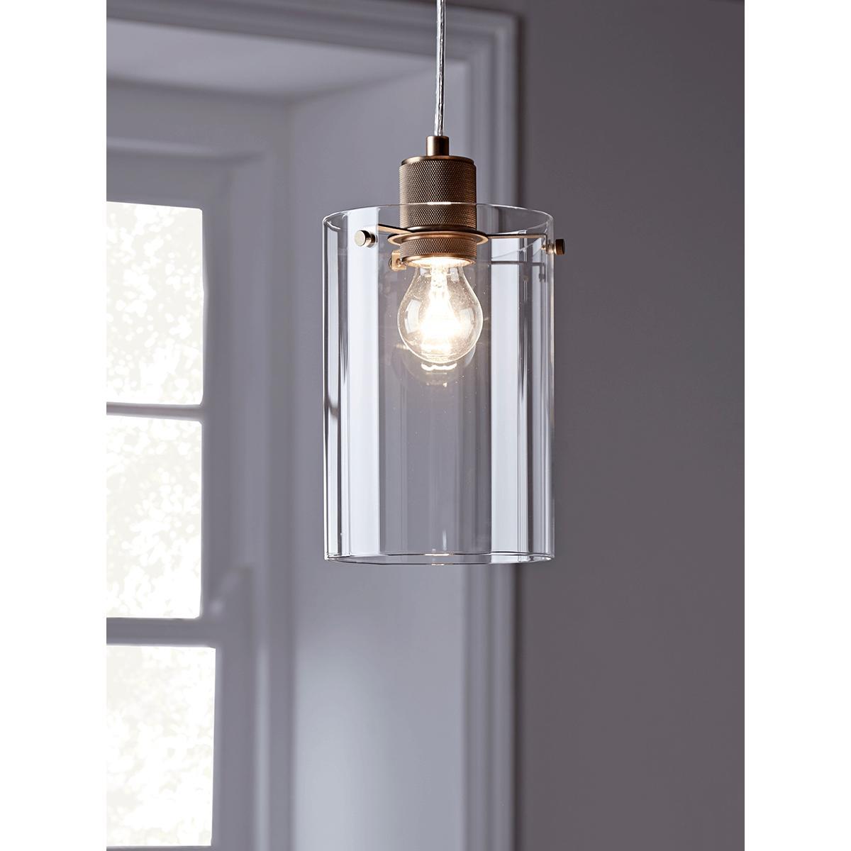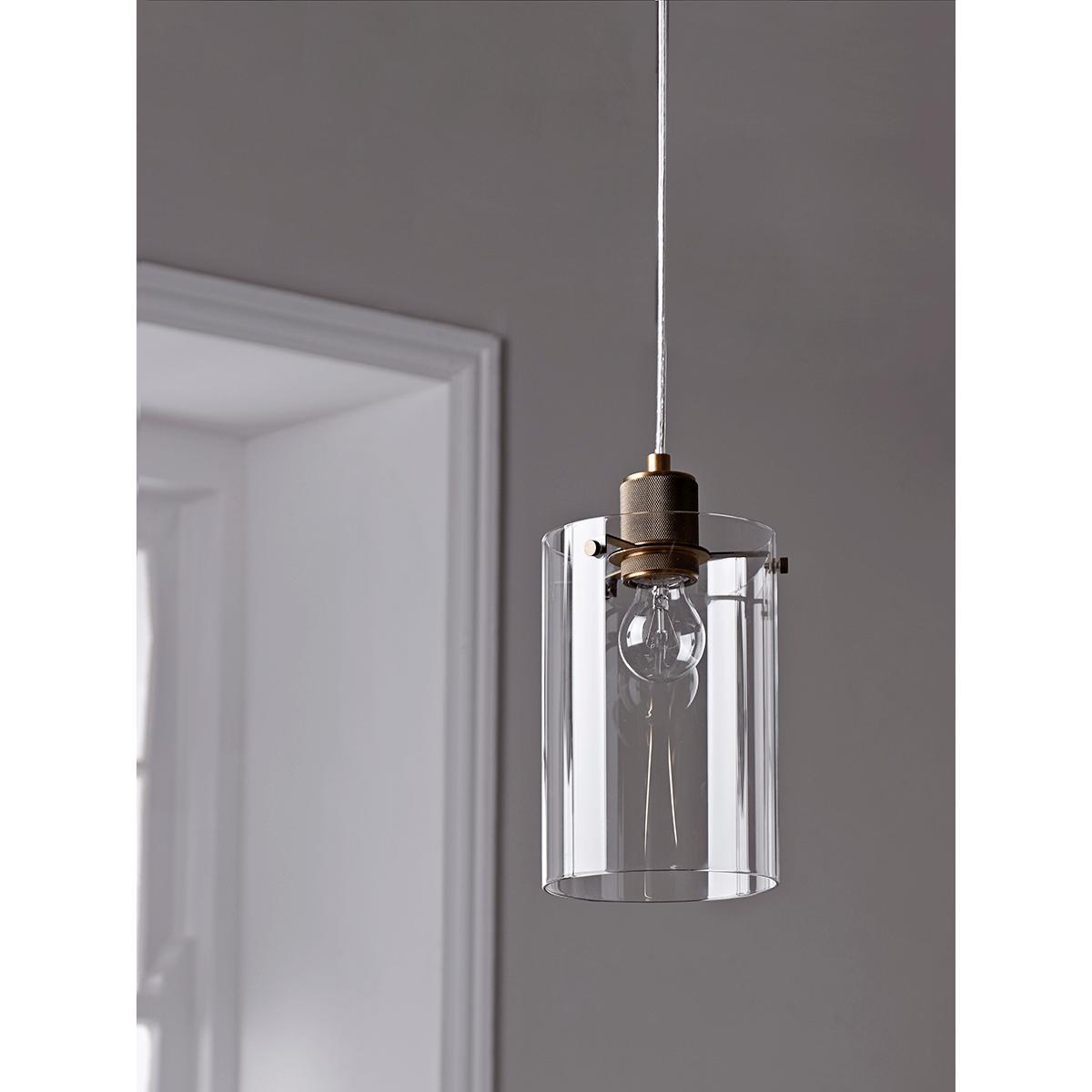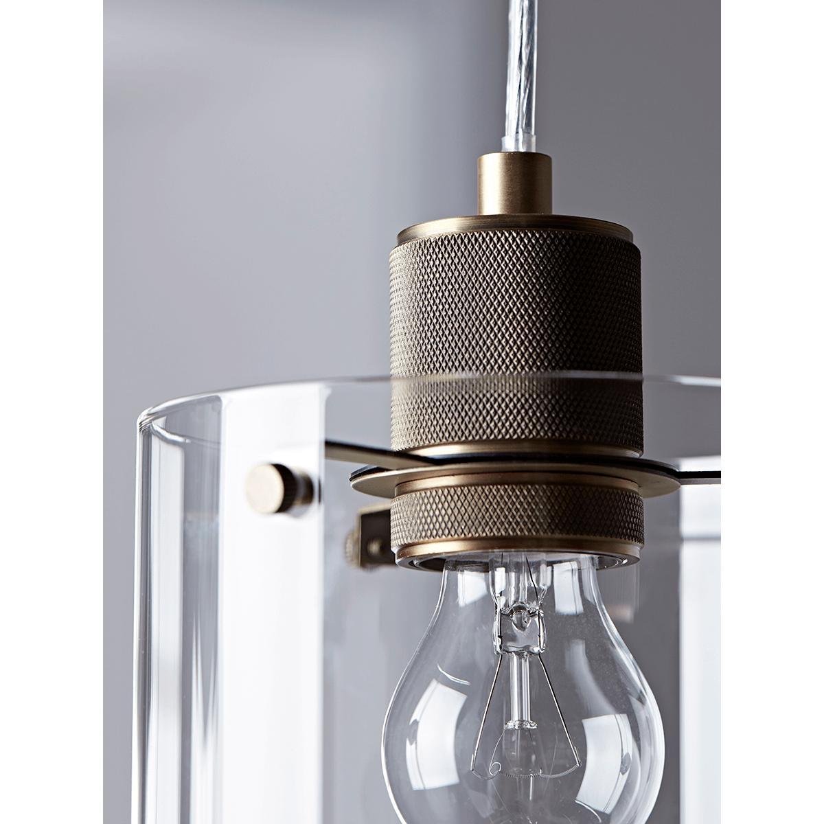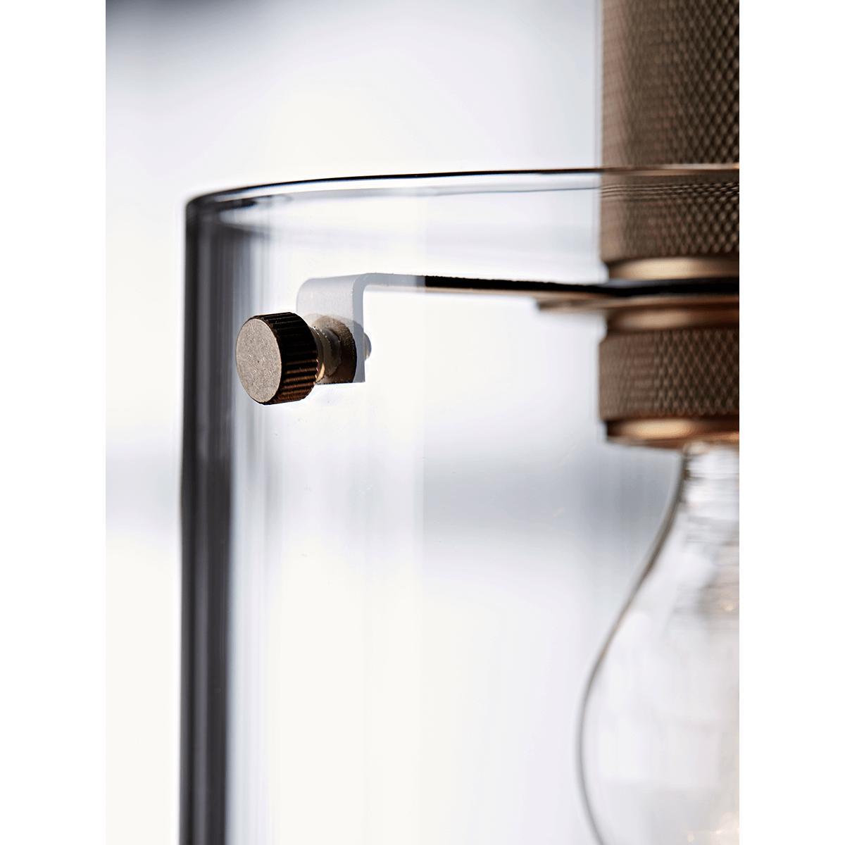 Consisting of a glass cylinder held by a feature embossed bronze-finished fitting, our statement pendant light hangs from a clear-coated wire to bring a contemporary, luxe feel to your interior. Crafted from antique bronze metal and clear glass, it will transform the look of your lighting.