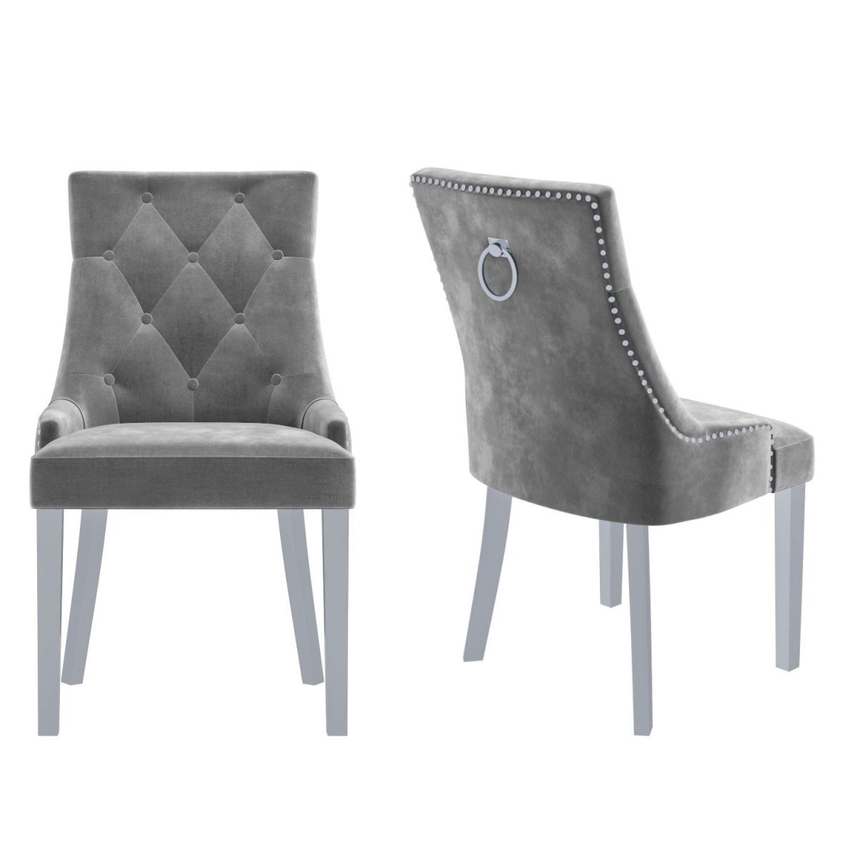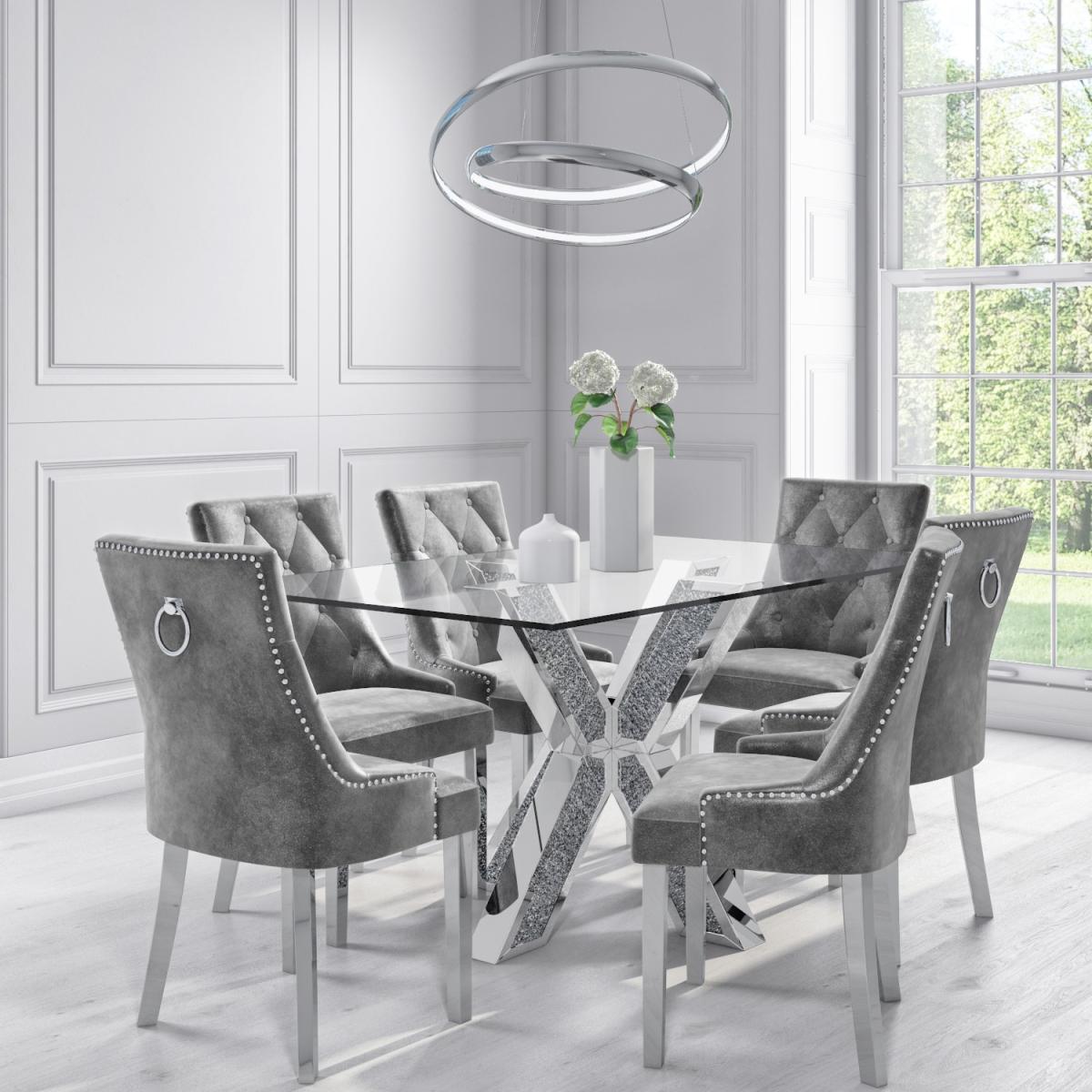 . This bundle includes. 1 x Jade dining table. 6 x Jade grey velvet chairs Features we love Glass top dining table with statement legs. Includes 6 grey velvet studded dining chairs. Comfortably seat six guests around the table. Mirrored table legs with a crushed diamond inlay. The perfect statement piece for your dining room Need to know. Dining Table Information. Dimensions. W150 x D90 x H77.5 cm Seats. 6 Colour. Silver Finish. Tempered glass table top Material. Silver mirror and MDF Assembly required. Yes Range. Jade Boutique Dining Chair Information. Number of chairs. 6 Dimensions. H92cm x W56 x D64cm Colour. Grey Finish. Stainless legs Material. Solid rubberwood stainless steel and velvet Assembly required. Yes Range. Jade Boutique.