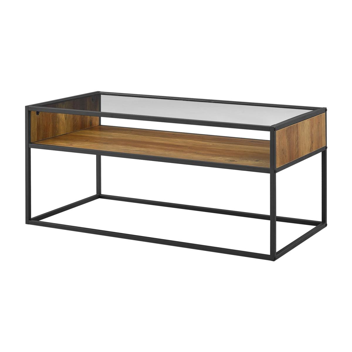 Dimensions H46 x W102 x D51 cm. If you are looking for a daring and classic piece to add to your living room this mixed material coffee table is the perfect rustic accent to take your home to a new level. With a black metal frame beautiful high-grade manufactured wood shelf and tempered glass top you can be sure that this centre piece will be the focal point of your room. Features. Rustic oak effect coffee table Urban industrial style Geometric metal frame. Tempered glass table top Perfect addition to your living room Assembly required..