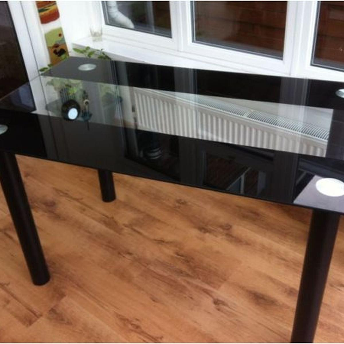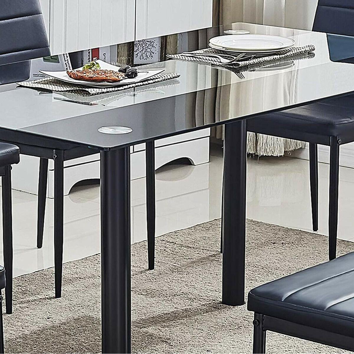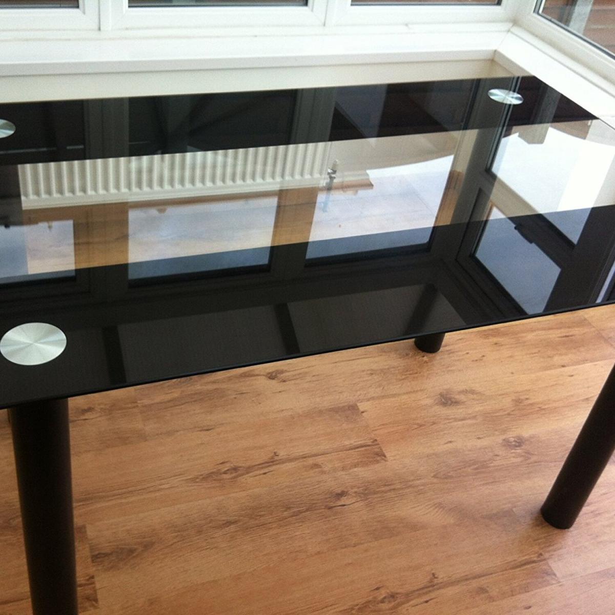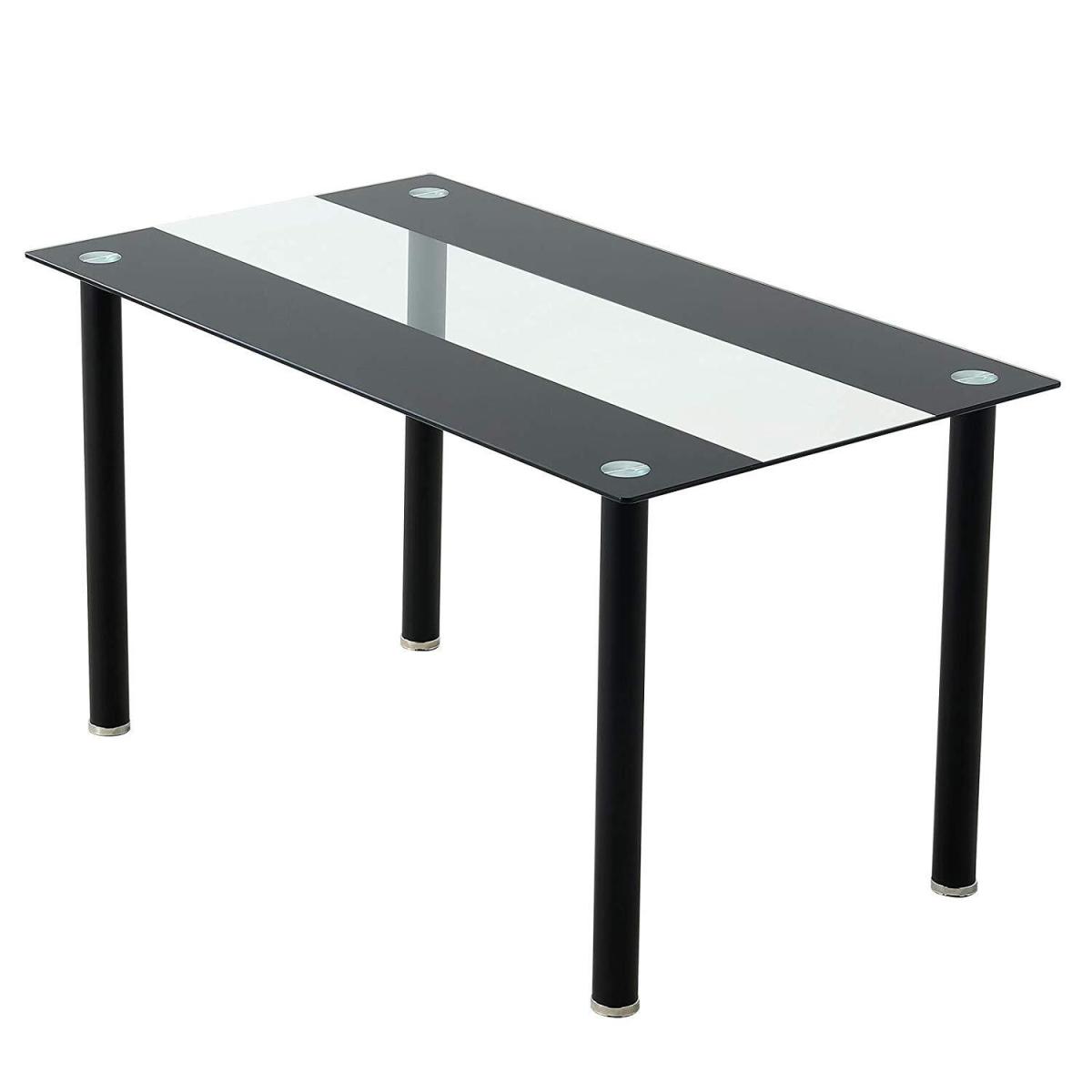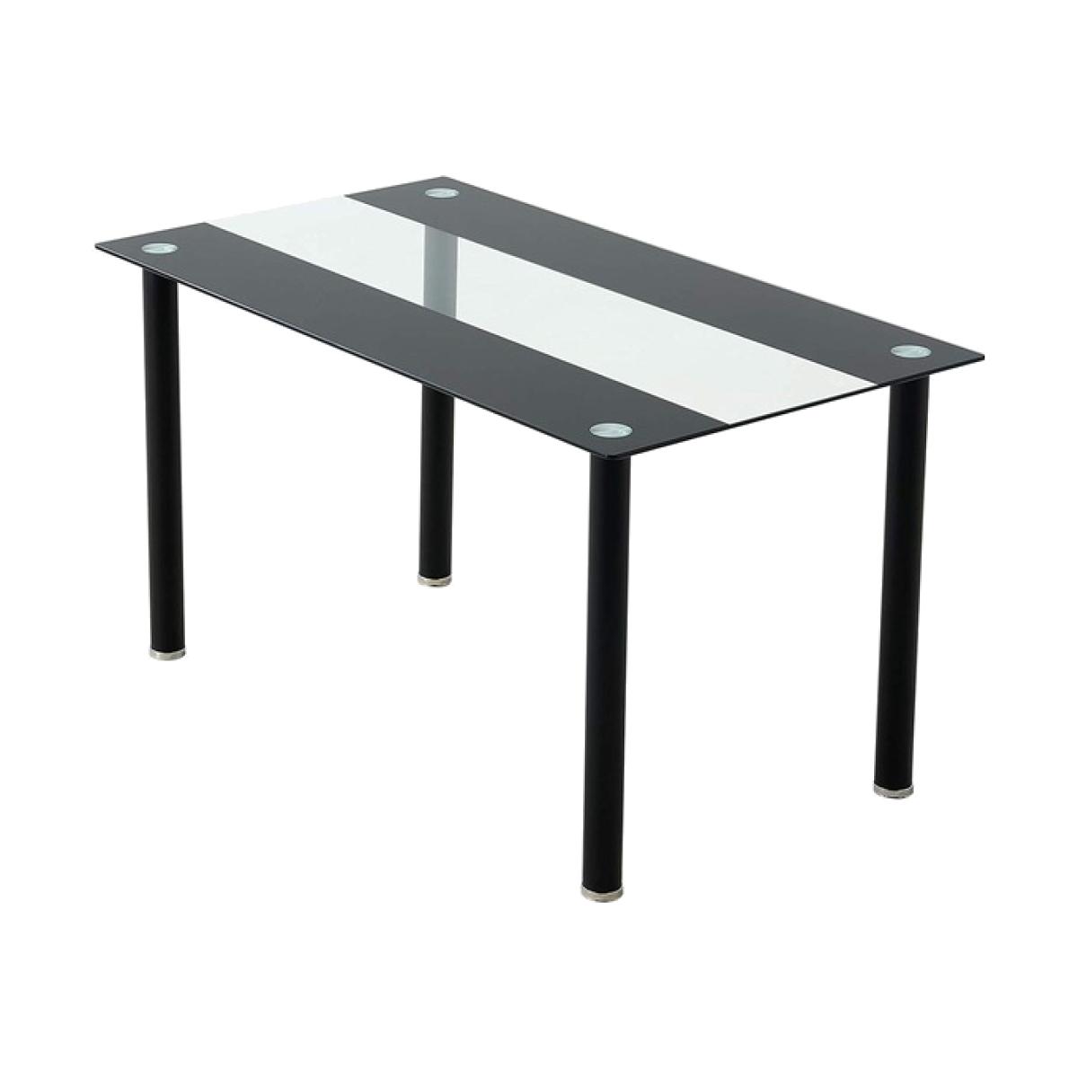 A stunning glass dining table only (Chairs not included). Table with 2 black stripes and clear centre. Safety tempered glass dining table top is 8mm thick and up to four times stronger than regular glass. Add elegance to your home kitchen and dining room. Glass top dining table set is constructed of rust-resistant. All accessories and instruction are included. The 1-year warranty will replace any faulty or broken part during your use of the table.
