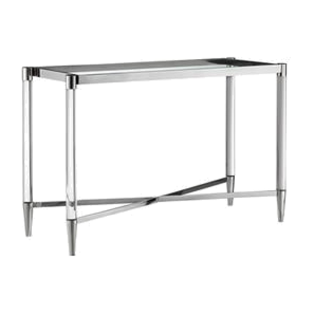 Dimensions W120 x H76.2 x D42 cm. The Marissa is a luxe occasional collection - the sleek contemporary design features polished metal frames tempered glass tops and acrylic legs finished in silver. Features. Silver coloured accents. Rectangular glass table tops. Acrylic legs and polished metal frames. The perfect living room addition. Matching items available in the Marissa range. Assembly required..