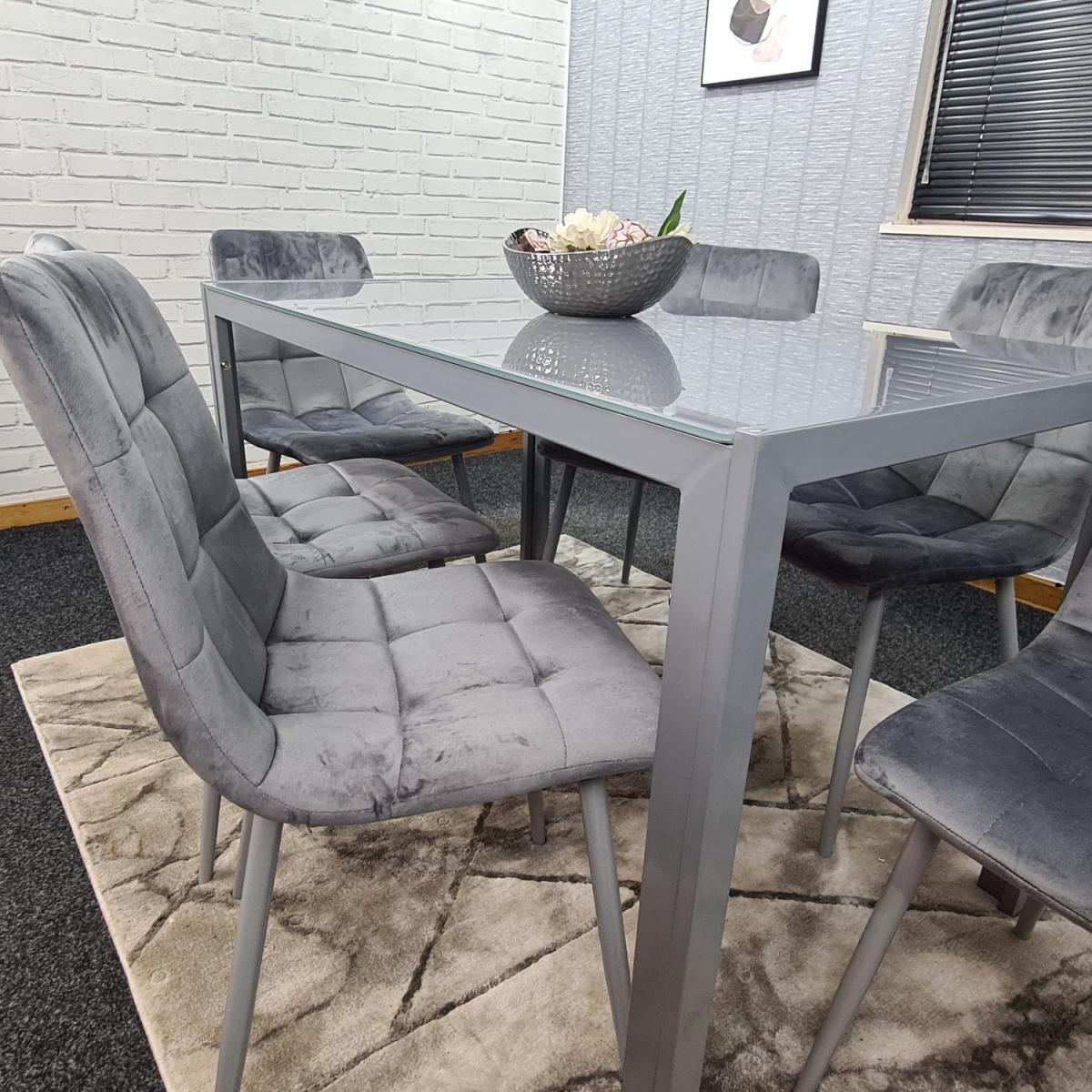 Glass Dining Table and 4 Grey Velvet Chairs Dining Set - Grey