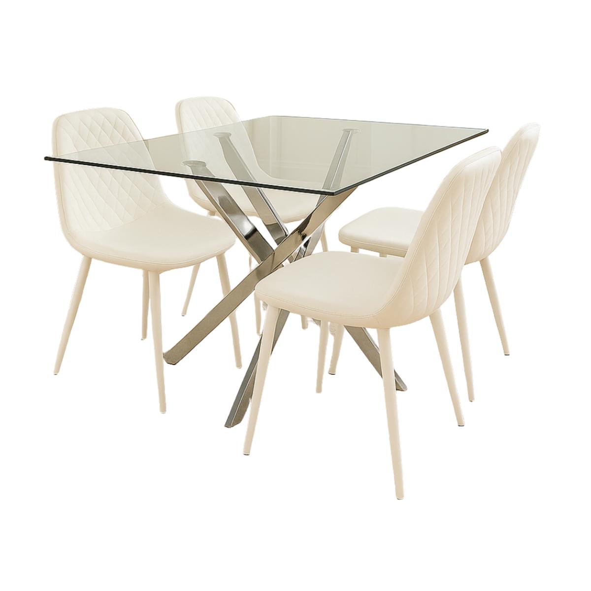 This elegant clear glass rectangular dining table set adds a modern and stylish touch to any dining space. The sleek glass top is supported by chic chrome legs, while the four black leather chairs offer both comfort and sophistication. Perfect for family meals or entertaining guests, this set combines style, practicality, and durability. Features Clear glass rectangular tabletop with a modern, minimalist look. Chic chrome legs for a sleek and contemporary finish. Four white leather chairs with a clean, elegant design. Rubber-capped legs to protect floors from scratches. Easy to assemble with all parts and instructions includedDimensions. Table 120 cm (L) x 70 cm (W) x 75 cm (H)Chair 87 cm (H) x 59 cm (L) x 44 cm (W)Seat height 45 cm