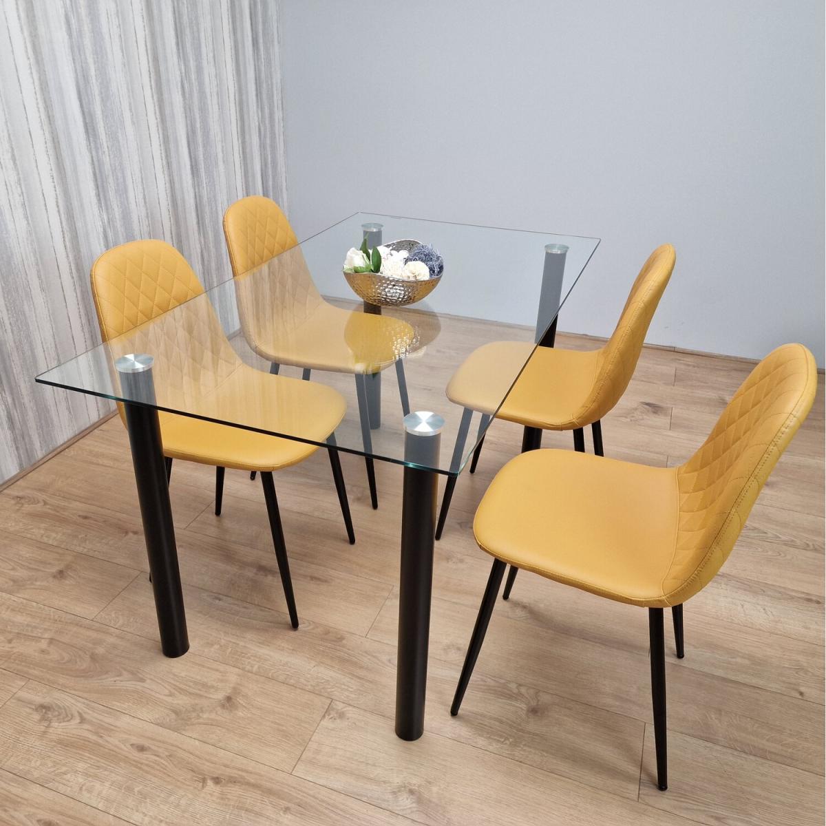 A Stunning clear tempered glass Dining Table set includes set of 4 faux leather diamond stitching mustard coloured metal chairs. The dining table glass colour is clear with black finished metal legs. The dining chairs colour is mustard with black metal legs and slightly curved back design to fit with body shape. The dinner table is crafted with tempered glass with stunning black finished metal legs to ensure a durable, long-lasting tabletop. The dining chairs are made of premium faux leather with metal chair legs. Dining table is available in 2 sizes. The seat height of the chair is 44 cm. Clear instructions for our dining table set support straight-forward assembly.
